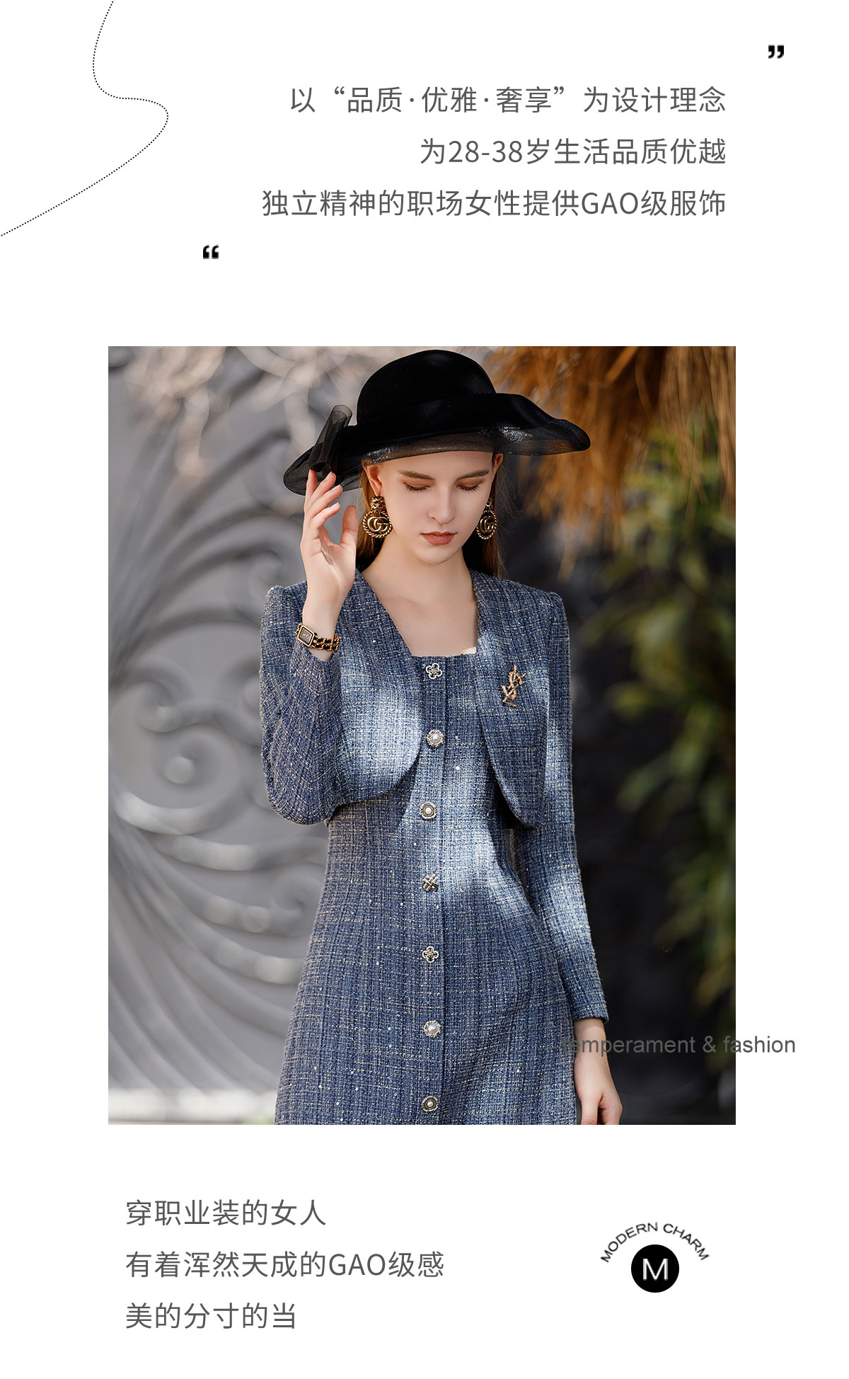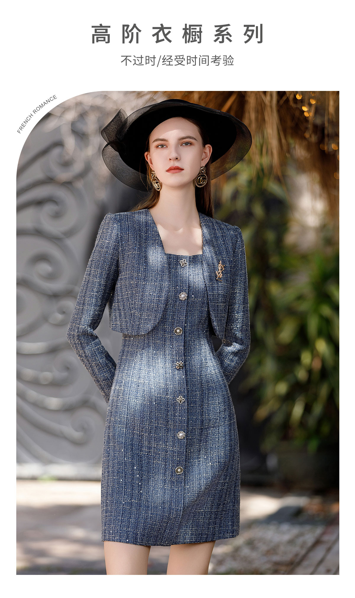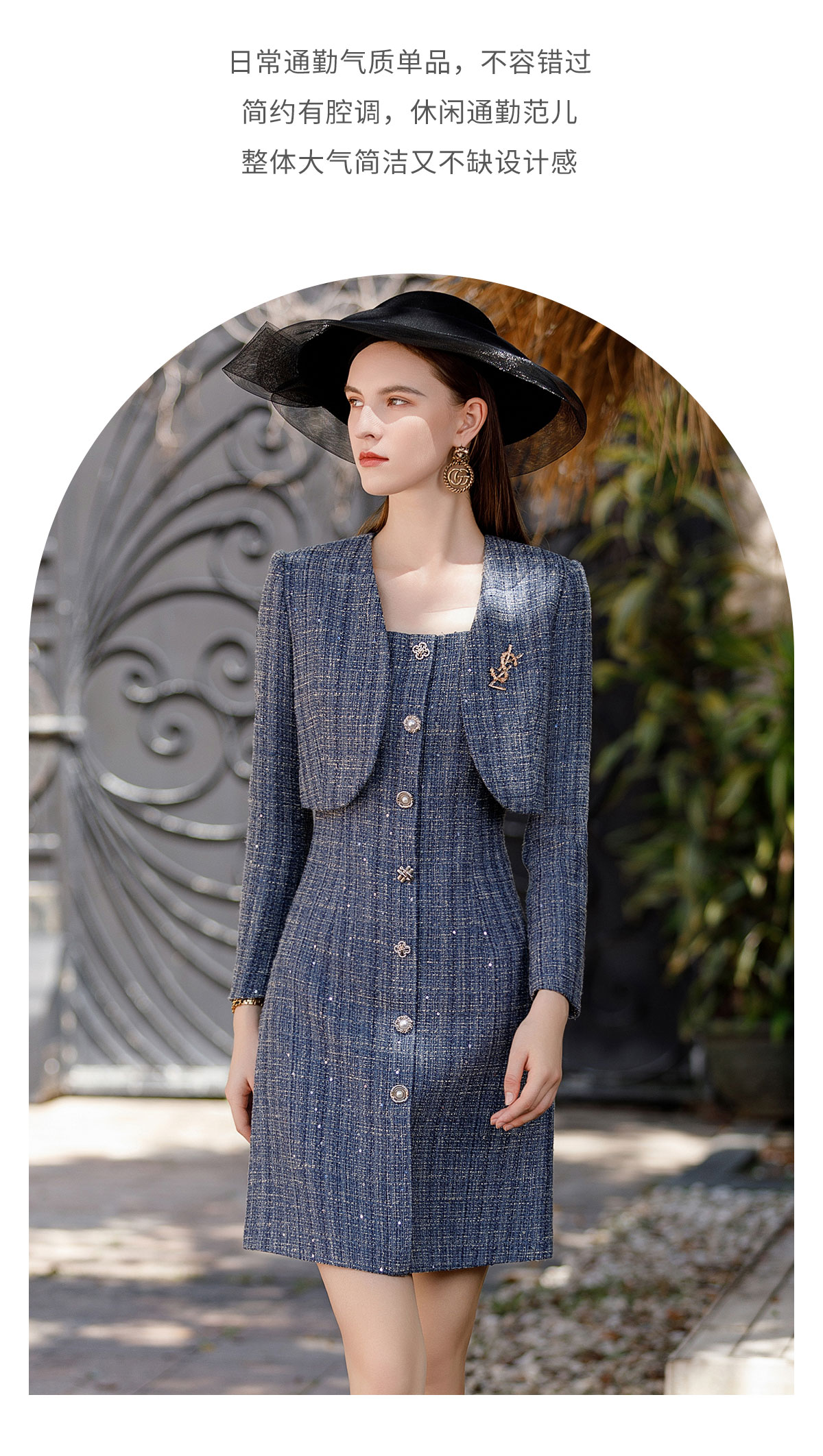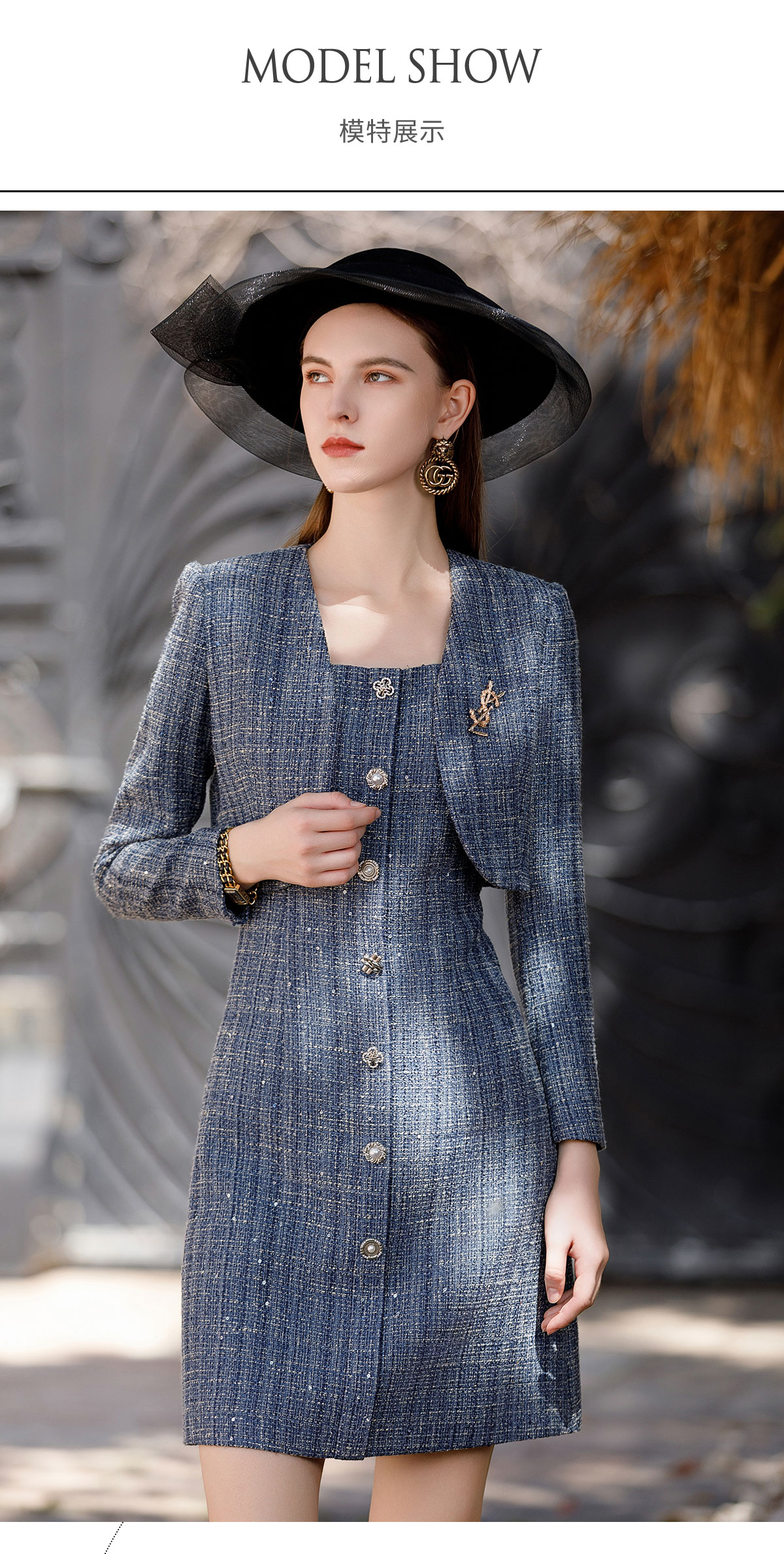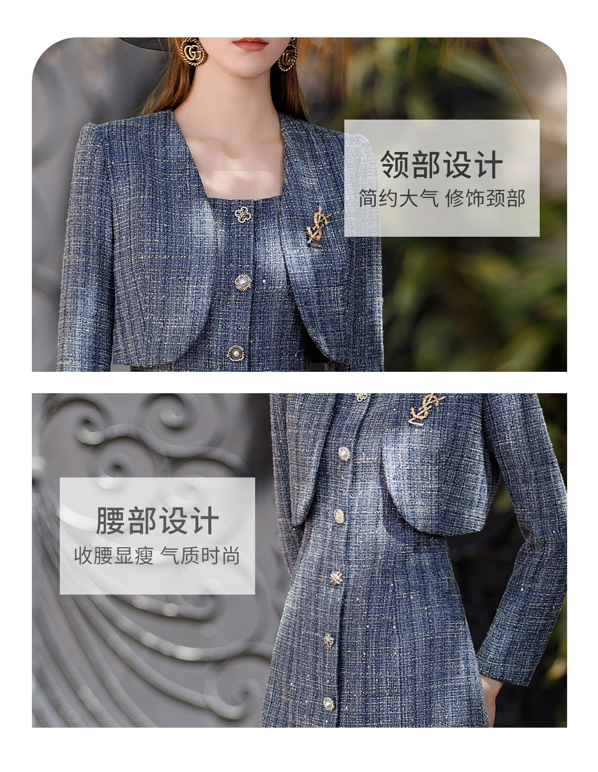 AD时尚牛仔蓝色截短廓形小西服外套2023高级感轻奢名媛小香风套装