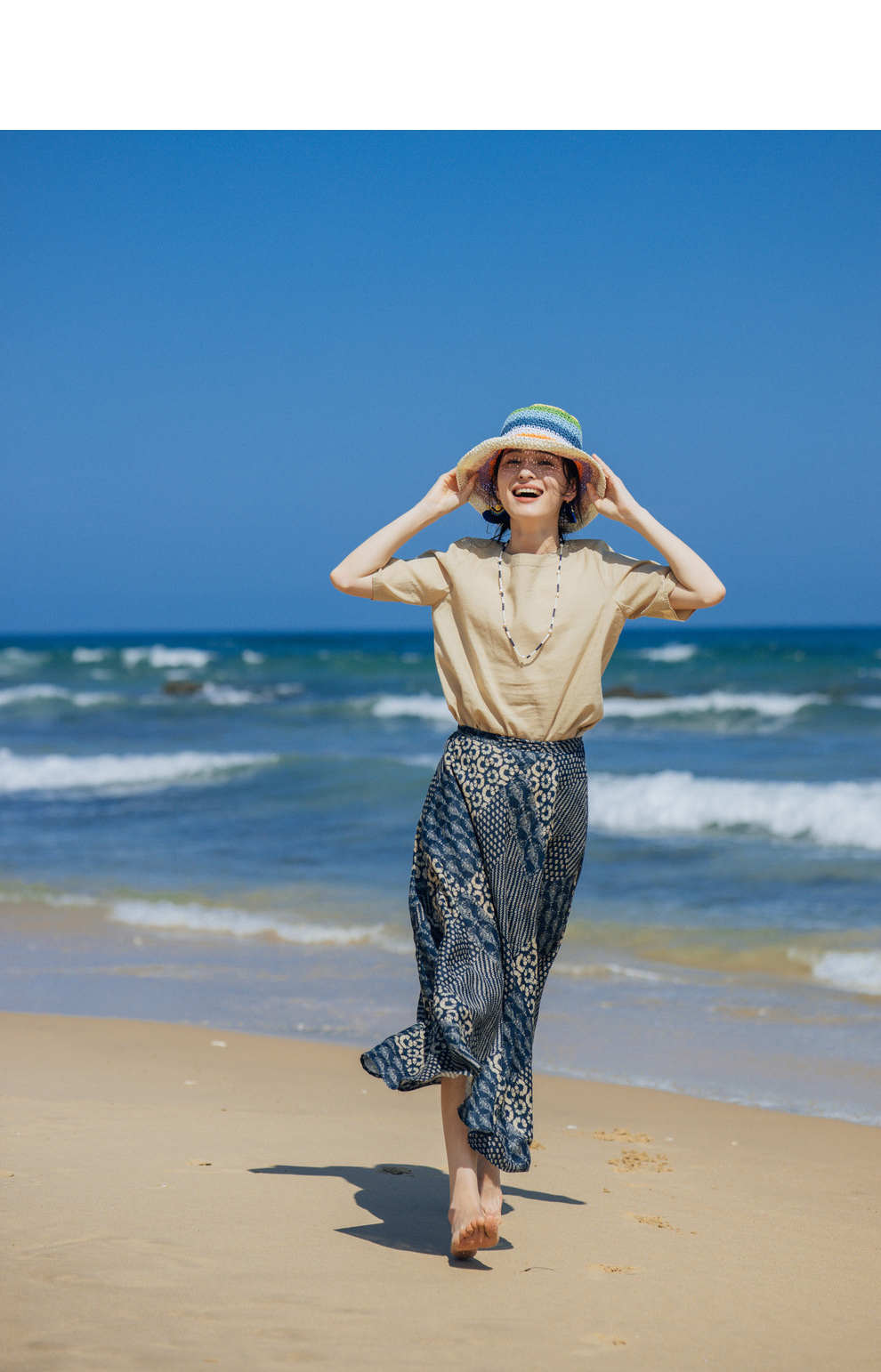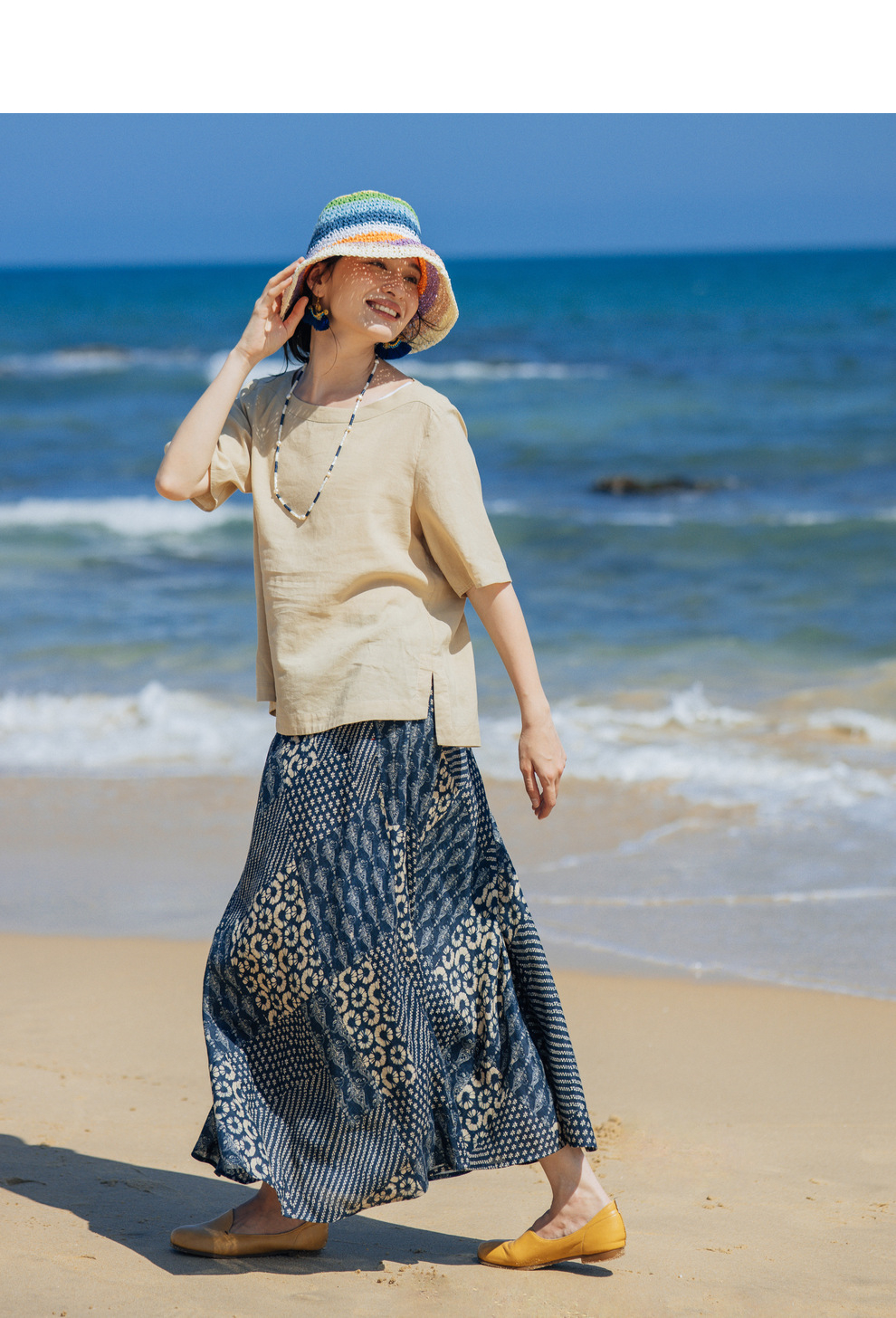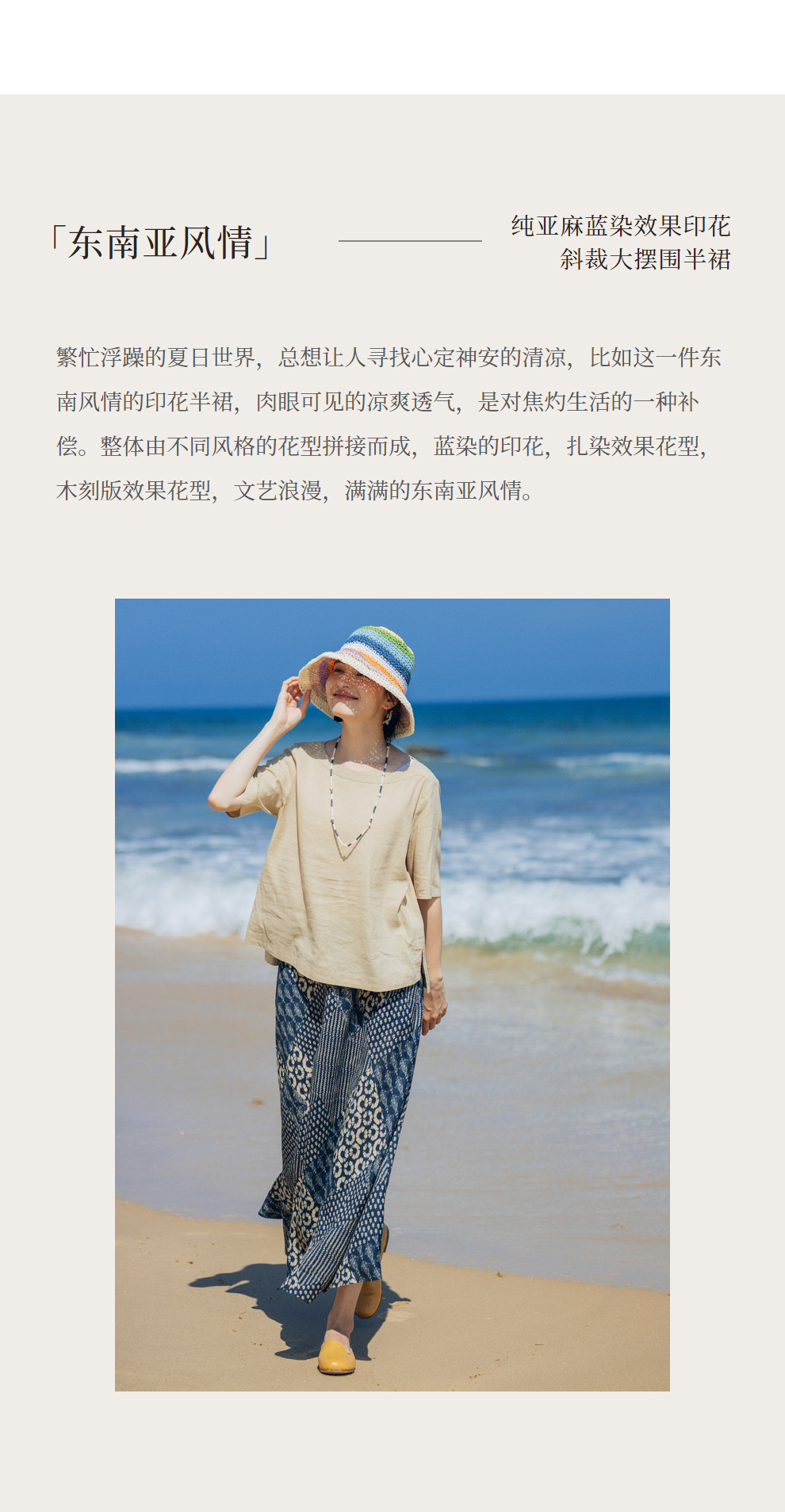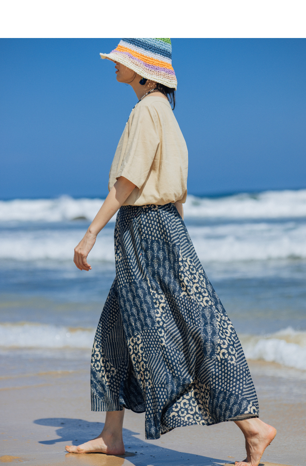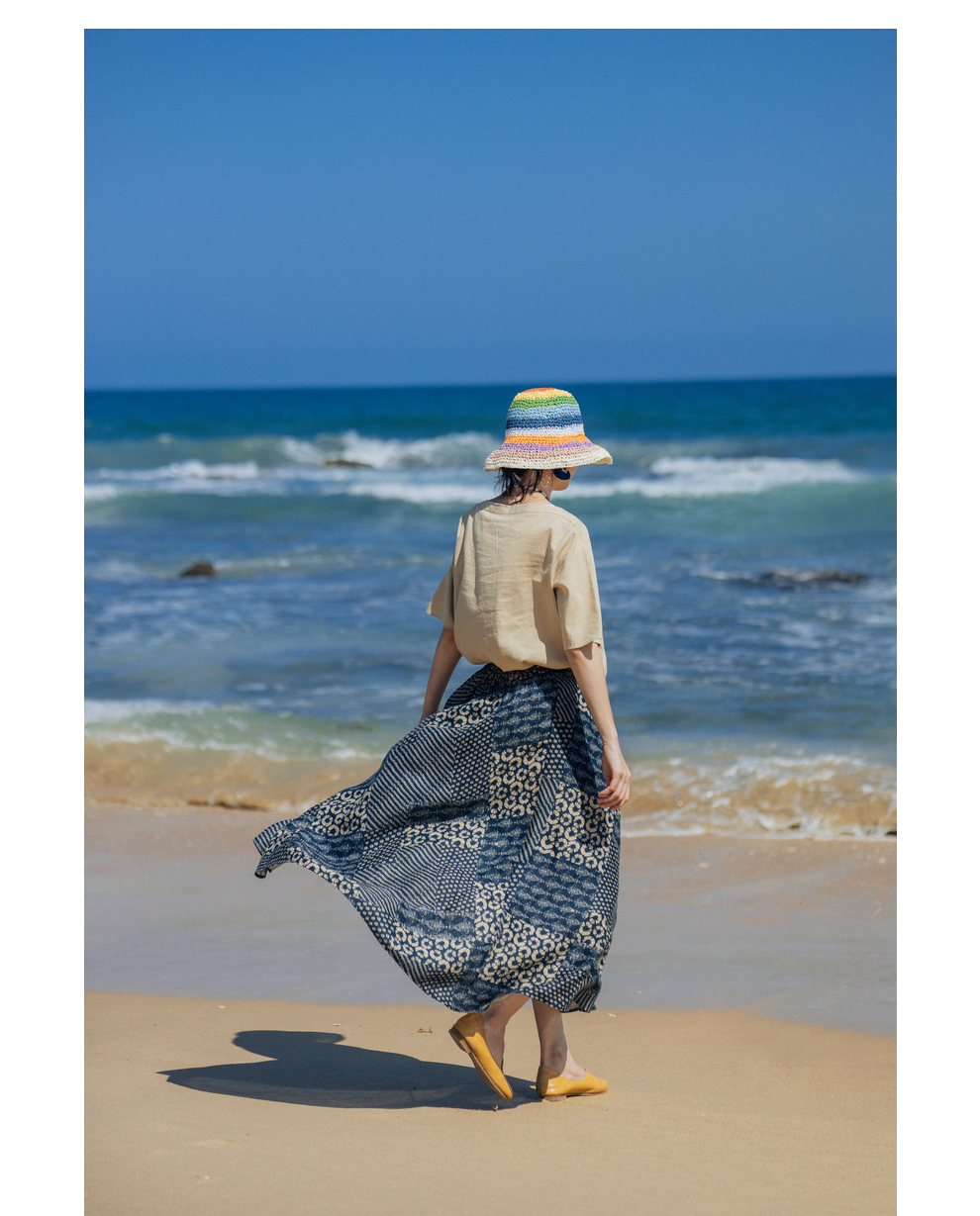 绽放旅行女装339朵/蓝染印花亚麻复古文艺半裙清凉透气海边度假裙