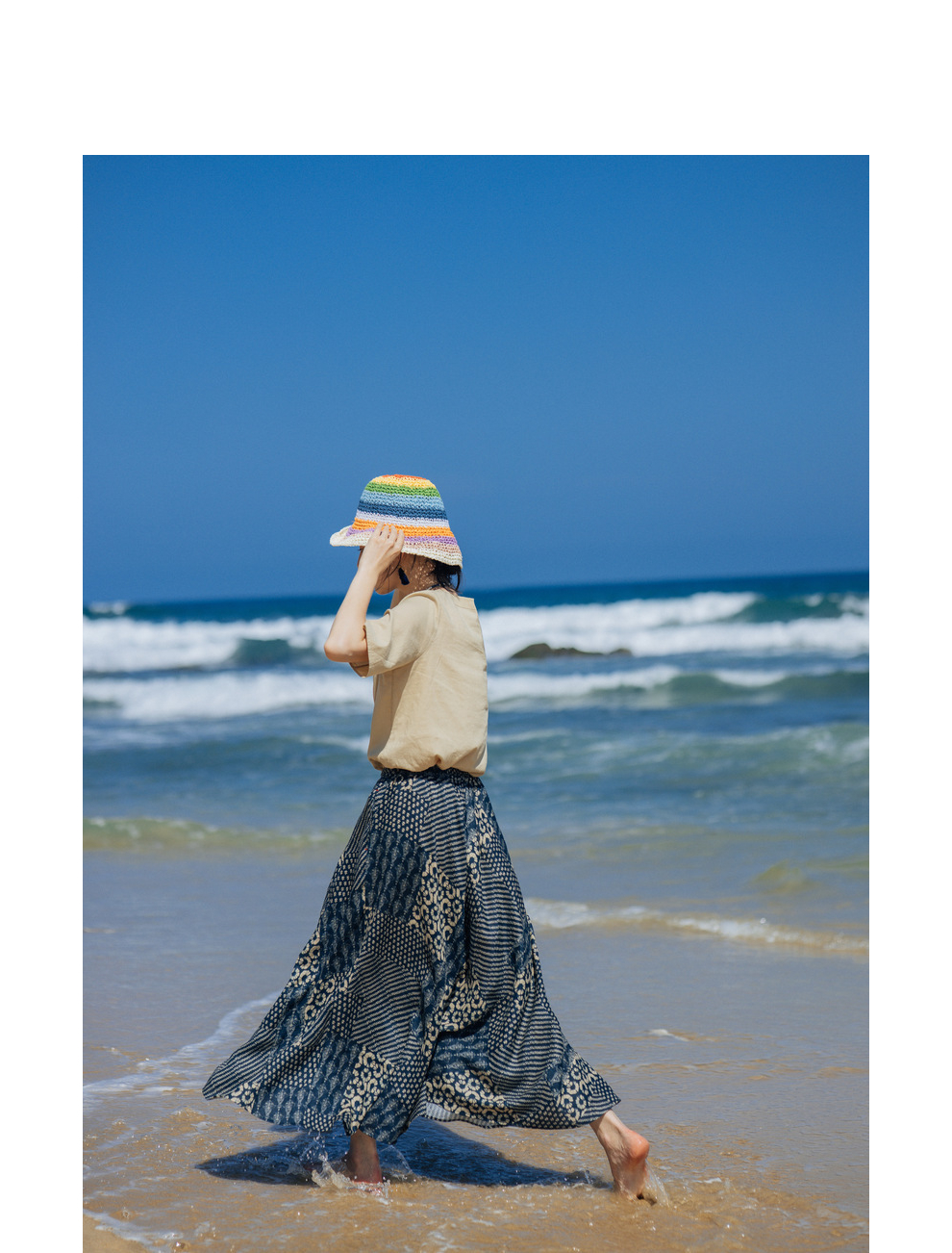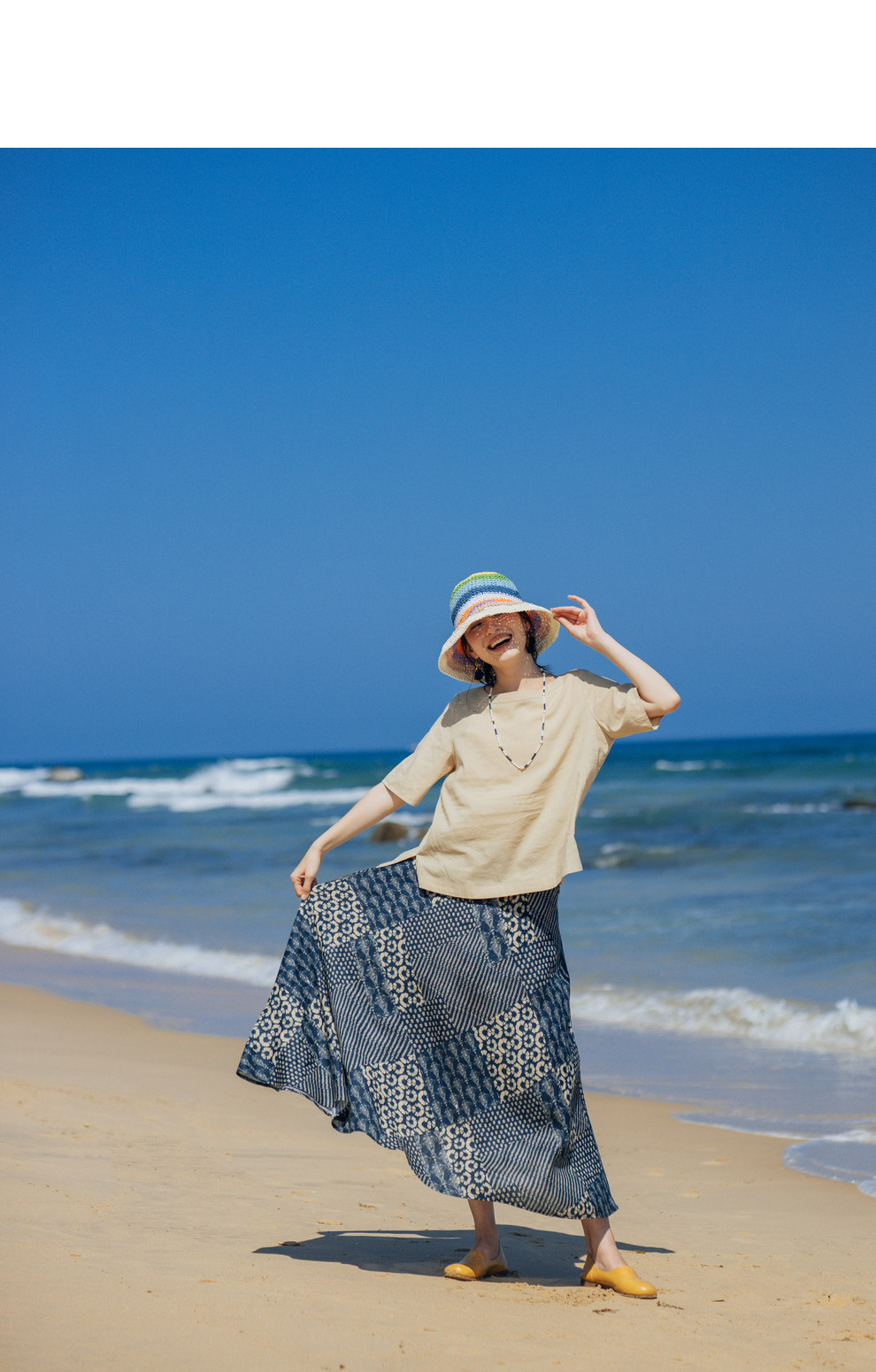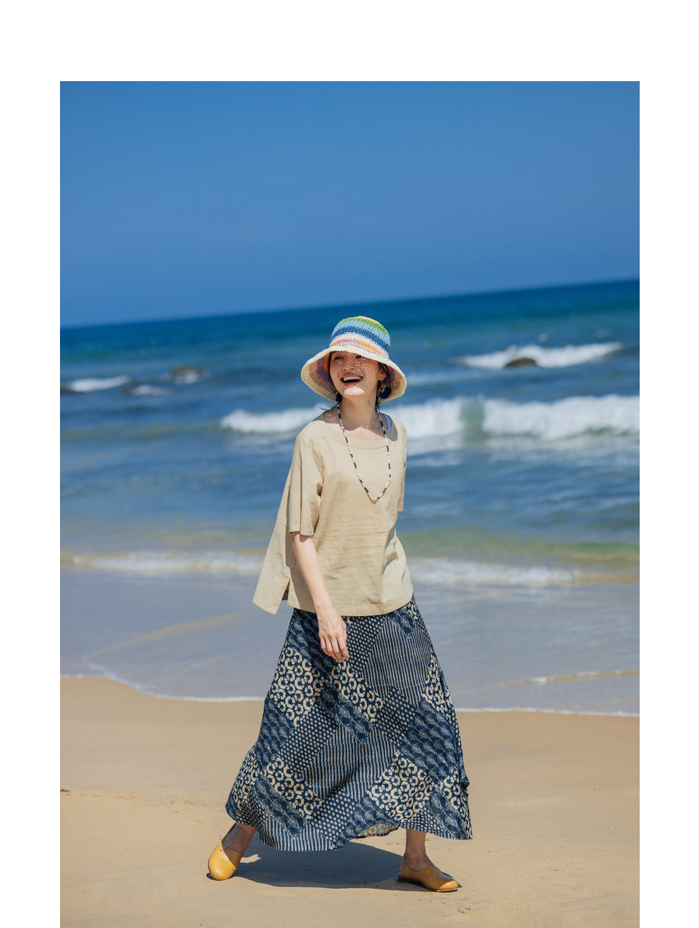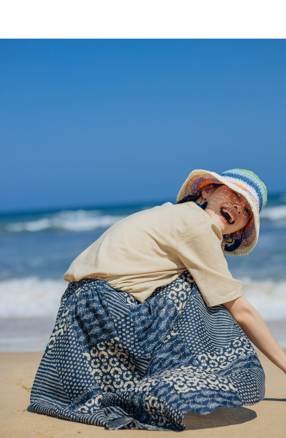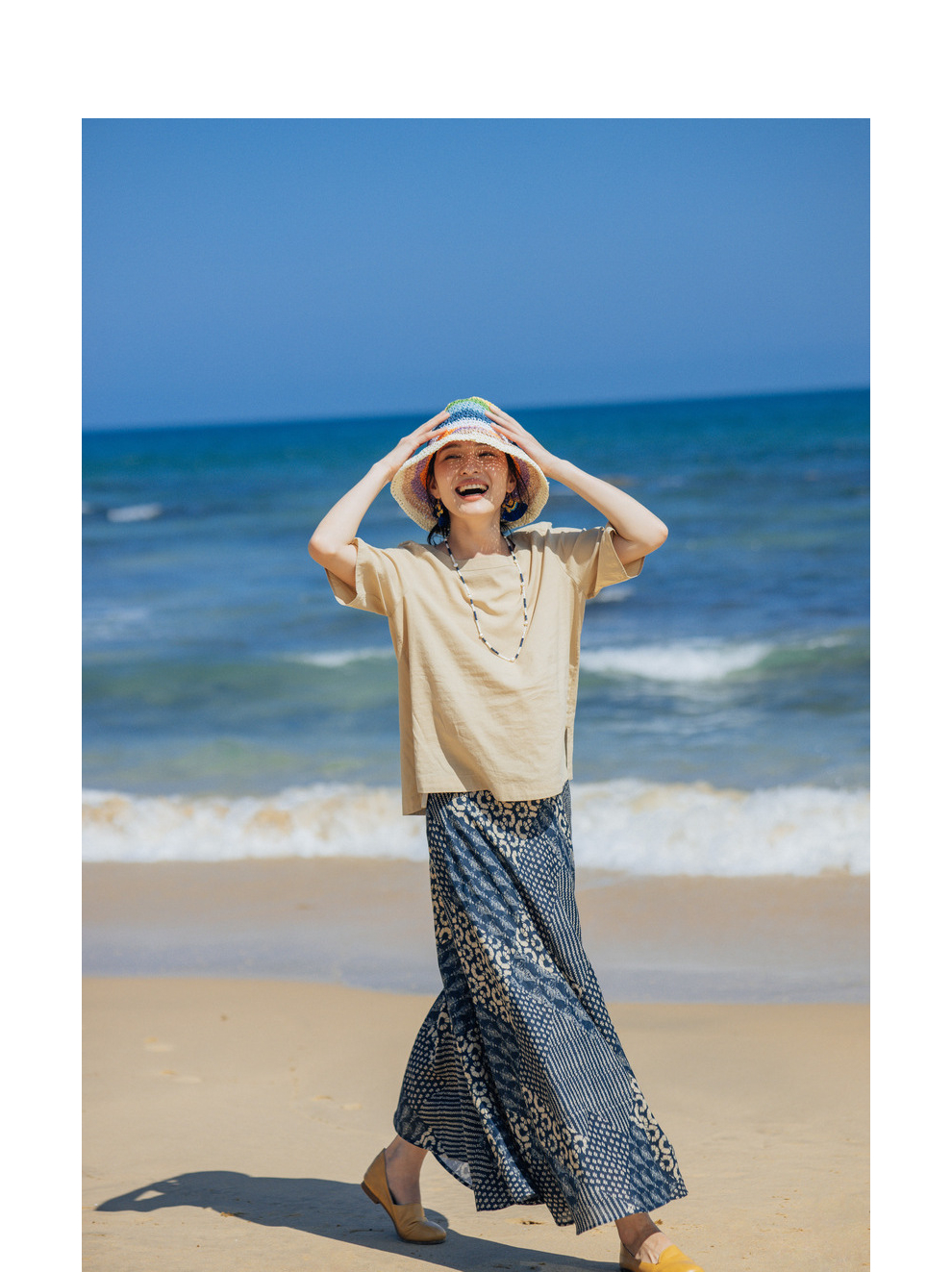 绽放旅行女装339朵/蓝染印花亚麻复古文艺半裙清凉透气海边度假裙