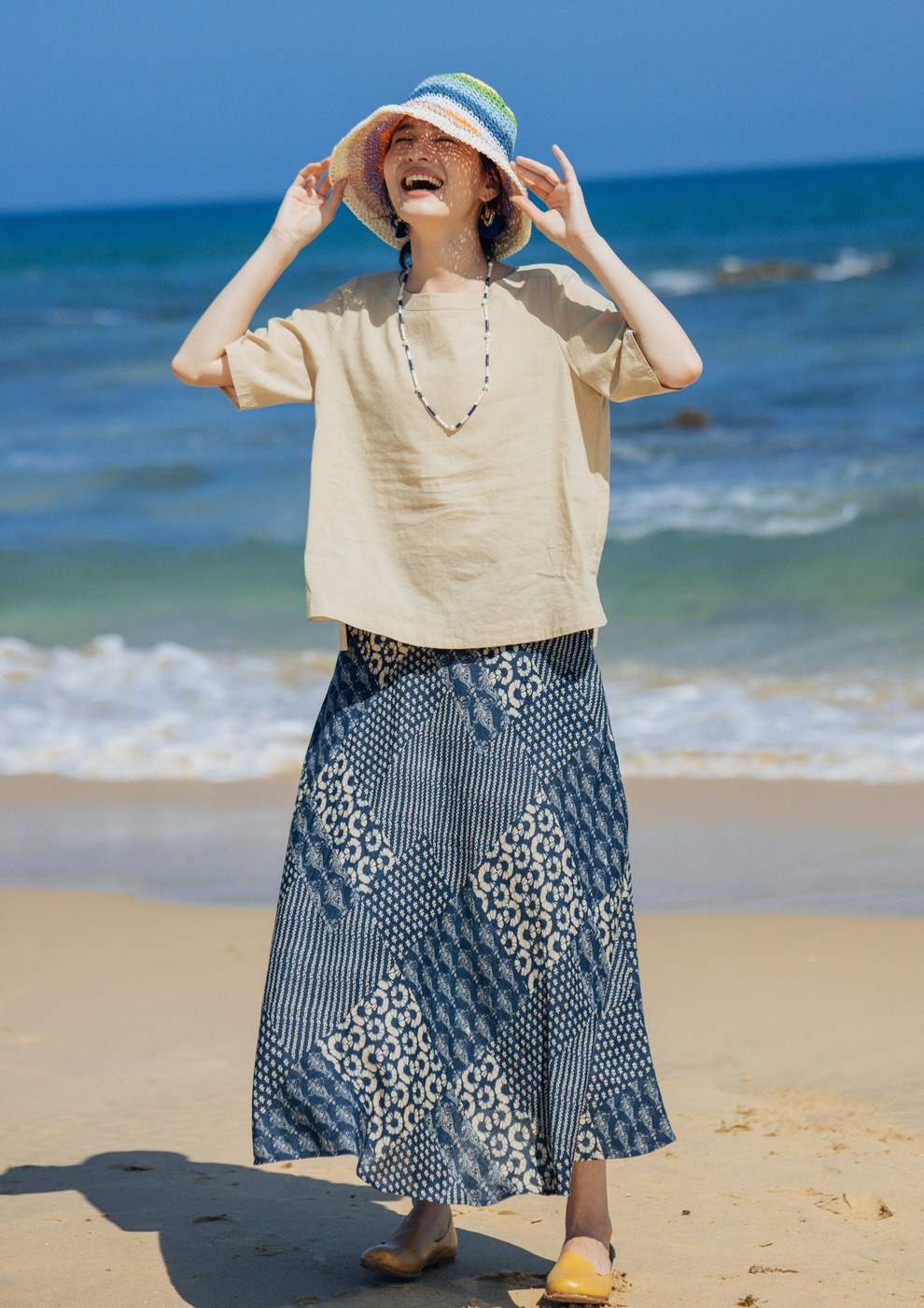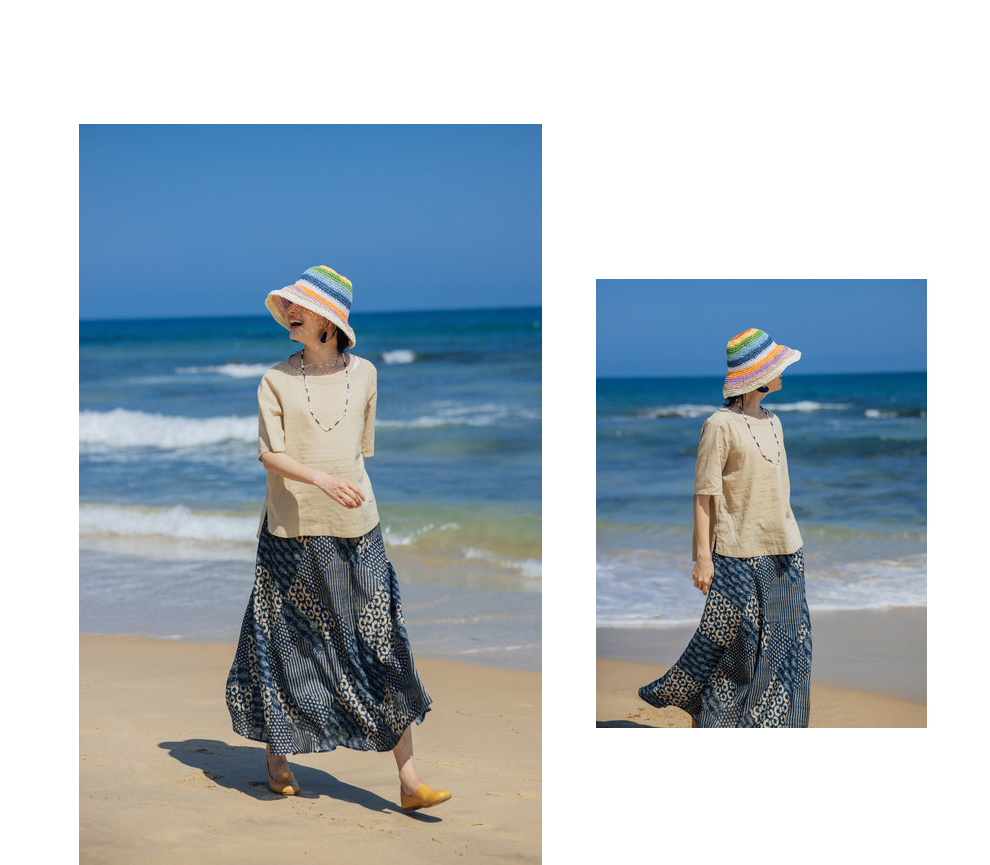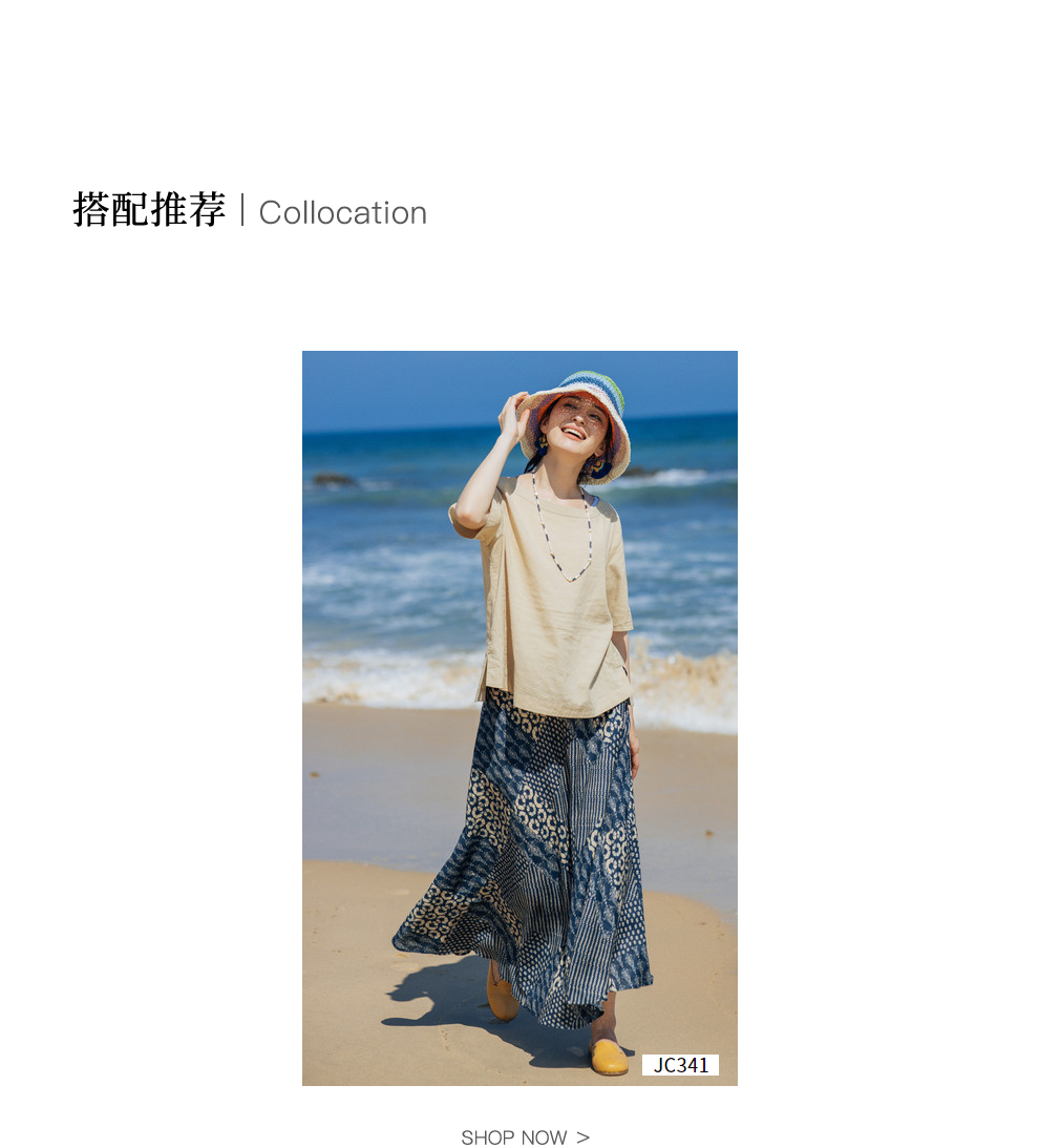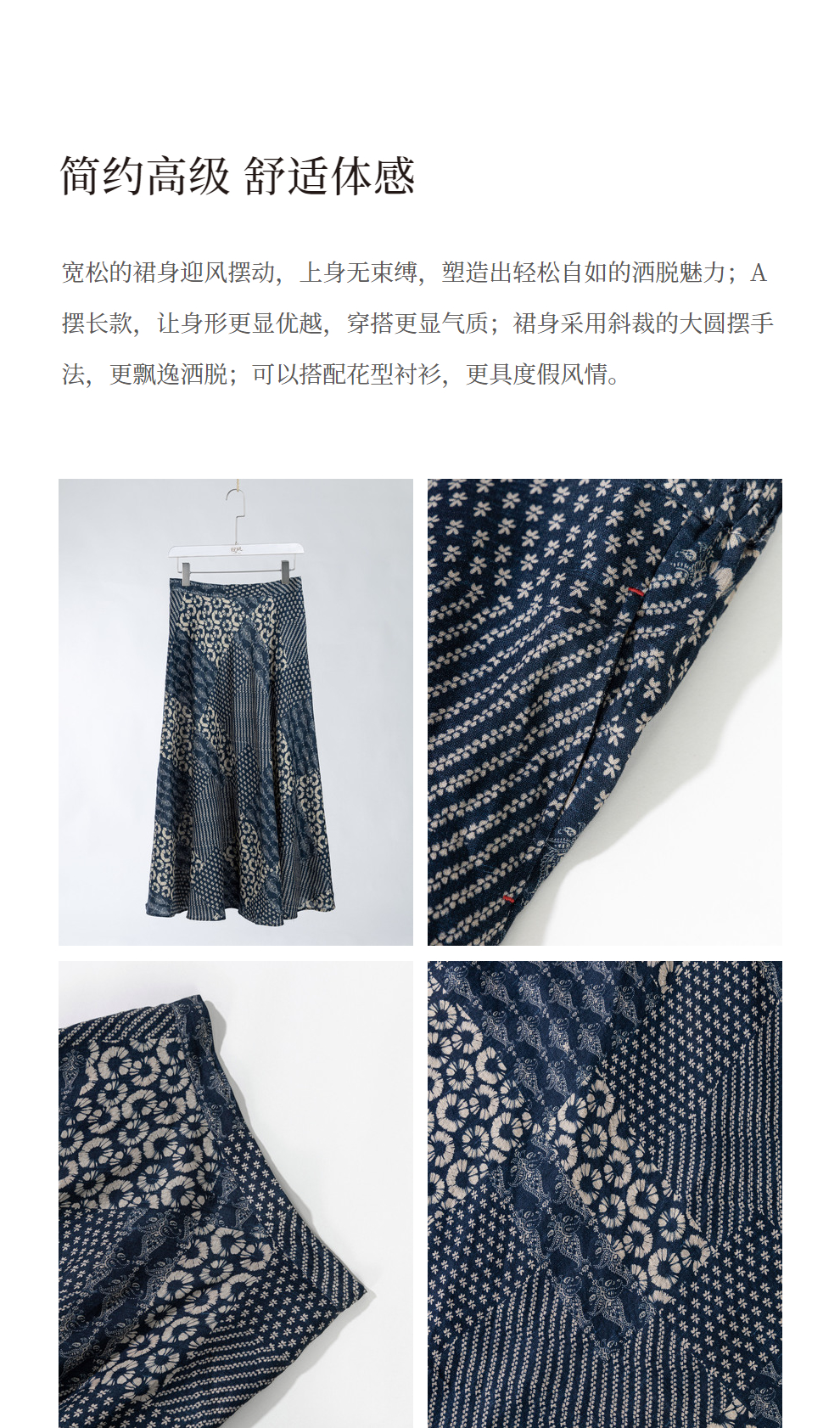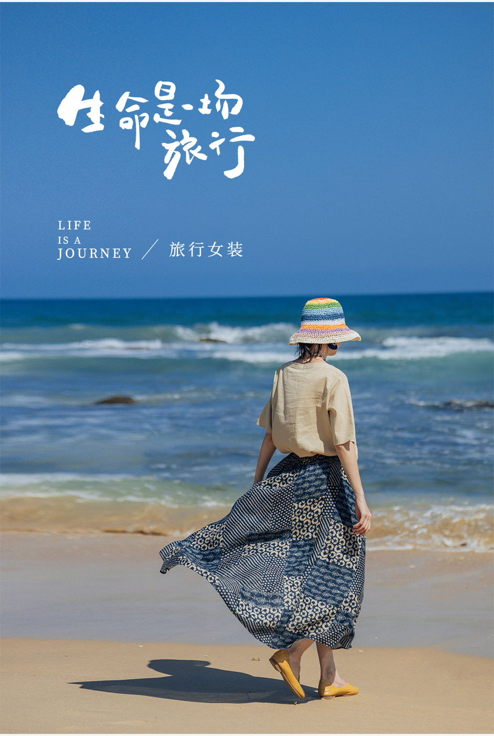 绽放旅行女装339朵/蓝染印花亚麻复古文艺半裙清凉透气海边度假裙