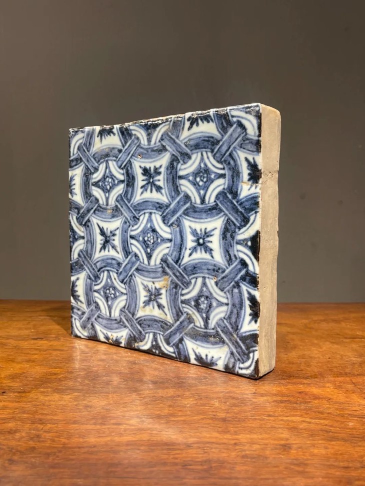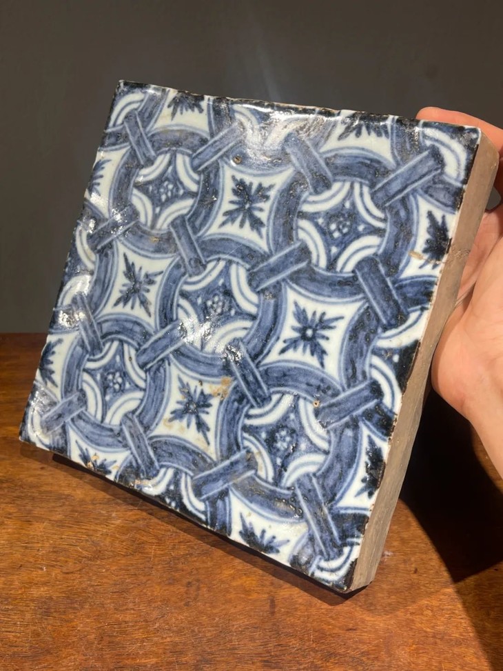 这是一件景德镇烧制的早明永乐大报恩寺地砖风格老青花瓷地砖,高岭土细白胎的长方型厚瓷板,以进口苏麻离青钴蓝料绘与永乐大报恩寺地砖雷同的连环绳结纹几何图案,胎质比重高,尺寸近二十厘米见方,瓷板厚度达三点三厘米,重近三公斤,釉水凝厚光润,青花发色深蓝,偶带进口青料特有的黑色斑点,四侧与底部露涩胎,呈现出洁白细密之瓷胎,体现早明永乐青花瓷器的风格与特质。