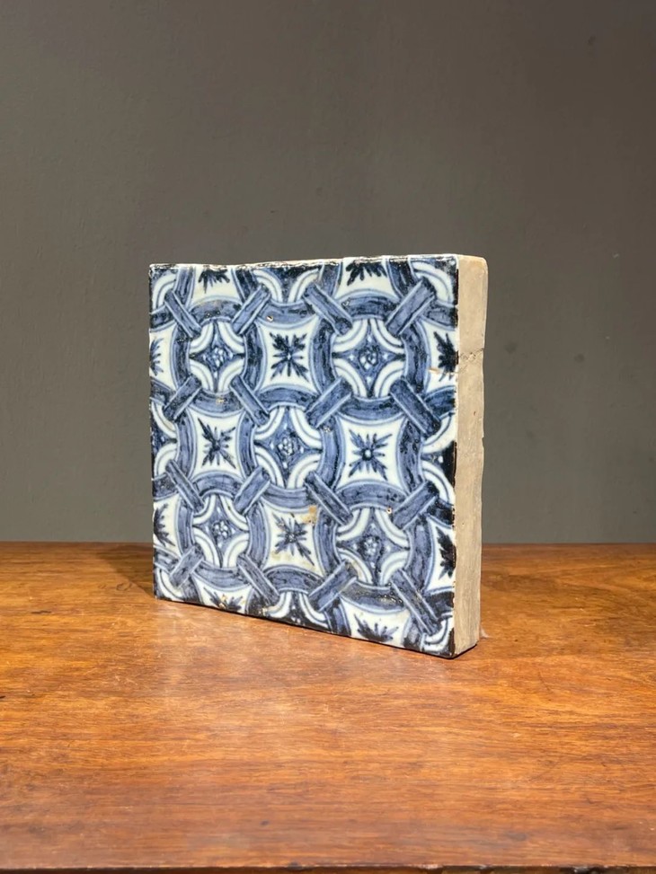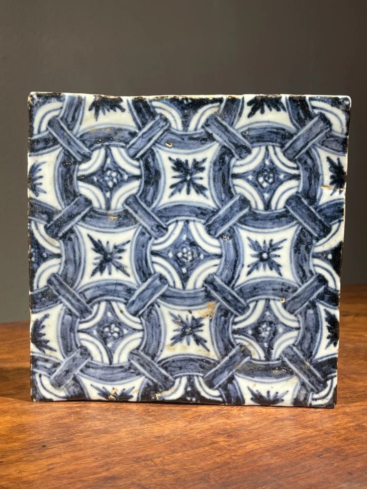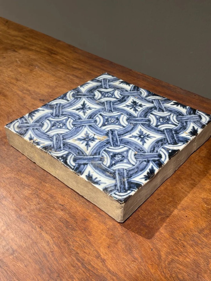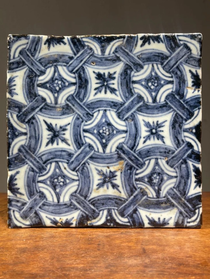 此早明风格青花绘连环绳结纹瓷板地砖,青花发色深蓝,渲染层次分明,构图典雅、绘艺精湛,瓷胎精致细腻,与明初永乐时期建大报恩寺时所使用的地砖之图案相似,前藏家已珍藏逾五十年,未经专家鉴定是否为明代永乐之物,《用之美》专栏以精美旧物与朋友们分享。