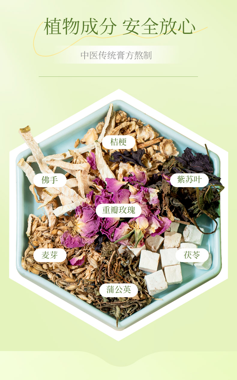 【配料】蒲公英、茯苓、佛手、桔梗、麦芽、紫苏叶、重瓣玫瑰、栀子、水、麦芽糖饴