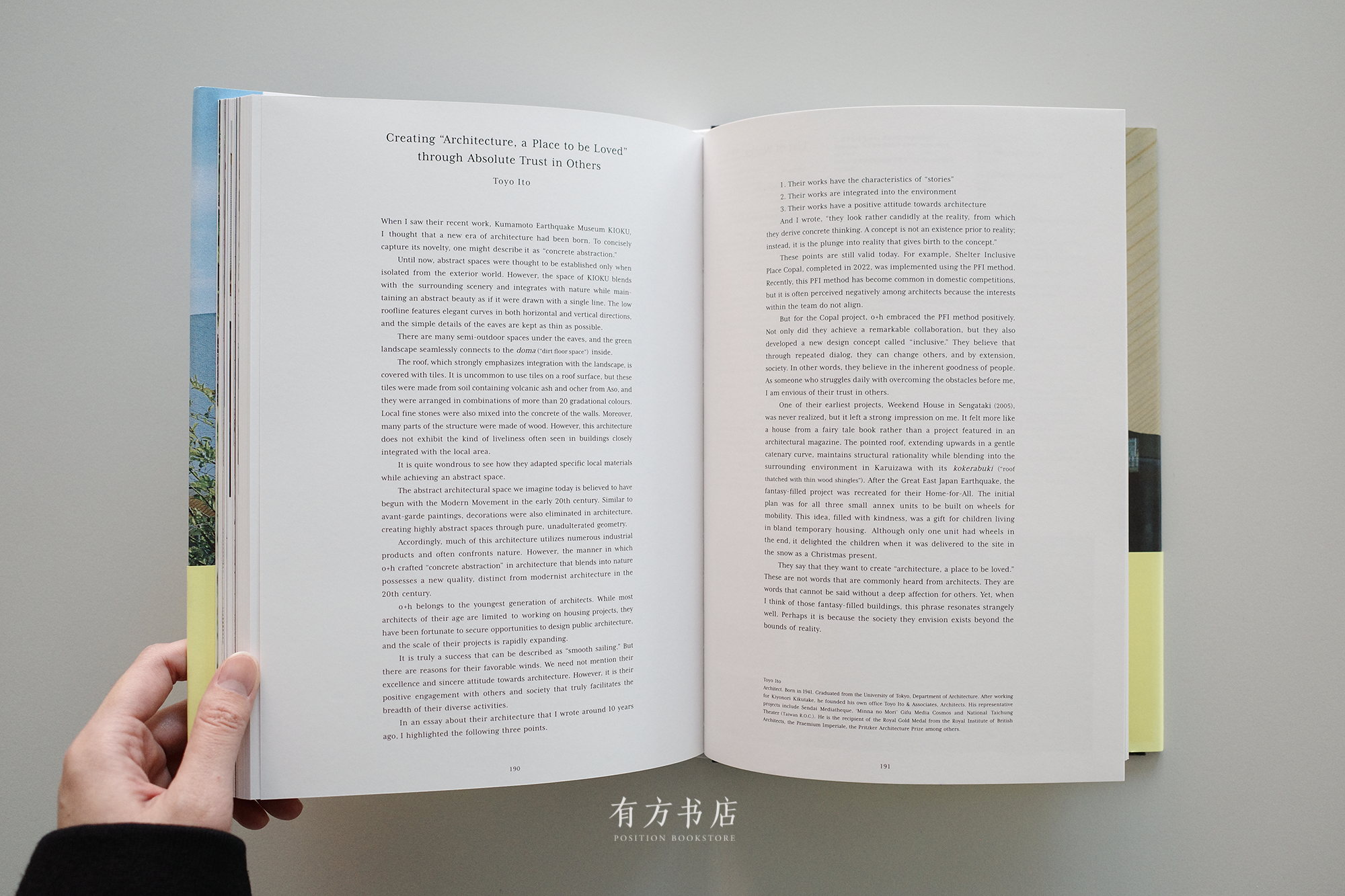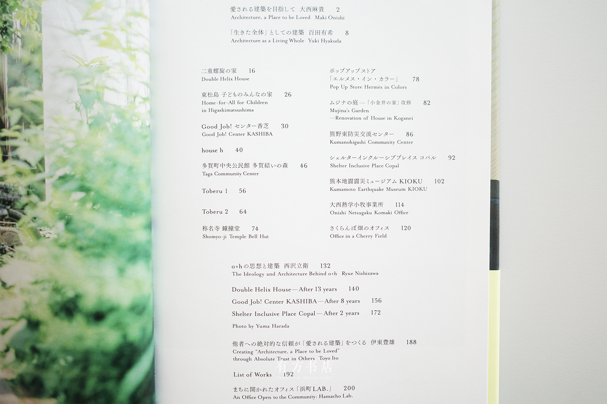 这本书汇集了o+h事务所设计理念和作品的书籍,不断探讨建筑为何能成为令人喜爱的场所这一问题。书名来自2023年大西麻贵与百田有希为第18届威尼斯建筑双年展日本馆策展的主题:“建筑,一个值得被爱的地方——当建筑被视为有生命的存在时”。