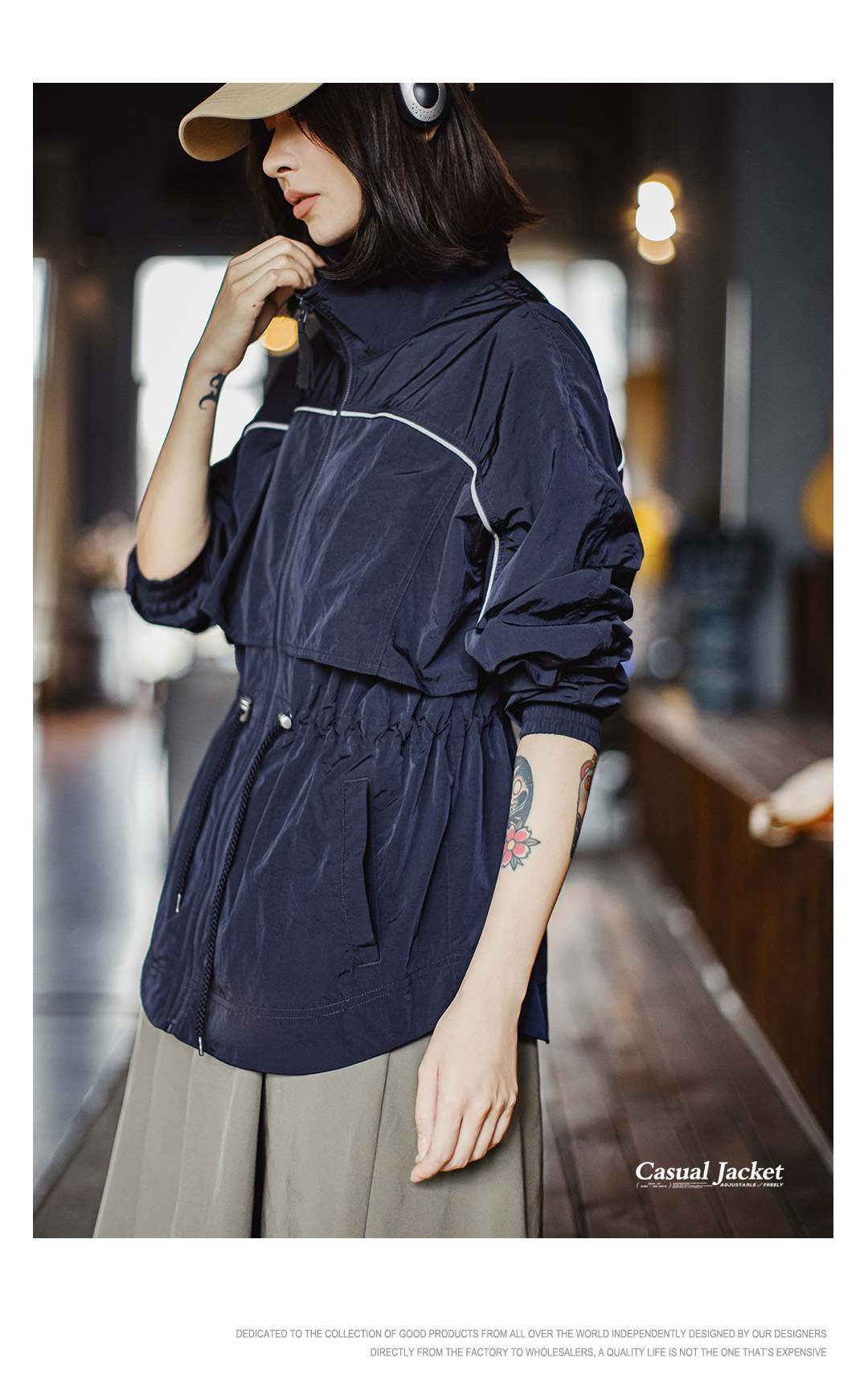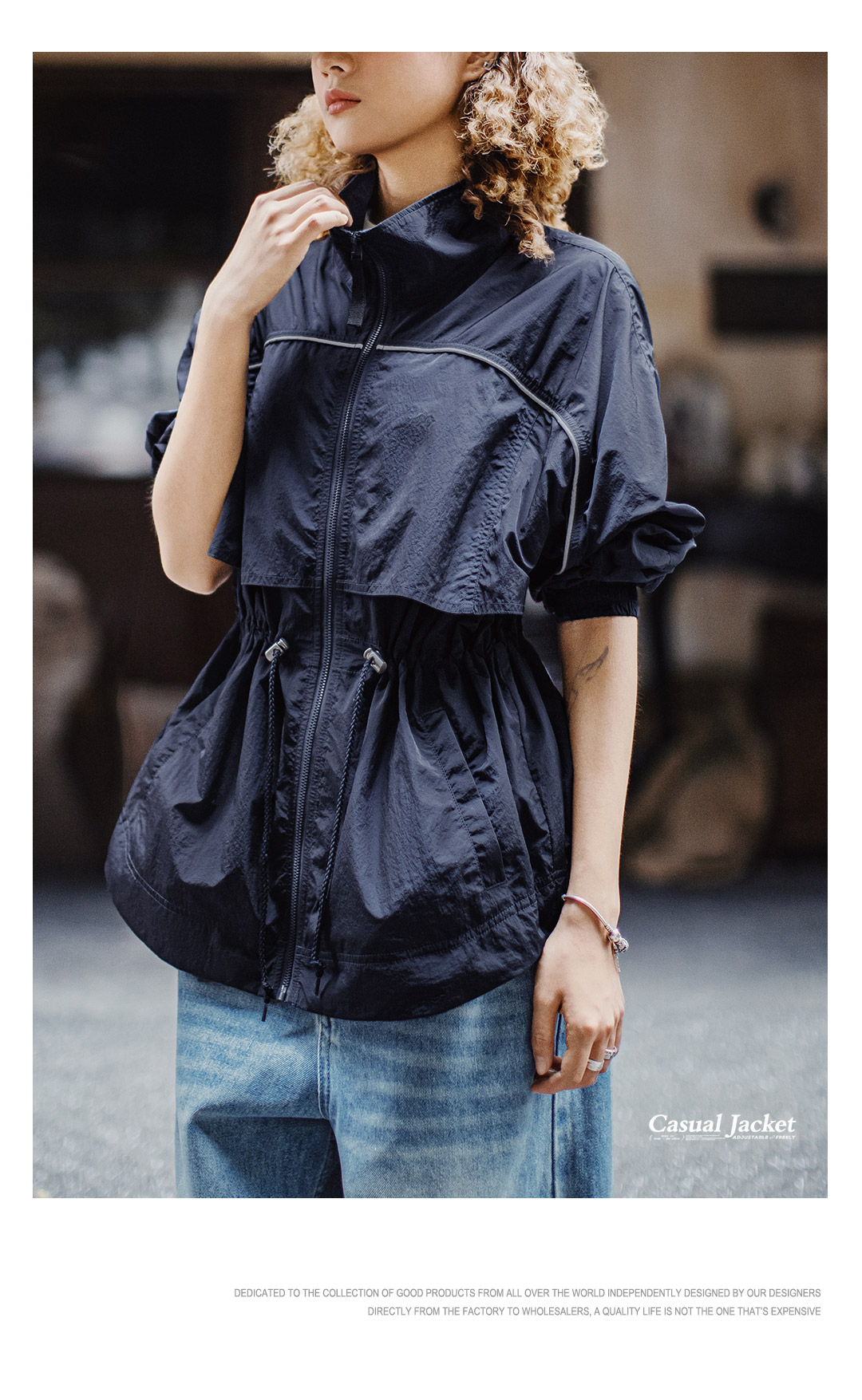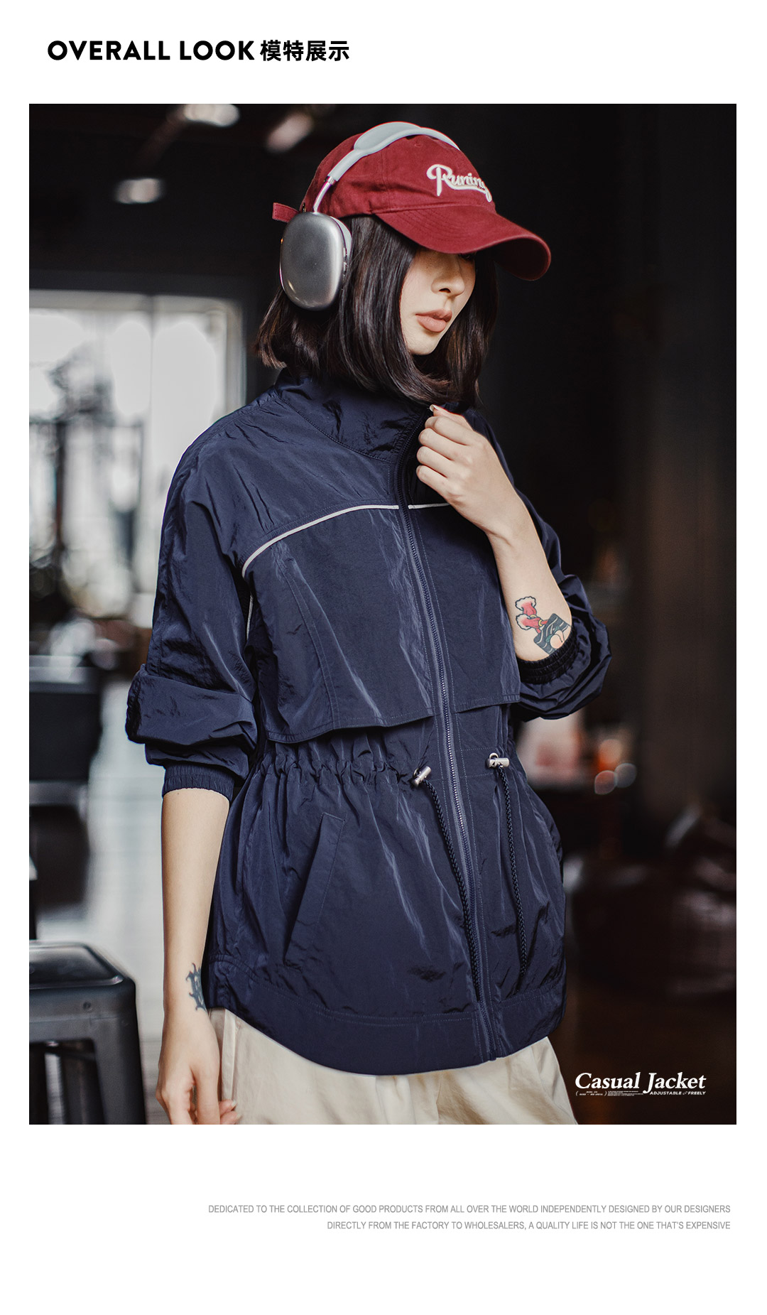 马登美式立翻领宽松轻薄短款收腰派克工装风衣夹克外套女上衣士夏
