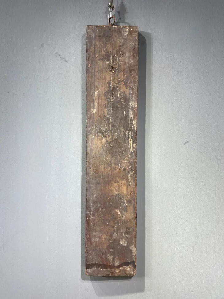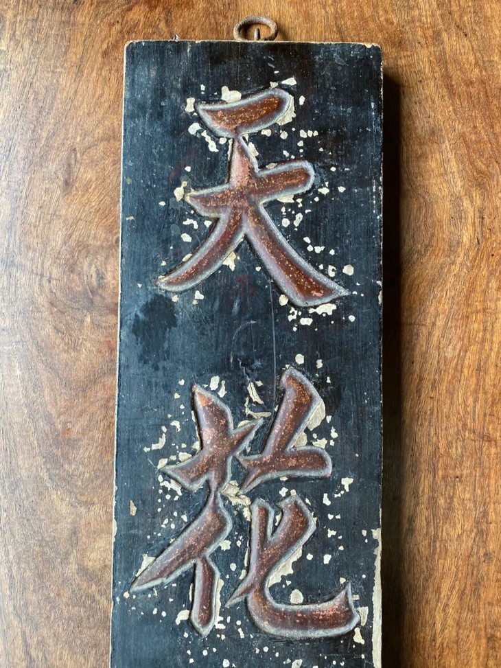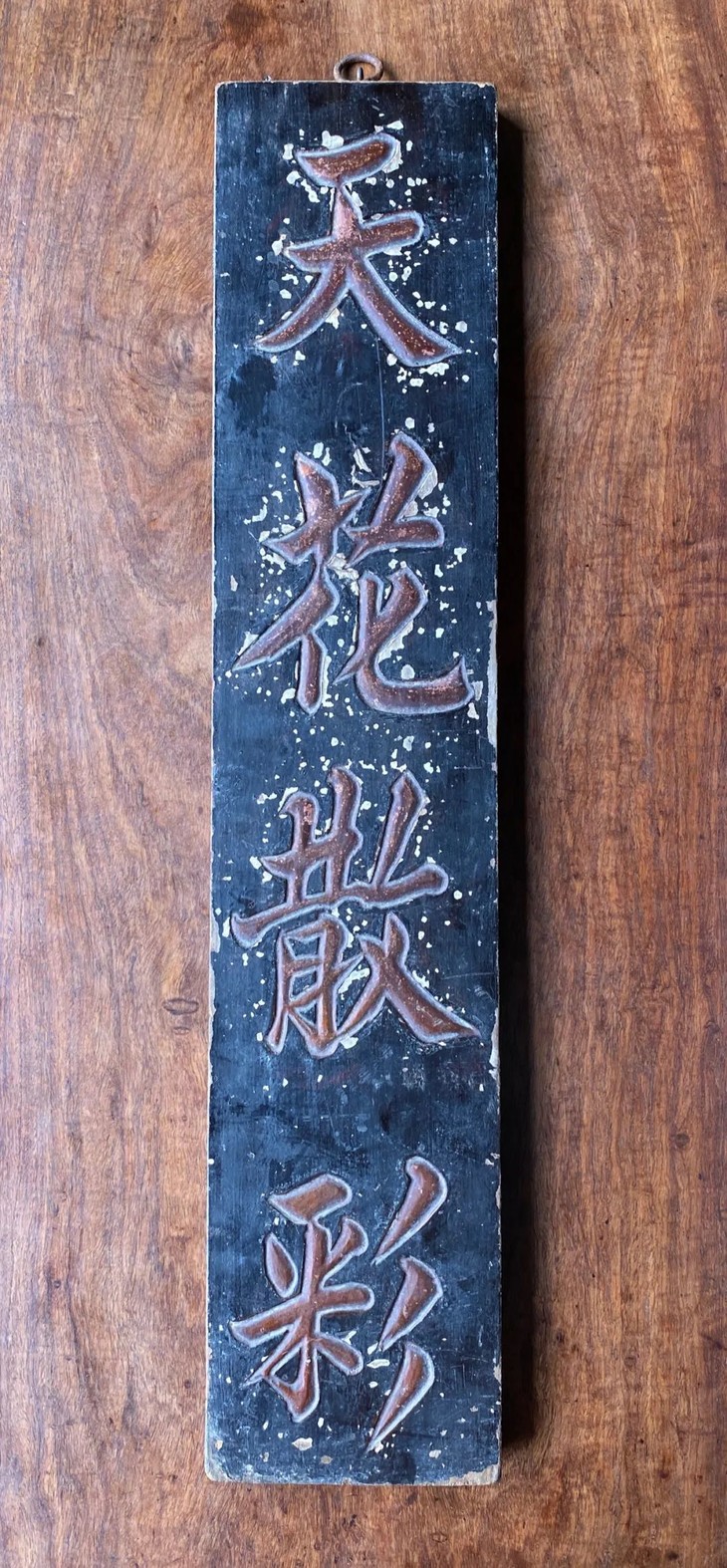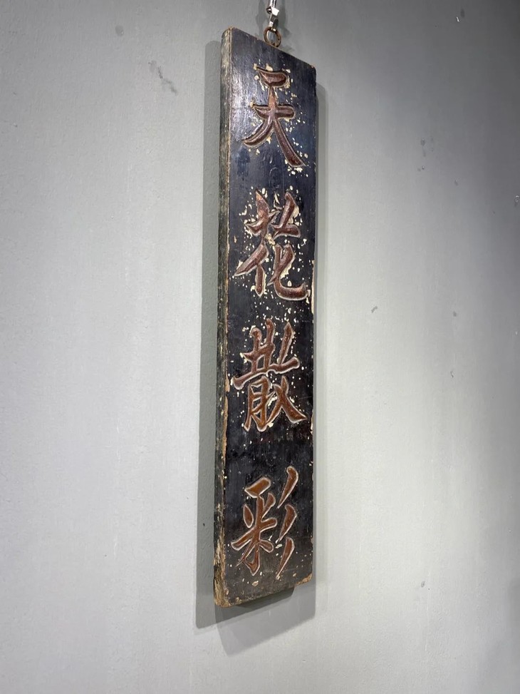 这是一块旧时代佛教寺庙或是佛堂悬挂的硬木大挂匾,年代较远的竖幅老木匾,尺寸大,高近八十厘米,以整块硬木减地浮雕髹漆阳刻“天花散彩”楷书四字,書法家等级之楷书字体优雅大气,表面涂已斑驳的褐红与黑色大漆.