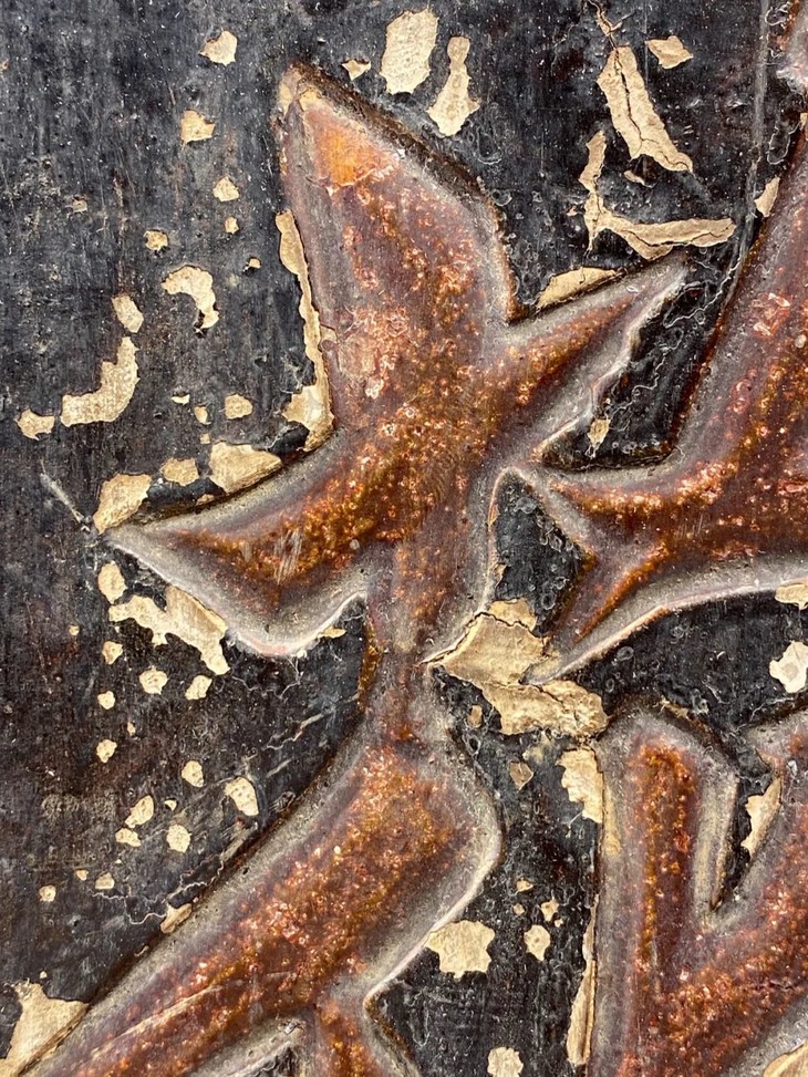 此硬木髹漆“天花散彩”大挂匾除如图所示小面积磨损与大漆剥落外,大致保存完好。如此硕大的老佛教题材掛匾非常少见。