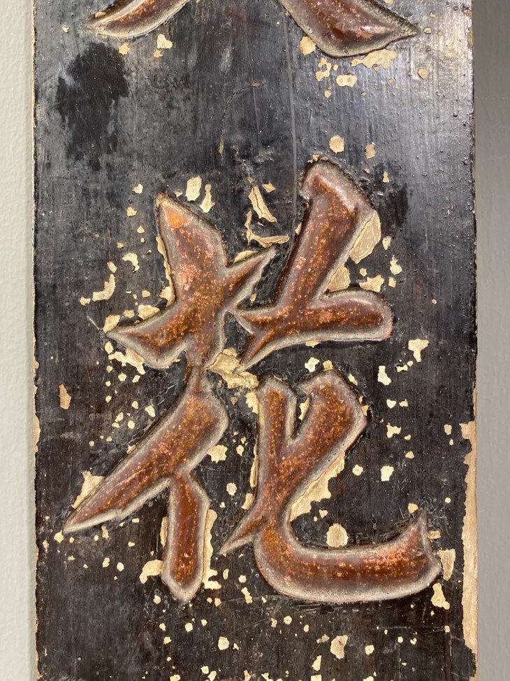 此件典型清代风格大挂匾温润之老硬木及黑大漆皮壳尽显优雅古韵,如此精致的减地浮雕阳刻字木牌,仍然保留原铁掛环,是难得一见的老挂牌匾,非常适合现代家居空间或茶室之格局。