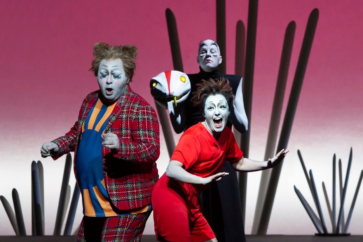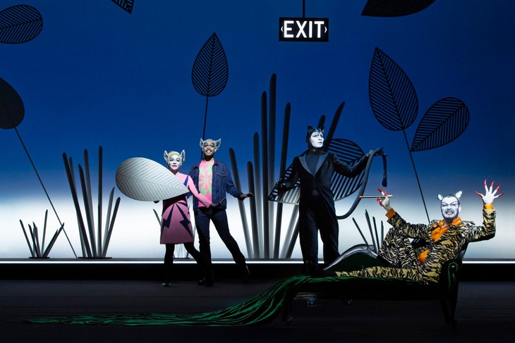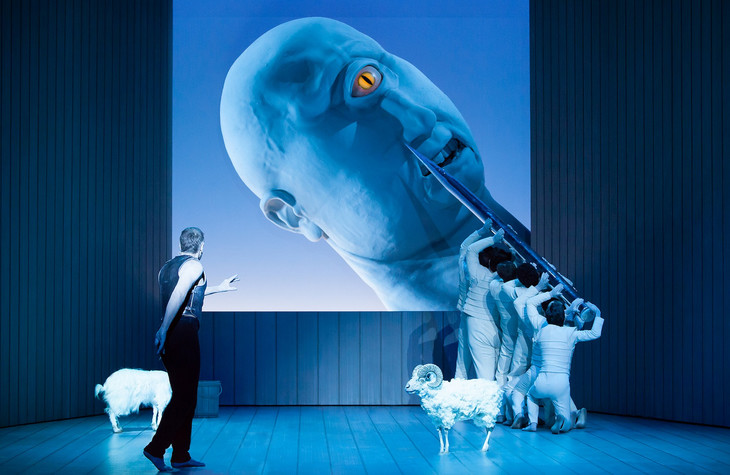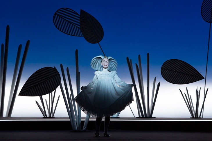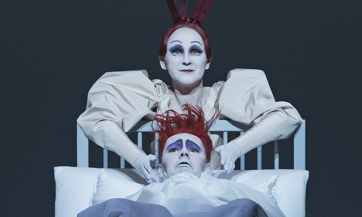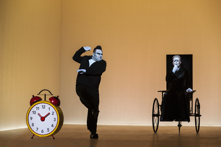 罗伯特·威尔逊是感性思维和理性思维的完美结合,建筑师出身的他可以巧妙的把那些带有哲学意味的思考被他建构在了几何式的舞台空间里。在舞台创作中,他不断挑战、打破过往的审美经验,给我们留下一帧帧高度凝练的视觉意象:干净均匀的色彩、令人印象深刻的舞台细节、华美的服装和夸张的妆容。