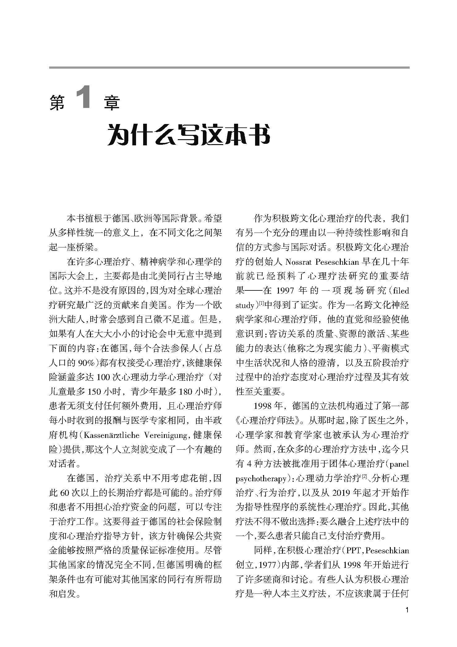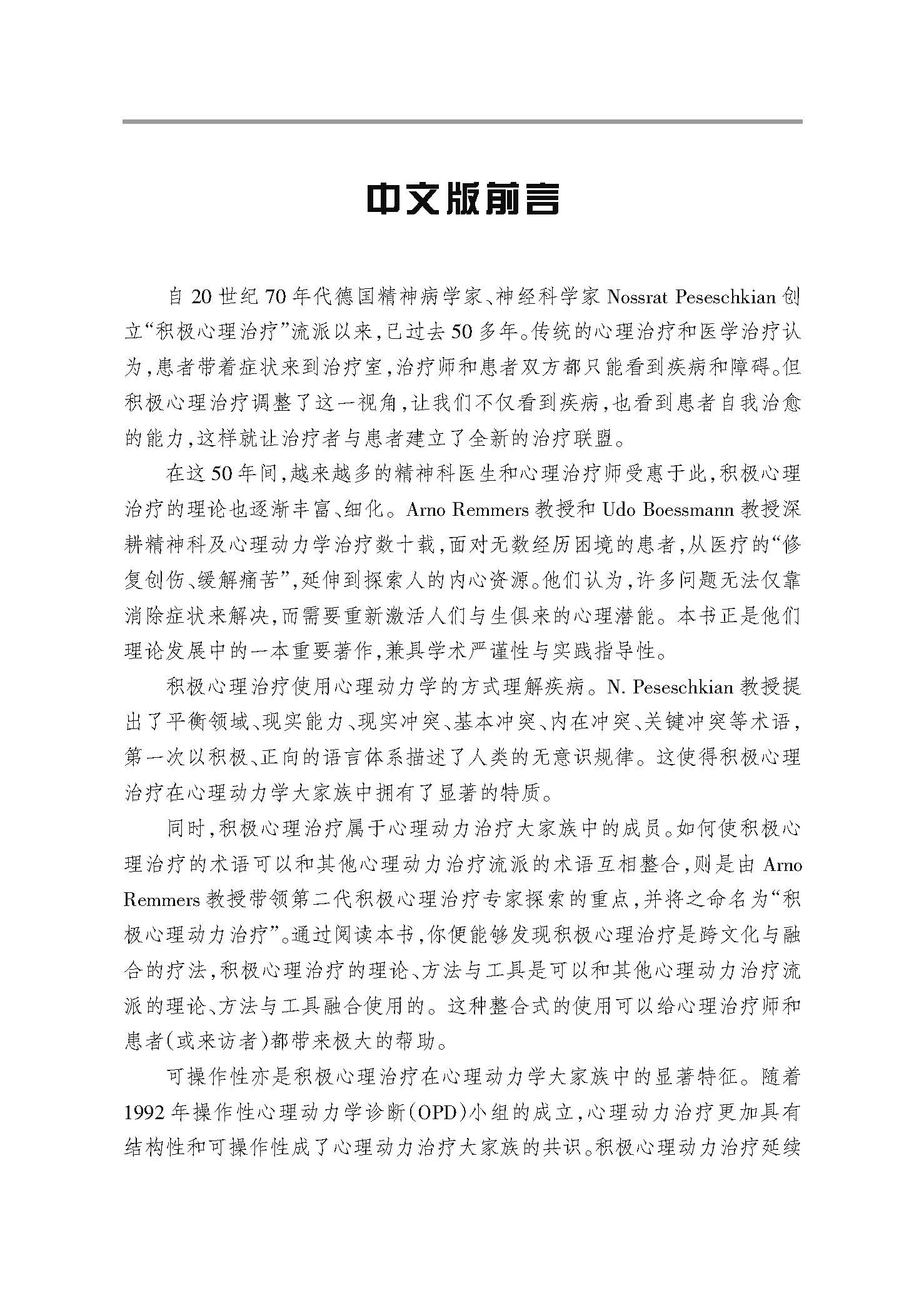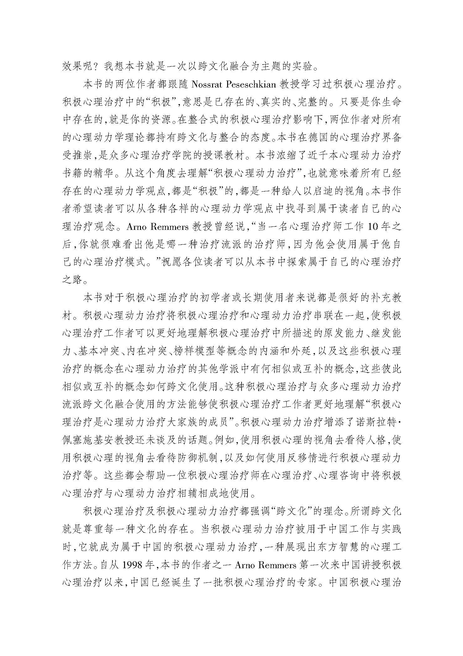 Ø 积极心理治疗由德国诺贝尔奖提名者——心理学家诺斯拉特•佩塞施基安(Nossrat Peseschkian)1968年创立。心理动力学是理解人类心智最好的模型之一。本书又是心理动力学的集大成者。涵盖了3000余本心理动力学书籍的重要观点。