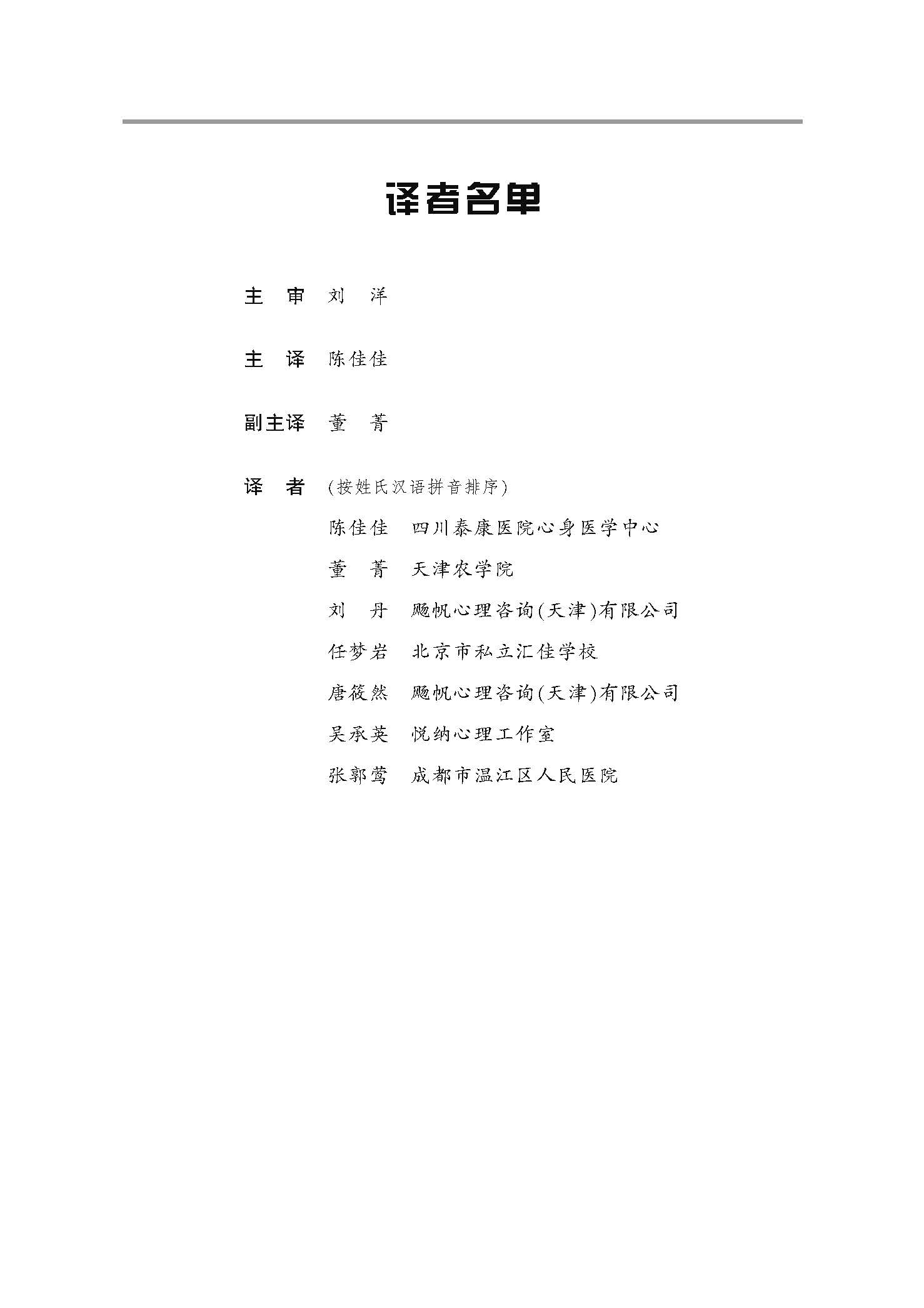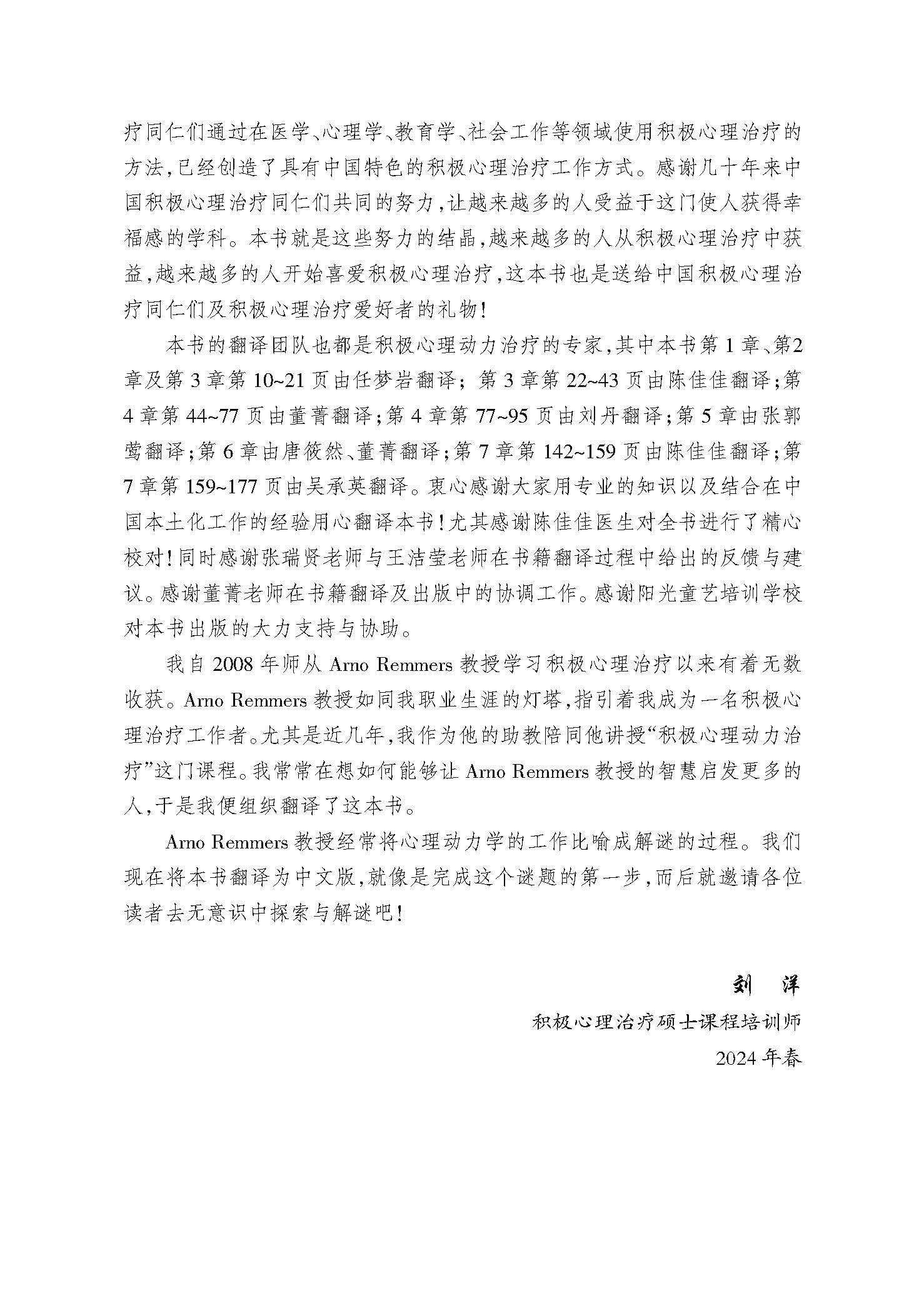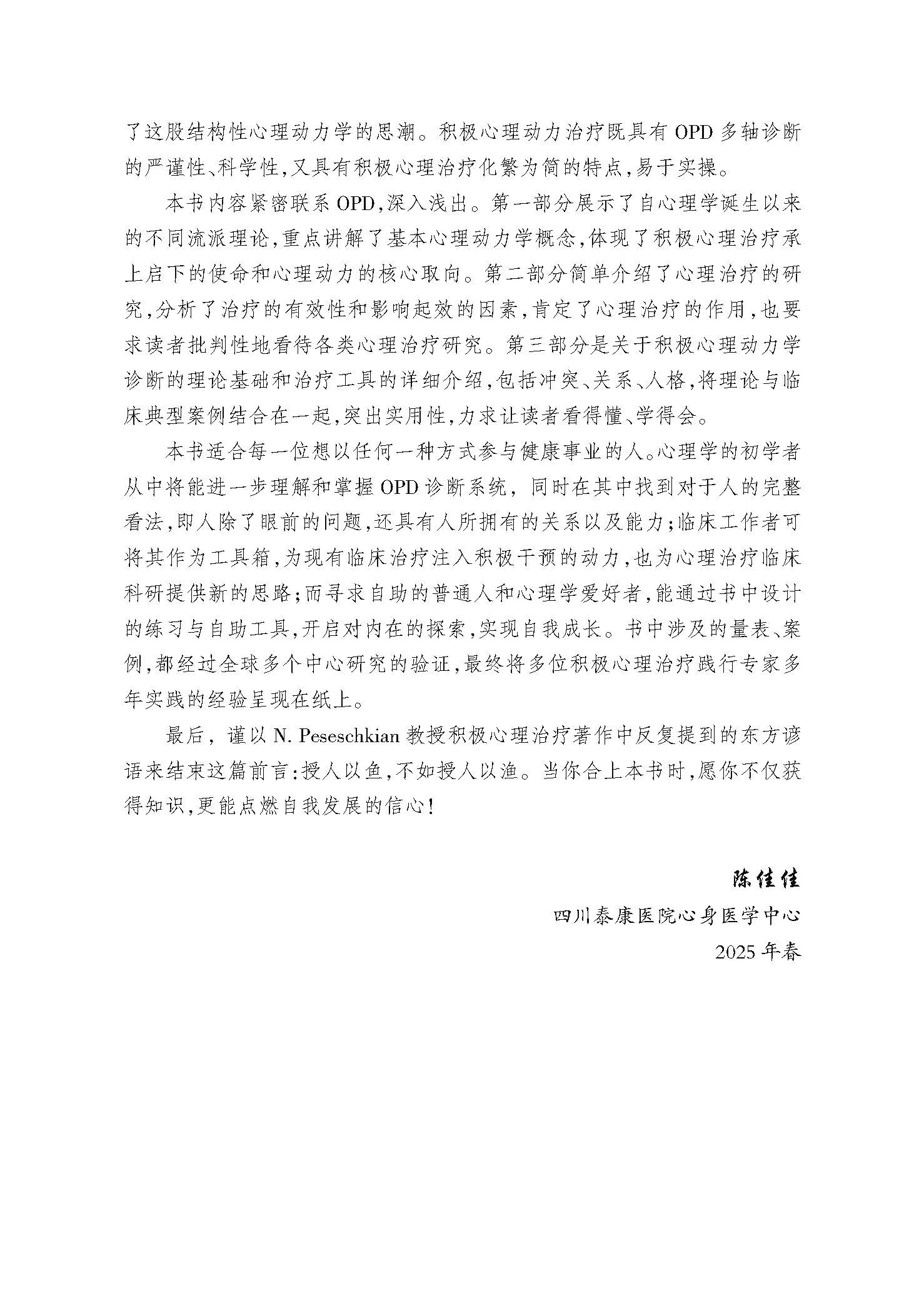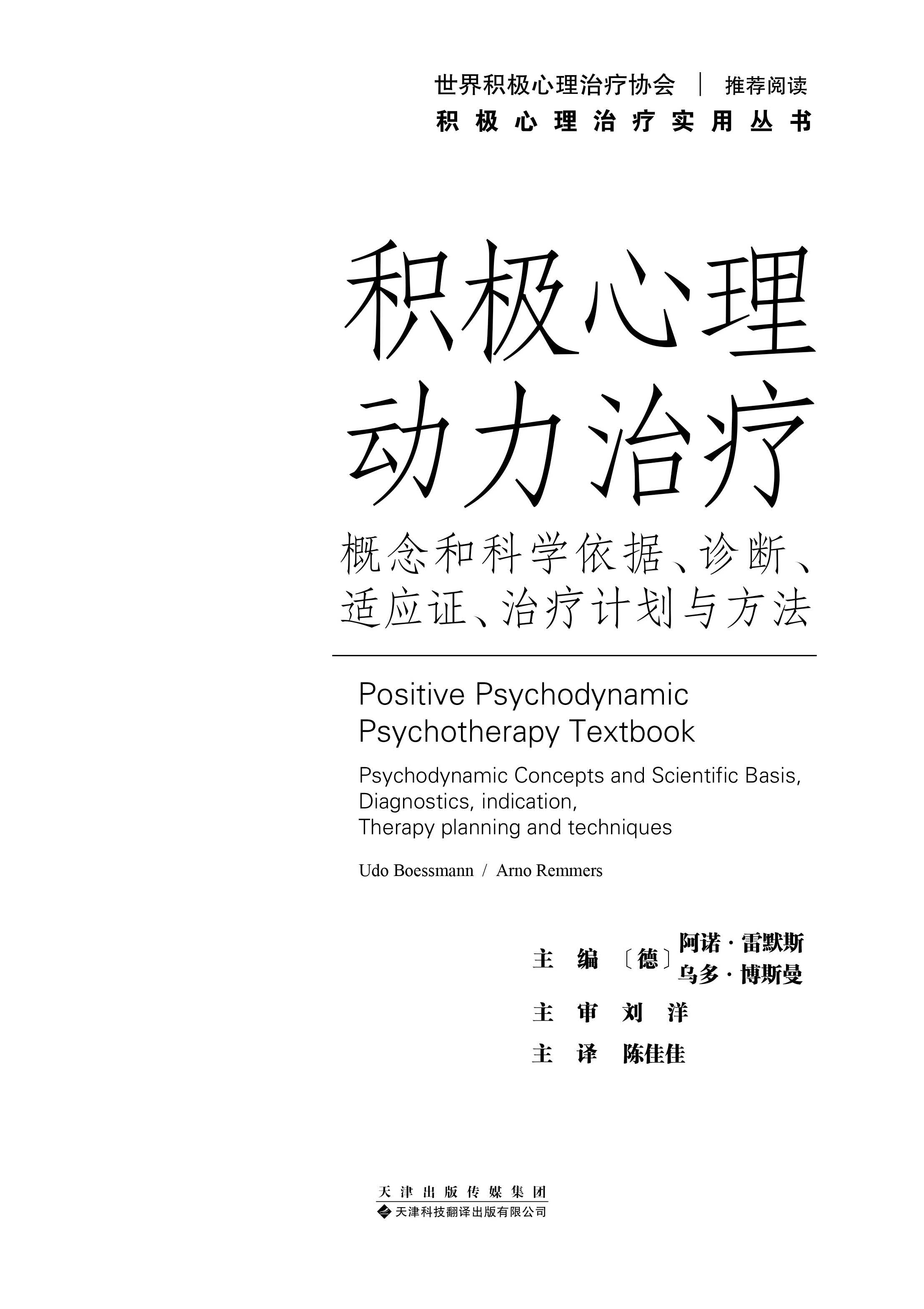 Ø 本书为引进版医学专业图书,由陈佳佳主译。积极心理动力治疗牢牢扎根于心理动力学理论和实践的,但同时又超越了心理动力学思维,具有人本、乐观和跨文化的概念,本书结合了长期实践验证的方案和最新的研究发现,行文清晰,用临床案例生动说明,并提供了大量帮助读者将理论付诸实践的想法和练习,为读者提供了极心理治疗作为心理动力学过程的实用且系统的描述,有助于切实推动国内积极心理治疗的发展。