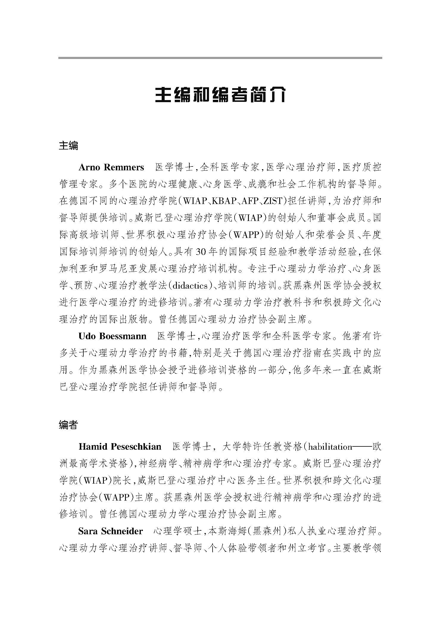 阿诺·雷默斯(Arno Remmers),医学博士,全科医学专家,医学心理治疗师,医疗质量经理。在多家医院担任心理健康、心身医学、成瘾和社会工作机构督导师。在德国多家心理治疗学院(WIAP、KBAP、AFP、ZIST)担任讲师,并为治疗师和督导师提供培训。威斯巴登心理治疗学院(WIAP)创始人和董事会成员。国际高级培训师,世界积极心理治疗协会(WAPP)创始人和荣誉会员,年度国际培训师培训(WAPP)创始人。具有30年的国际项目经验和教学经历,在保加利亚和罗马尼亚开展心理健康教育工作。