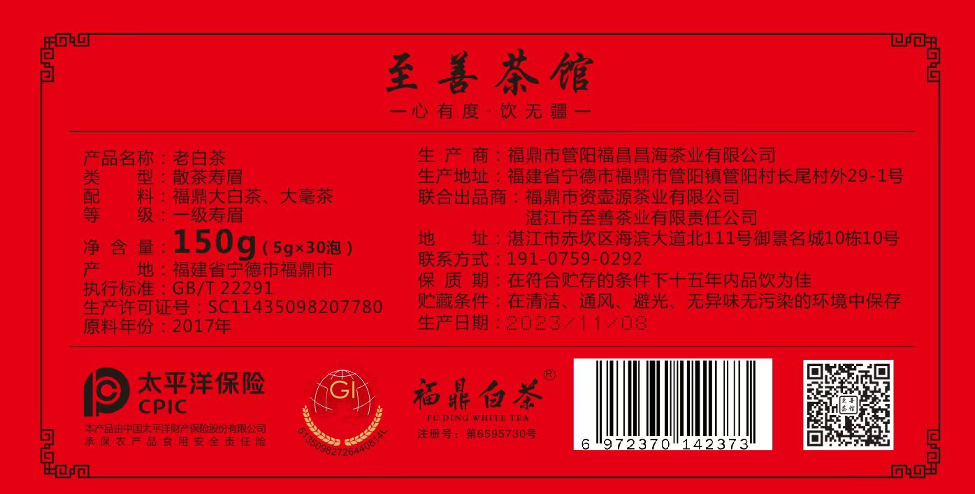 至善茶馆 福鼎白茶2017年老白茶(一级寿眉)礼盒装150g