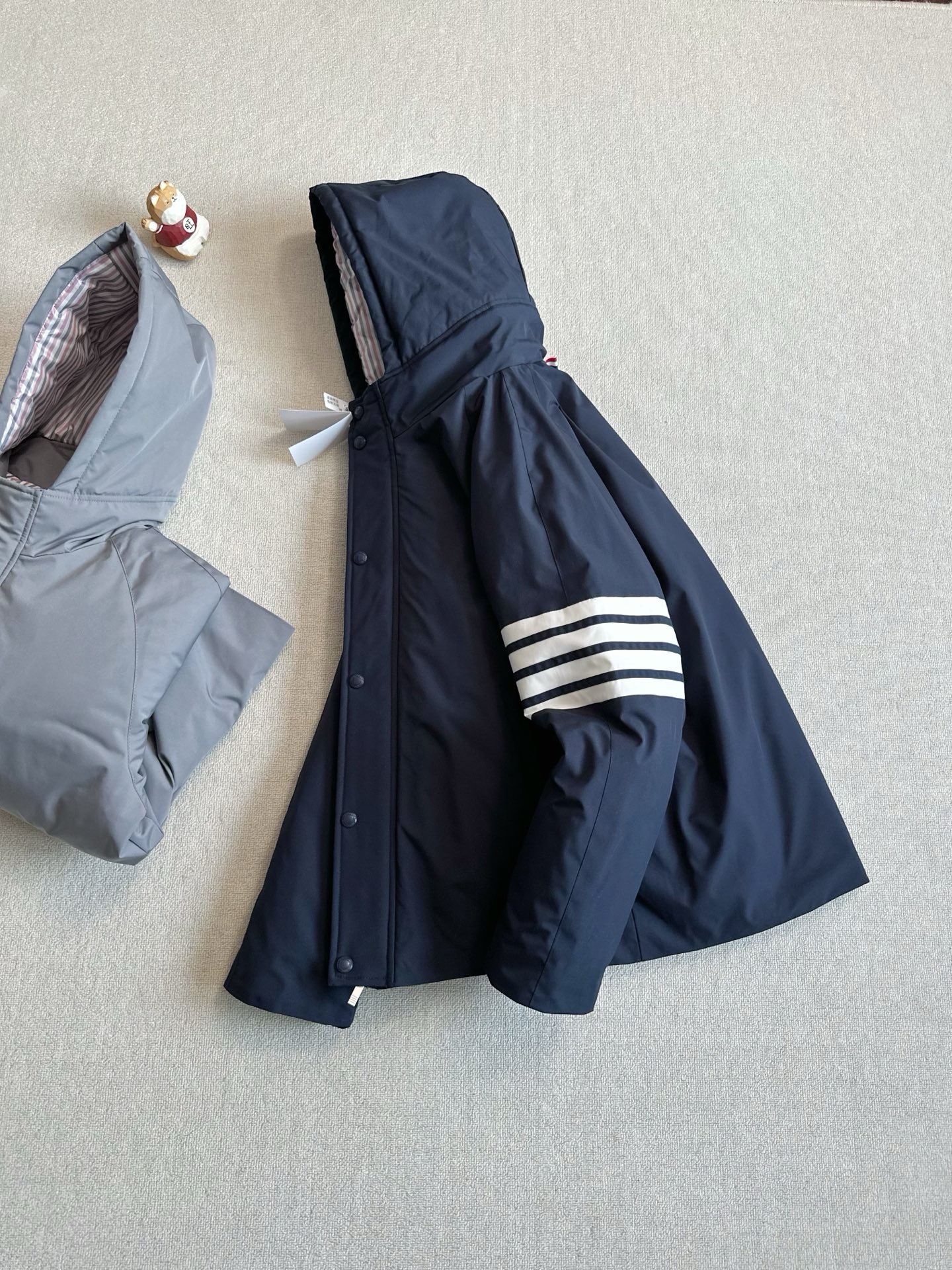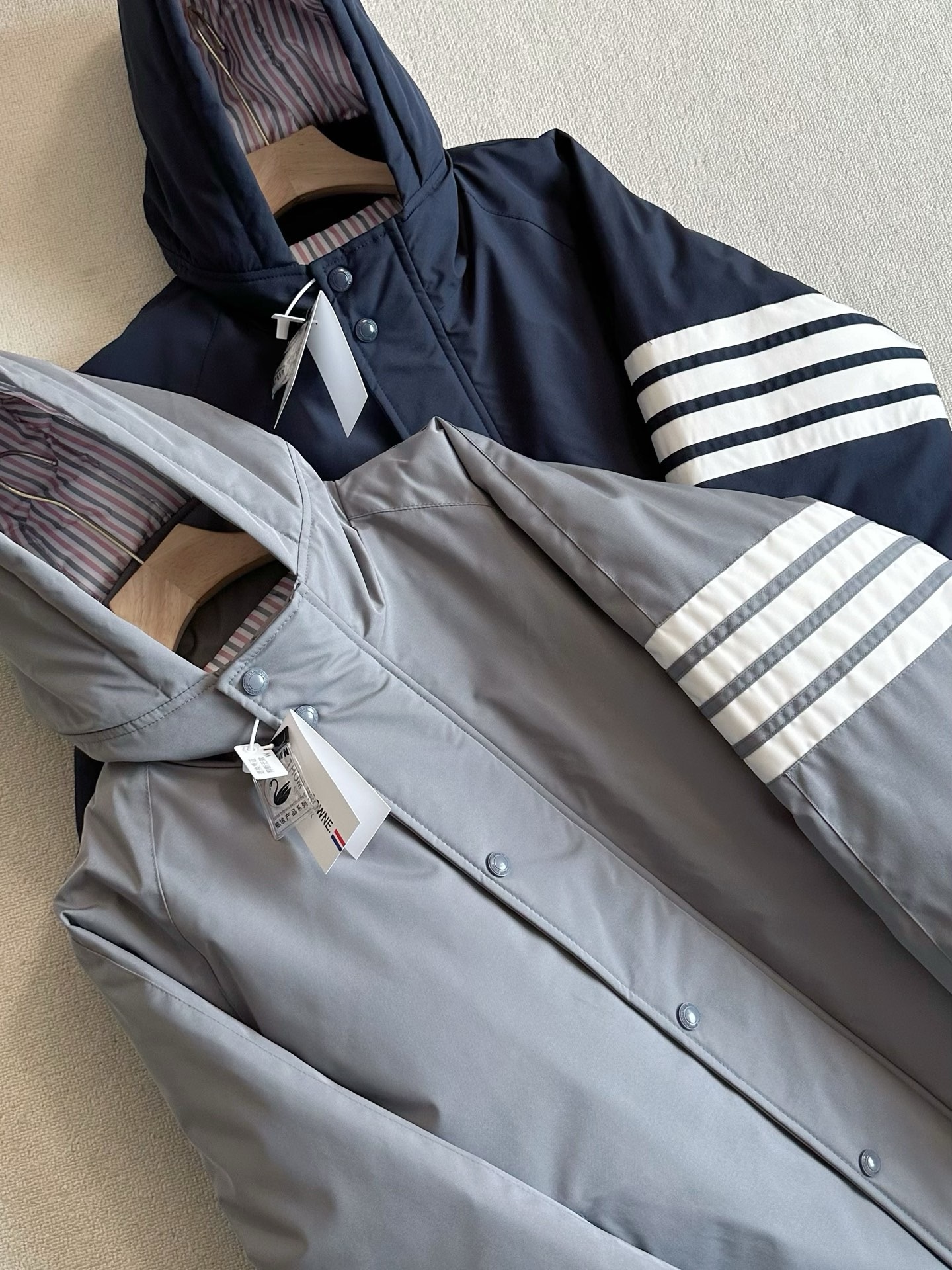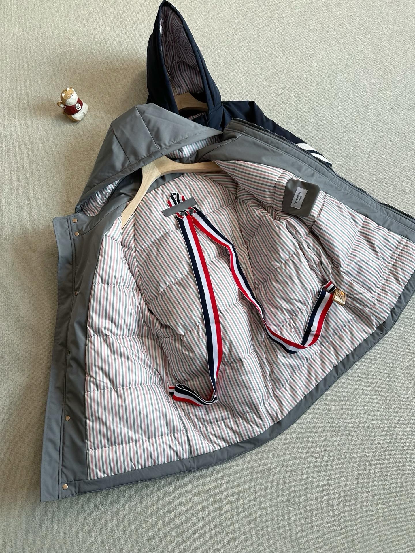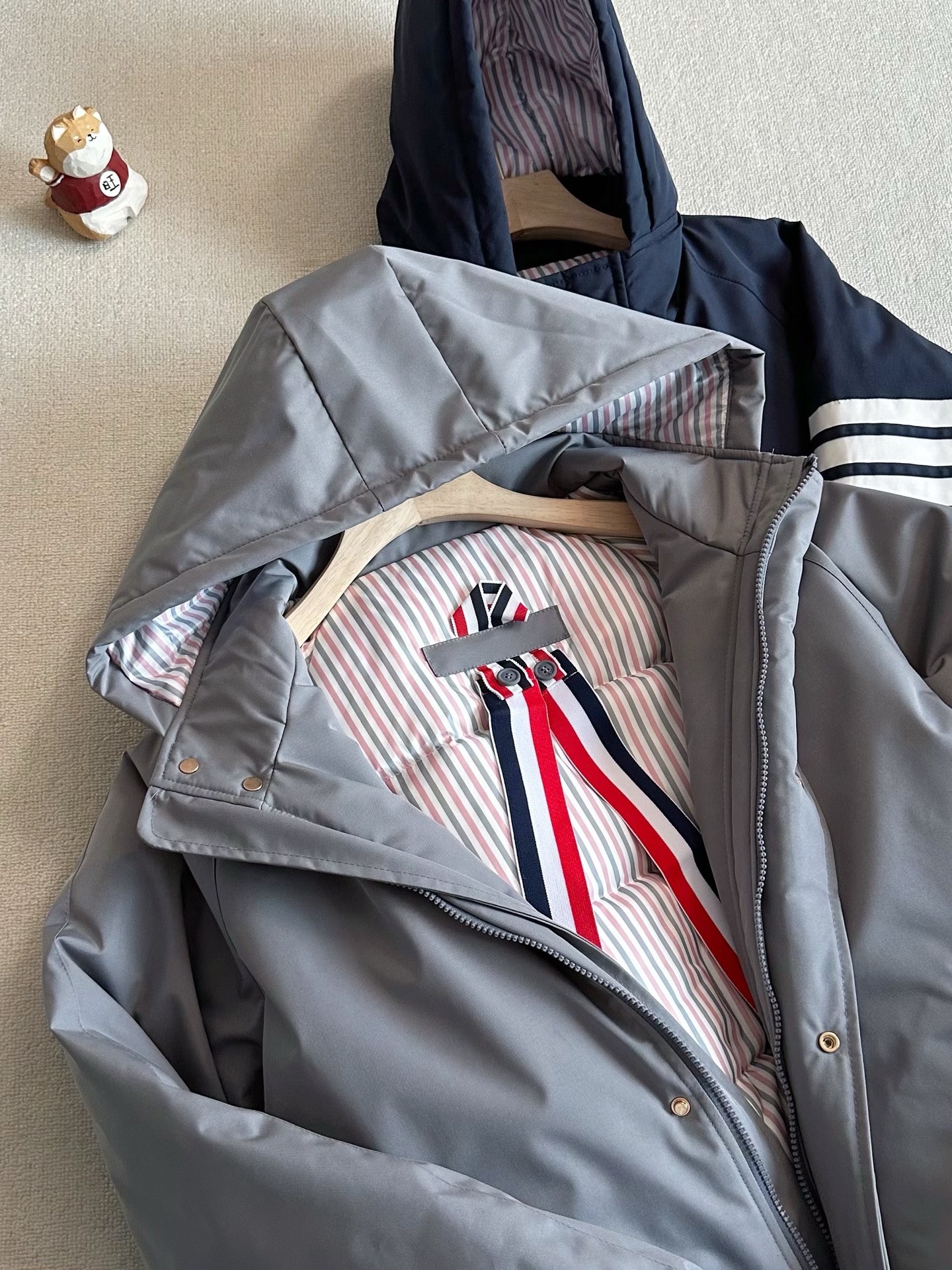 四杠荷包彩条80鹅绒羽绒男女同款加厚连帽羽绒服