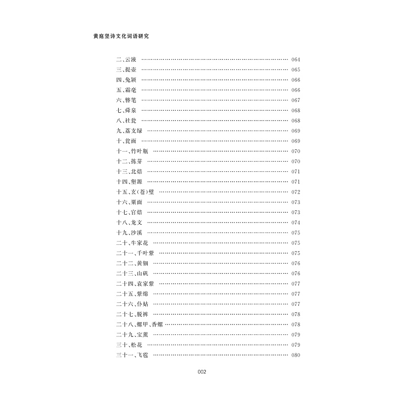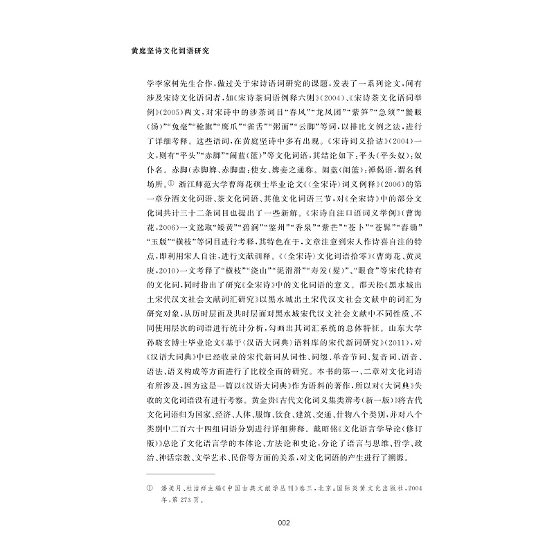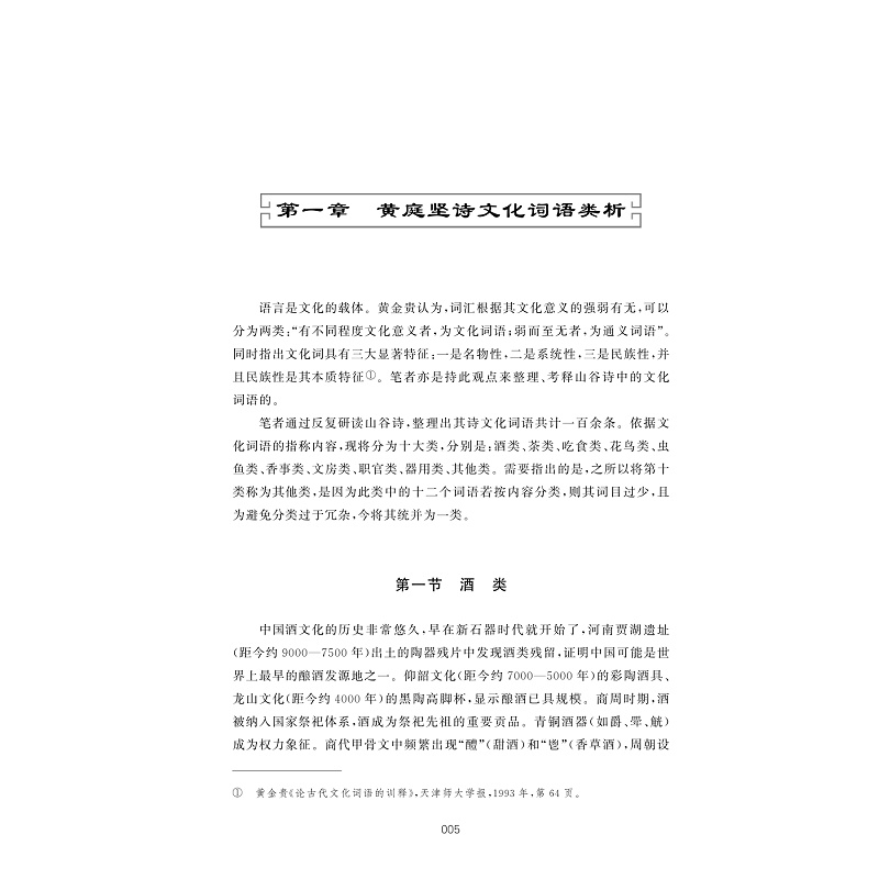 本书的研究对象是黄庭坚诗歌作品中的文化词语。我们整理出了诗中的文化词,并对其中的部分语词进行了考释。本书分为四个部分:第一部分为绪论,简介黄庭坚生平,综述本课题的研究现状、研究意义及方法。第二部分即第一章黄庭坚诗文化词语类析。通过反复研读黄庭坚诗歌,找出其中的文化词语,并依据其内容进行分门别类的整理。包括酒类、茶类、花鸟类、香事类、文房类和其他等六大类。第三部分即第二章黄庭坚诗文化词语考释。该章以《汉语大词典》为参照系,考释了黄庭坚诗歌中的四十个文化词语。第四部分为结语。
