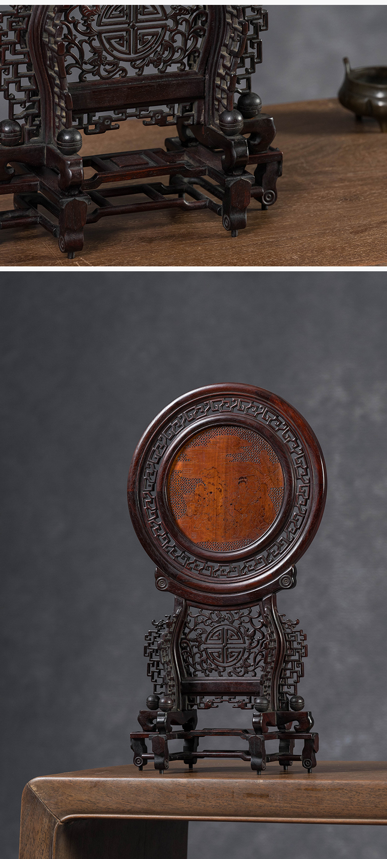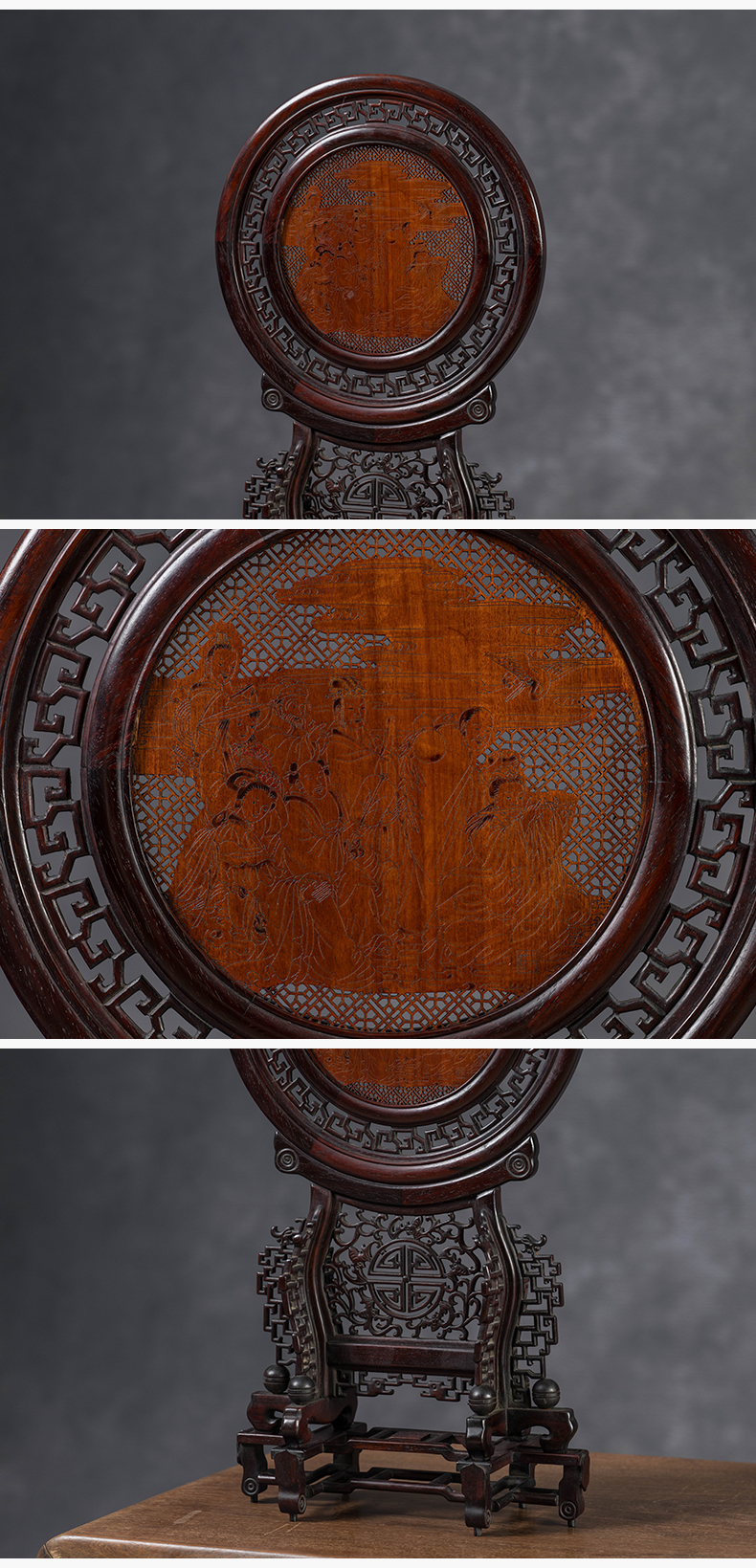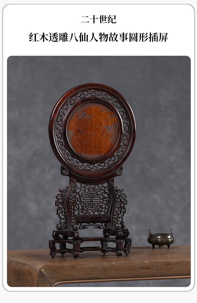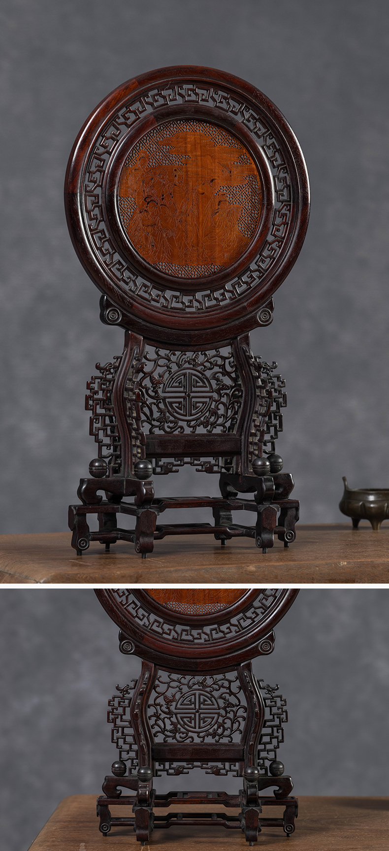 二十世纪 红木透雕八仙人物故事圆形插屏
