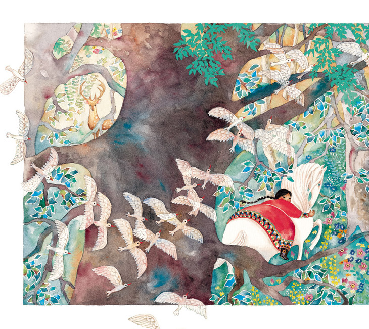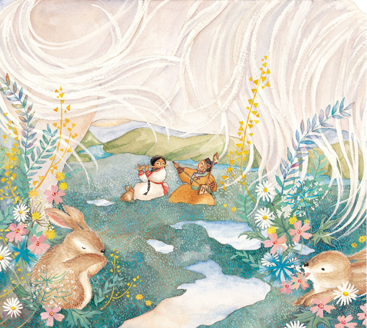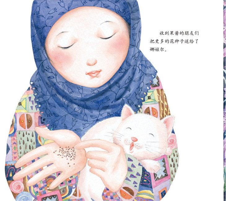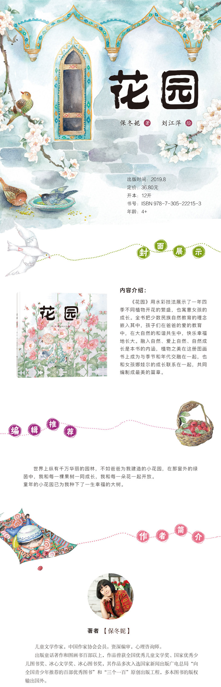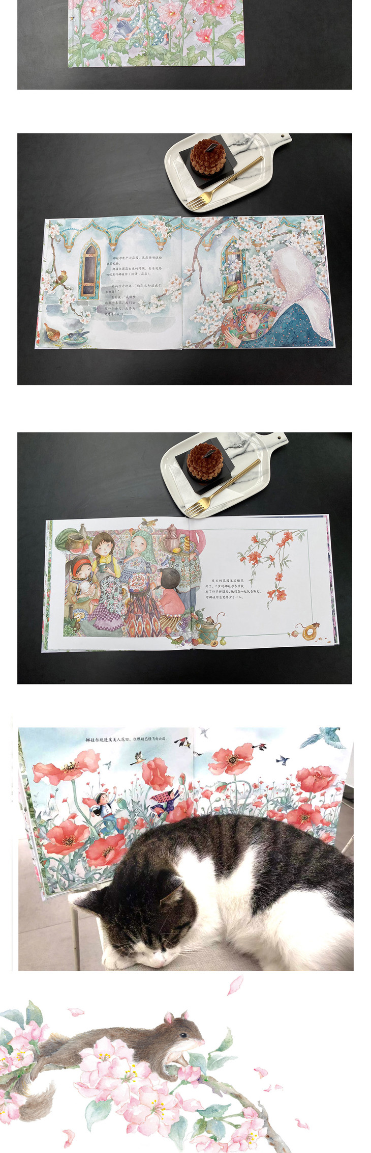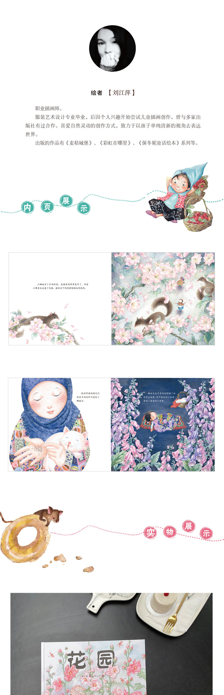 《花园》用水彩技法展示了一年四季不同植物开花的繁盛,也寓意女孩的成长。全书把少数民族自然教育的理念嵌入其中,孩子们在爸爸的爱的教育中,在大自然的和谐共生中,快乐幸福地长大。融入自然、爱上自然、自然成长是本书的内涵,植物之美在这册图画书上成为与季节和年代交融在一起,也和女孩娜娃尔的成长联系在一起,共同编制成最美的篇章。