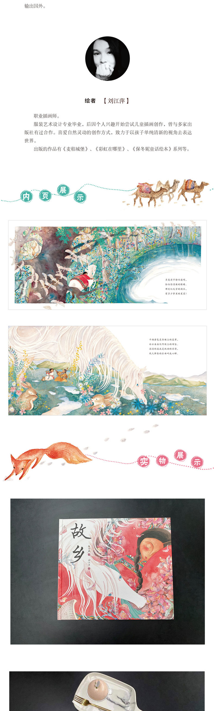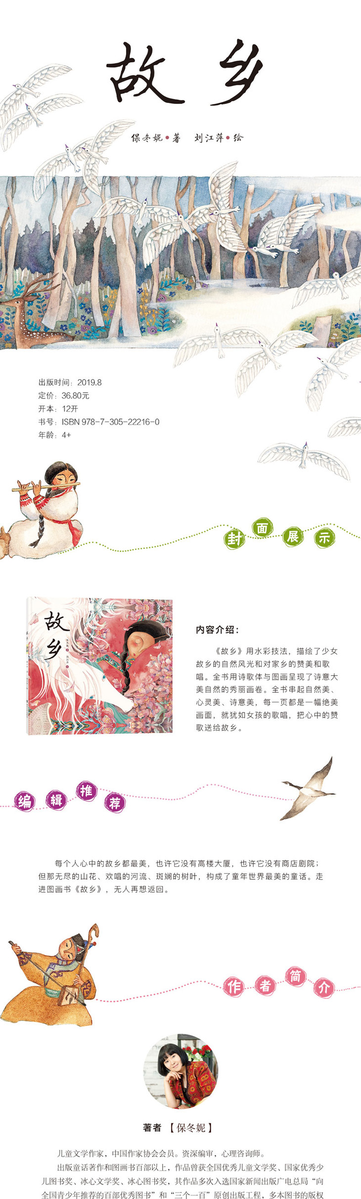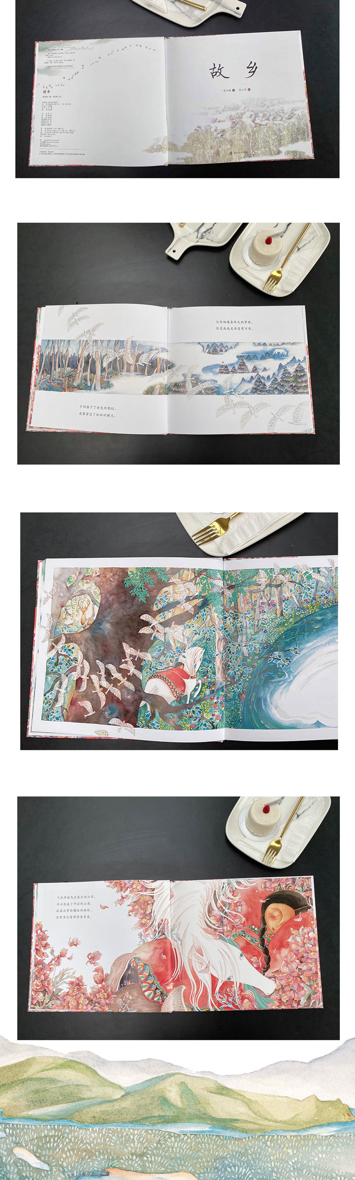 《故乡》用水彩技法,描绘了少女故乡的自然风光和对家乡的赞美和歌唱。全书用诗歌体与图画呈现了诗意大美自然的秀丽画卷。全书串起自然美、心灵美、诗意美,每一页都是一幅绝美画面,就犹如女孩的歌唱,把心中的赞歌送给故乡。