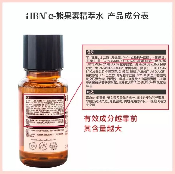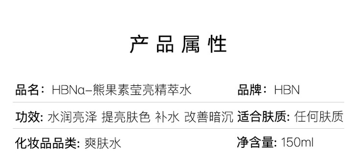 这款HBN熊果苷发光水,特别添加提亮界三大“尖子生”,强强联合,在角质层入手,逐步提亮肌肤。