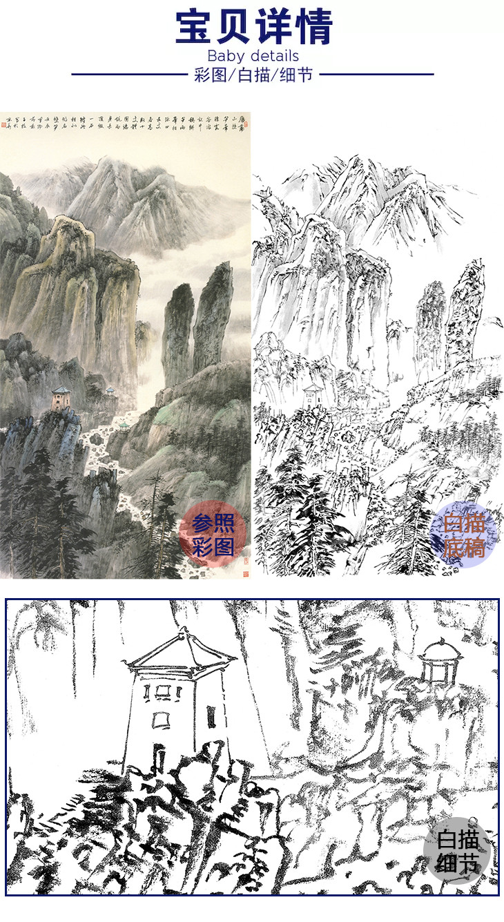 竖幅工笔山水白描底稿-陈少梅-《山河勤读图》-多种白描尺寸可选-LQ39