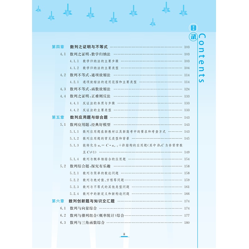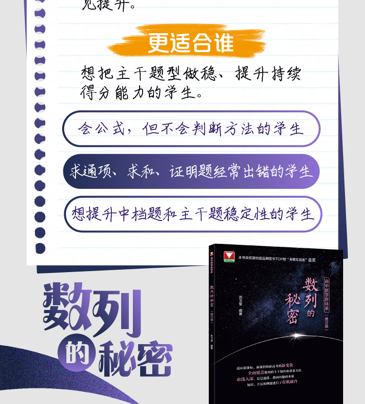 高中数学新体系“秘密”系列图书,分为《导数的秘密》《圆锥曲线的秘密》《立体几何的秘密》《数列的秘密》《向量的秘密》《概率统计的秘密》,本套书不只是学习一些数学知识,而是对数学知识进行重构,打通知识的“任督二脉”,使知识成为鲜活的知识;从系统的高度帮助学生深度学习,激活数学思维,强调独立思考与数学探究,遇到有难度、有思维深度的题目就不再慌张。《高中数学新体系(数列的秘密)》全书主要以探究的形式对数列及数列相关知识进行全方位研究。例题的呈现主要采用题型归类形式,兼顾一题多解与一题多变。难度总体上与高考相当,个别知识和方法的要求适当高于高考,部分题目到“强基”和“三位一体”难度。