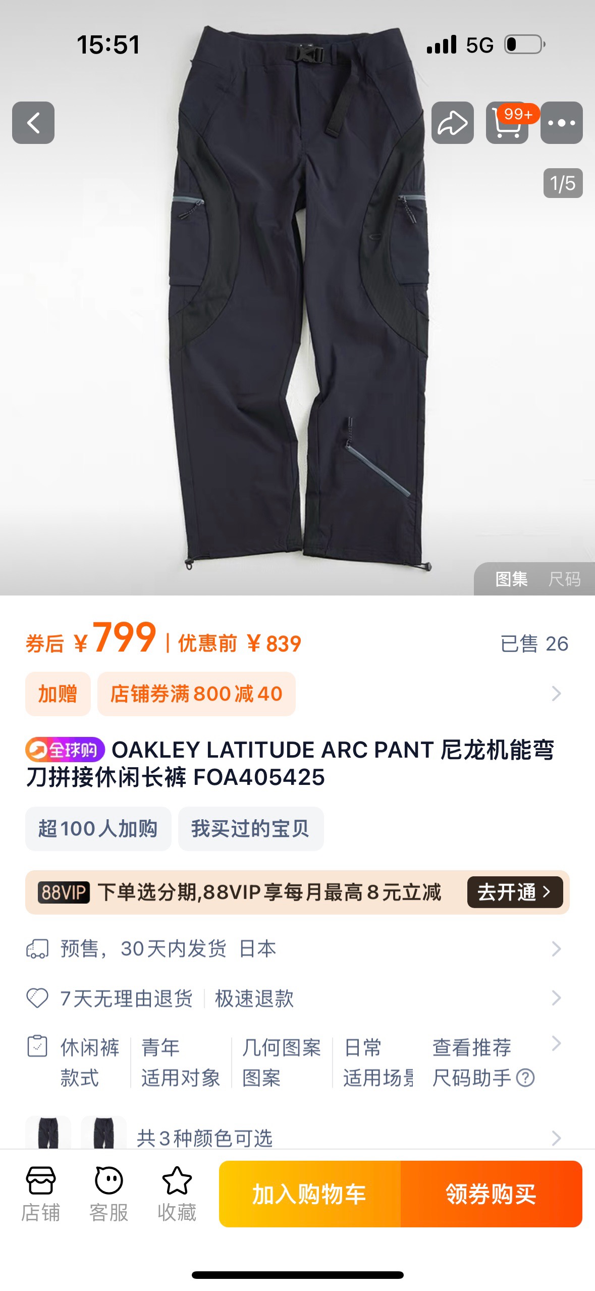 OAKLEY LATITUDE ARC PANT 25 SS 机能户外多口袋拉链腰带运动轻薄款长裤