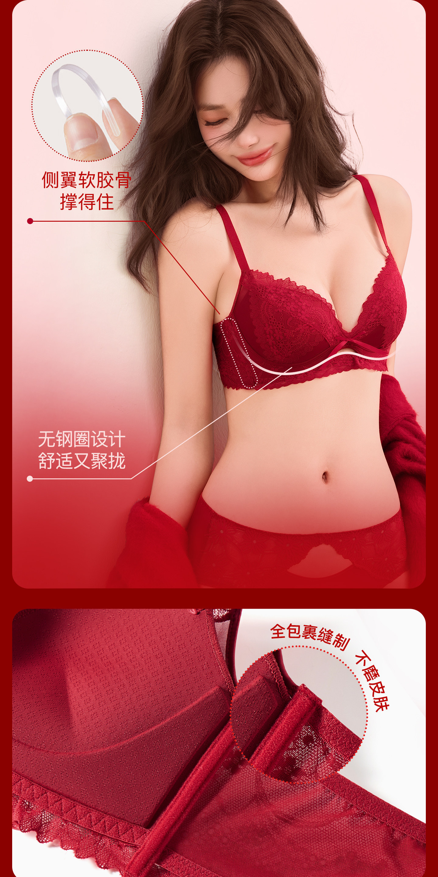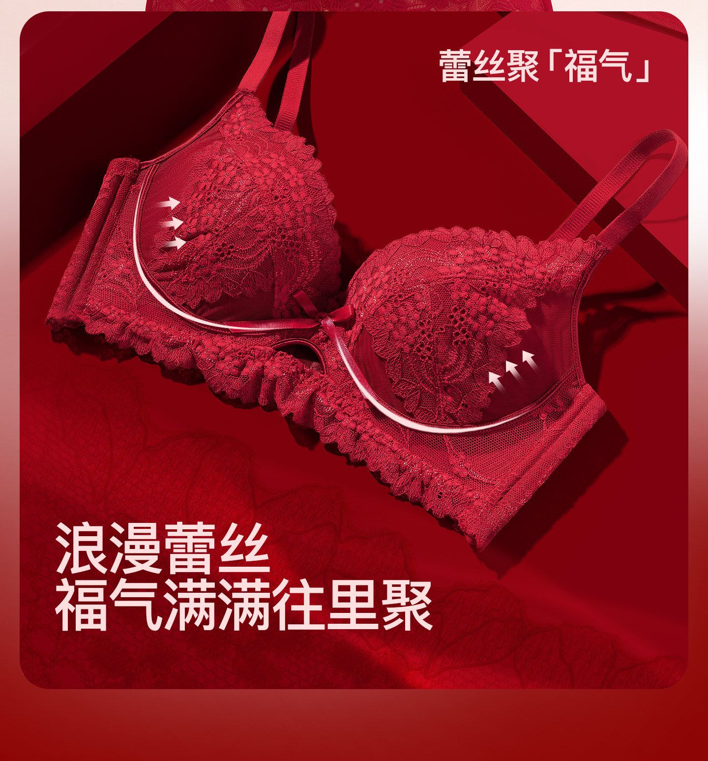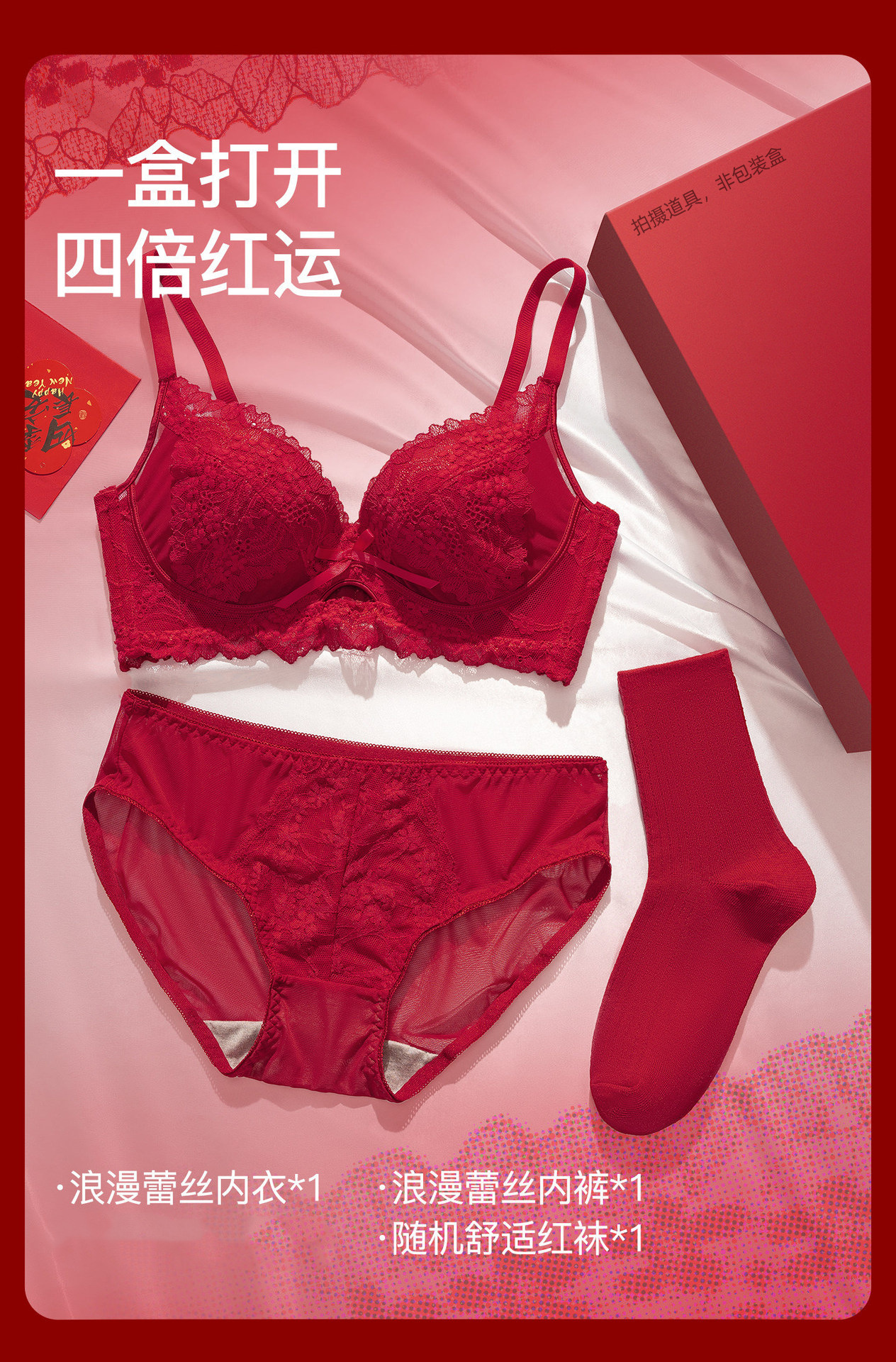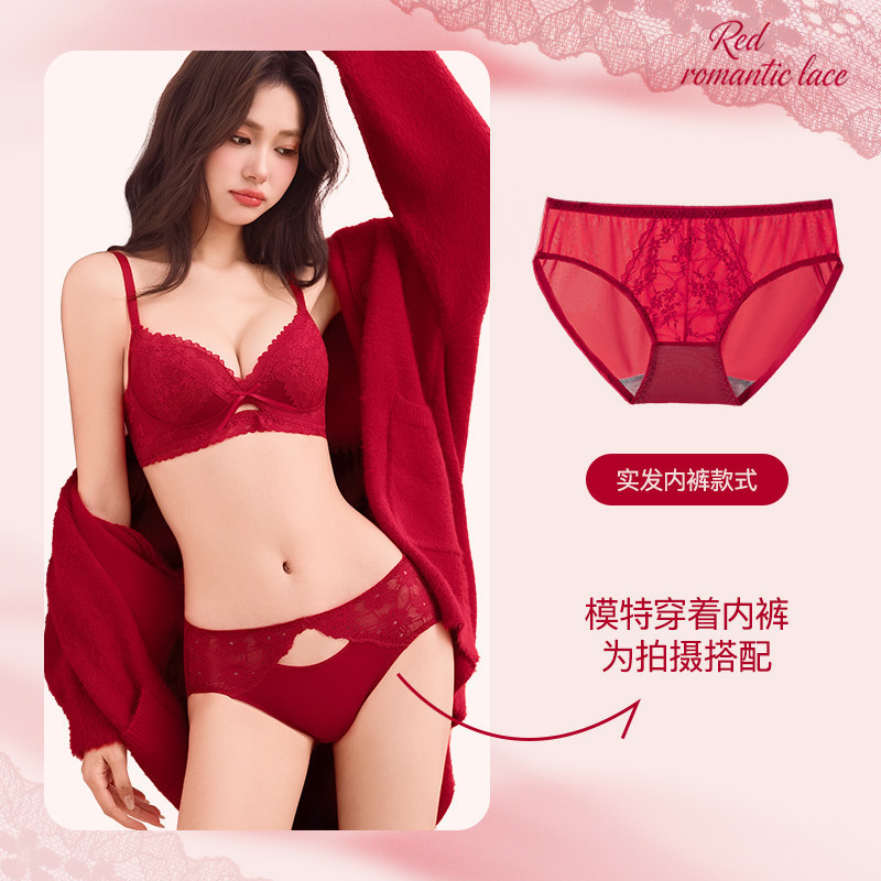 【鸿运系列!好运成套】马年结婚本命年红色内衣三件套 女套装小胸聚拢无钢圈性感蕾丝文胸罩