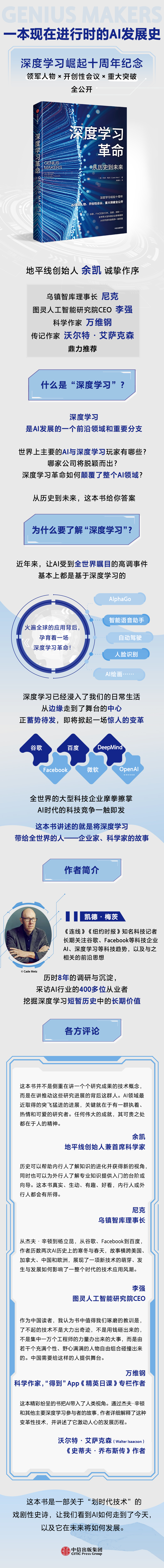 3.《连线》《纽约时报》科技记者历时8年的调研与沉淀,采访行业相关400多人,深入挖掘深度学习短暂历史中的长期价值。地平线创始人余凯诚挚作序,尼克、李强、万维钢、沃尔特·艾萨克森等人鼎力荐。