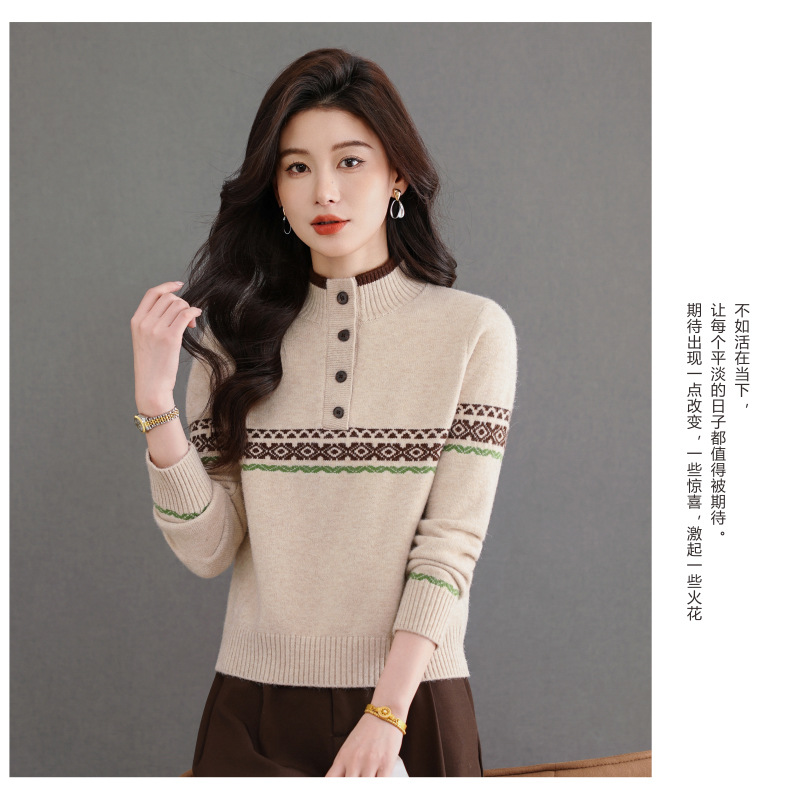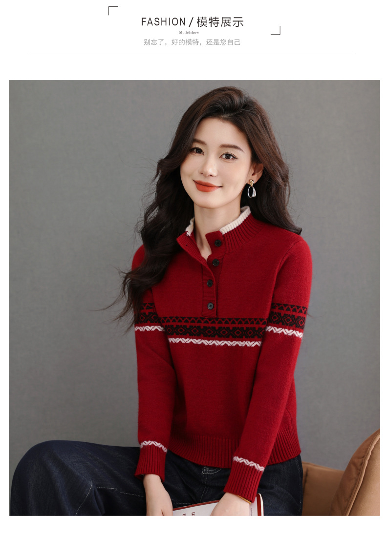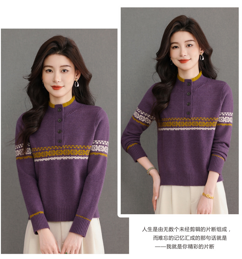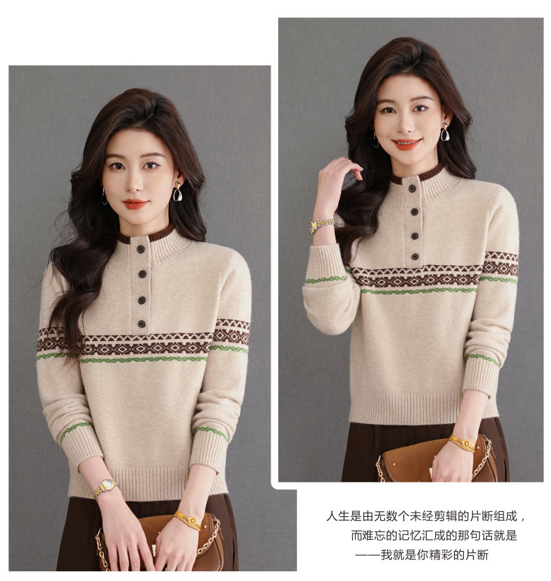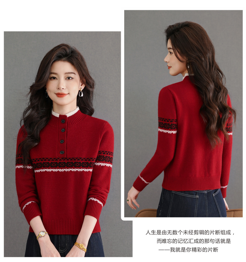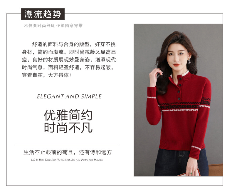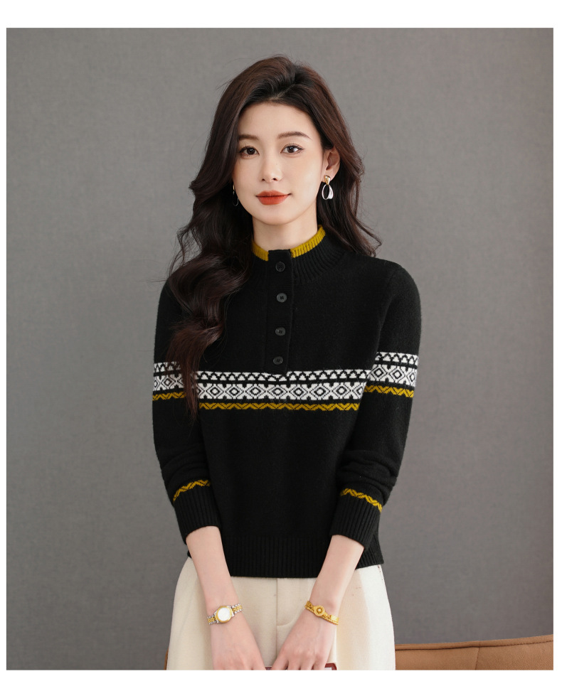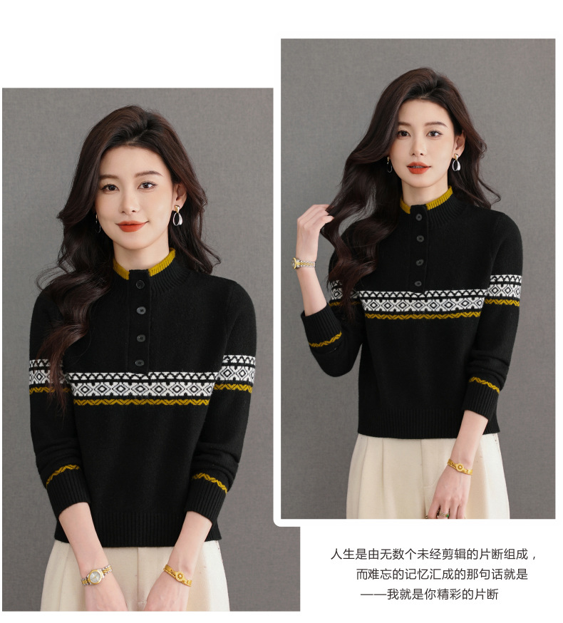 CC秋冬新款半高领多纽扣针织衫女保暖撞色条纹毛衣洋气百搭打底衫