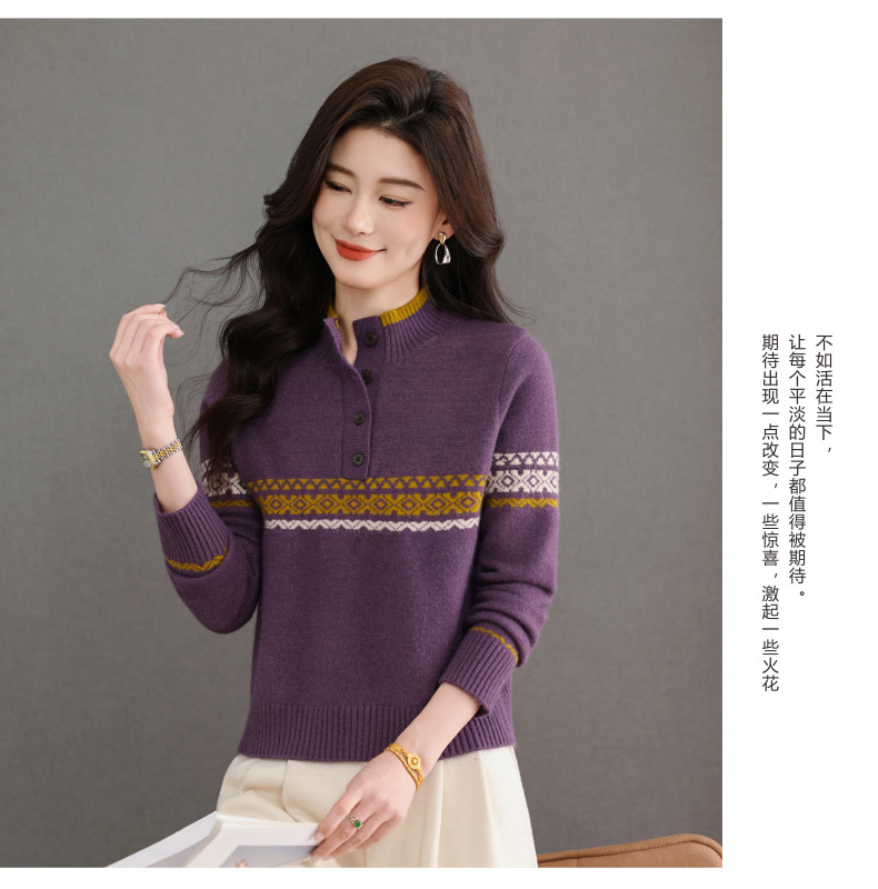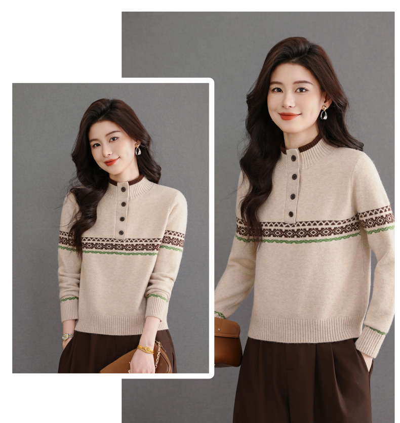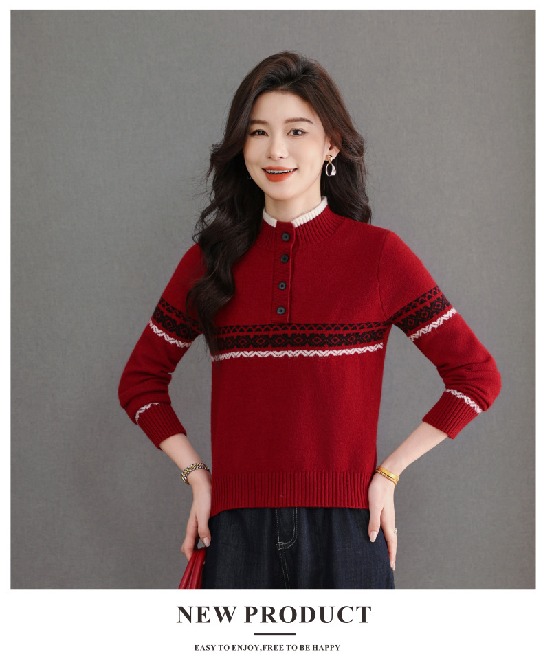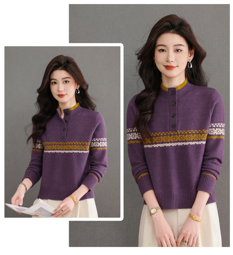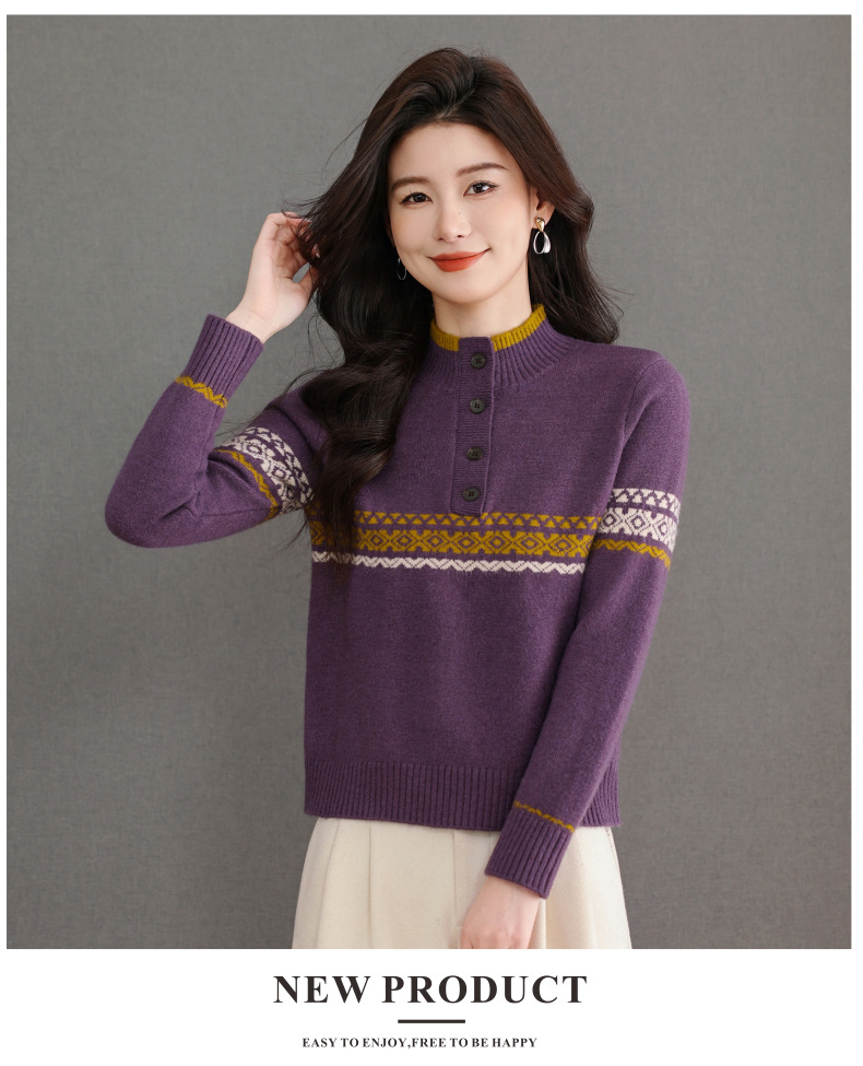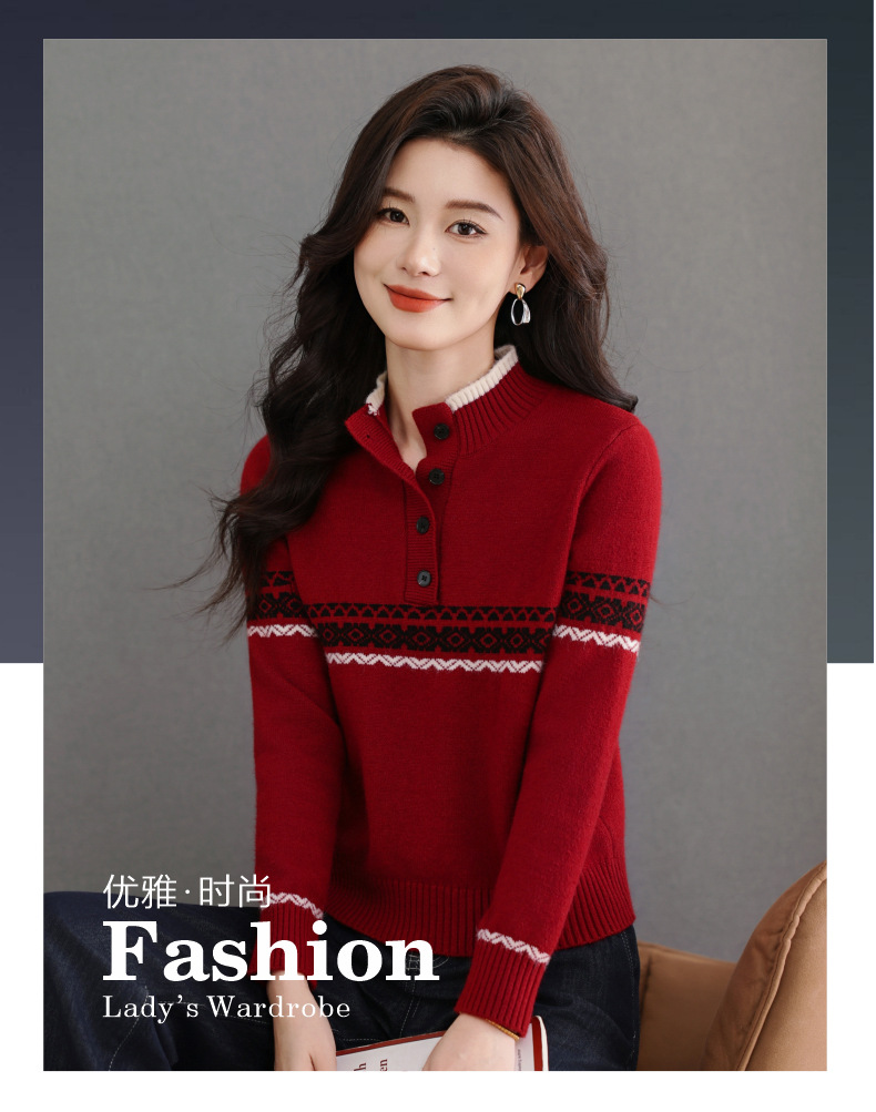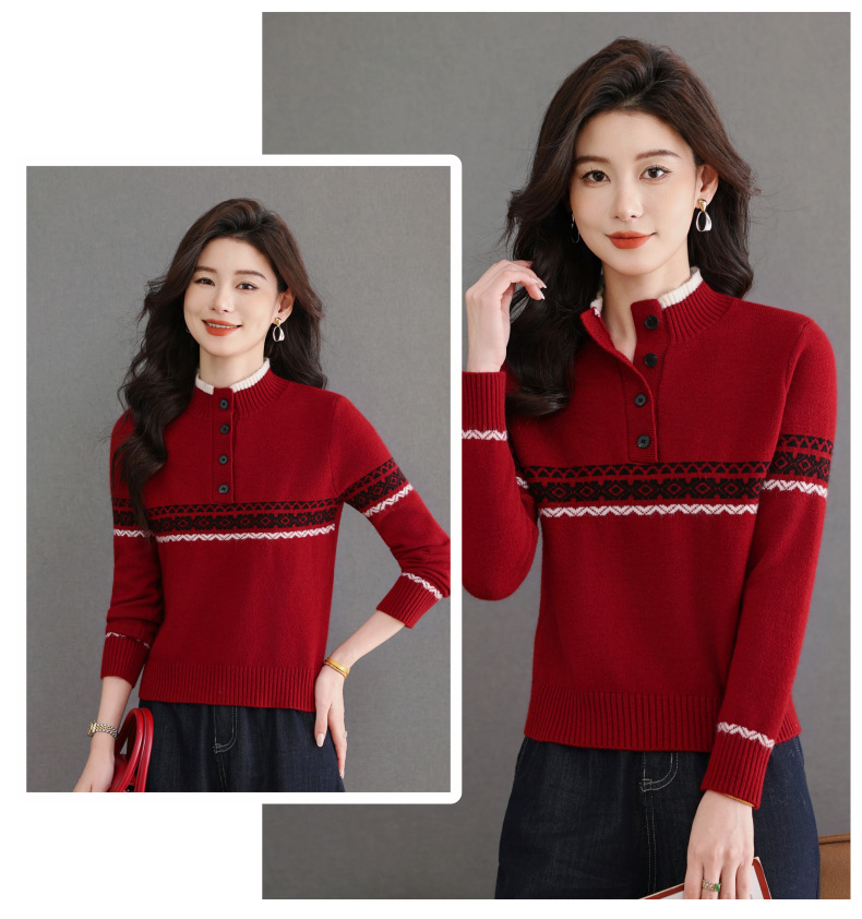 CC秋冬新款半高领多纽扣针织衫女保暖撞色条纹毛衣洋气百搭打底衫