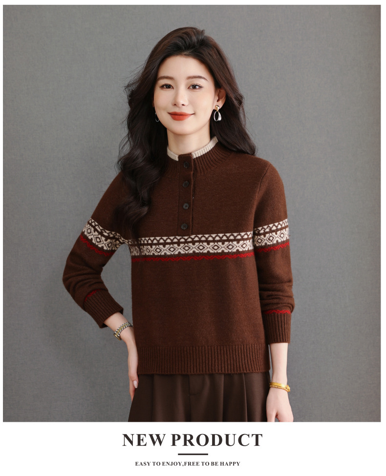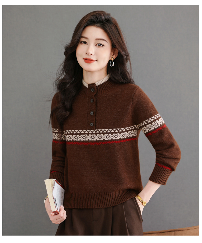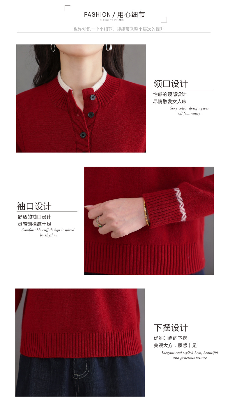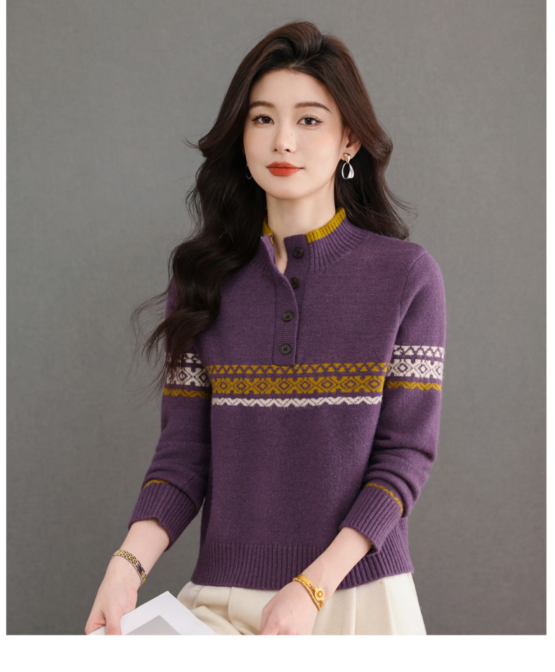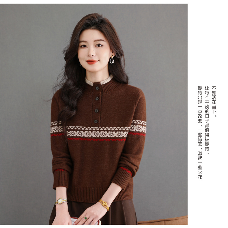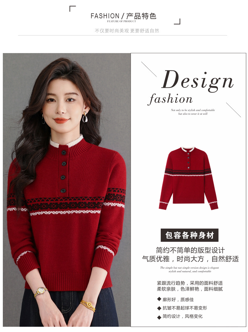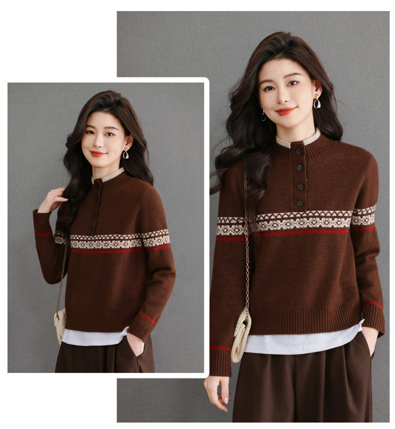 CC秋冬新款半高领多纽扣针织衫女保暖撞色条纹毛衣洋气百搭打底衫