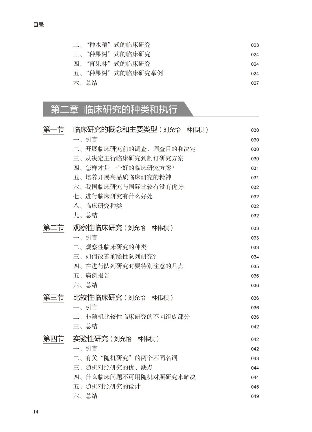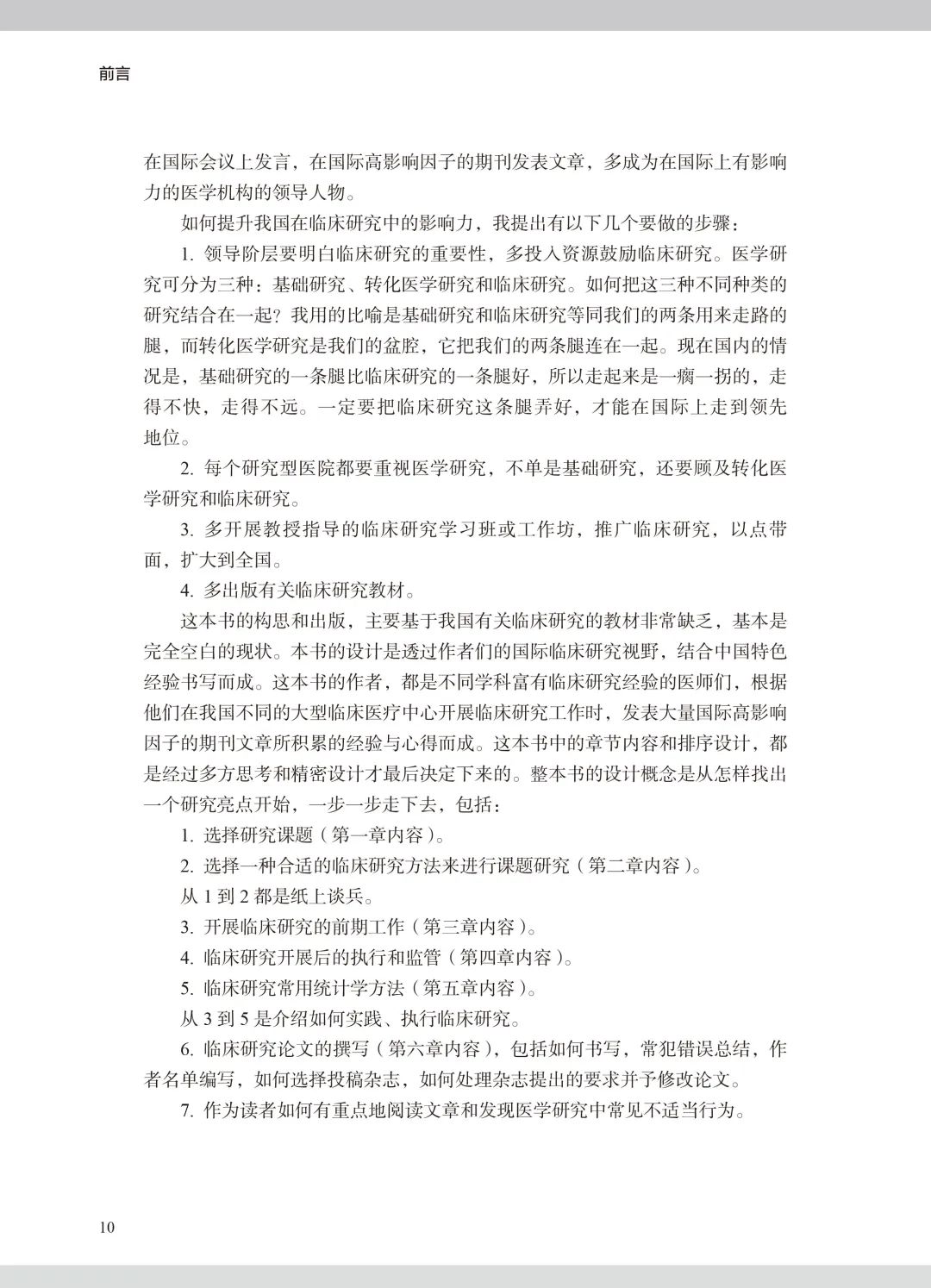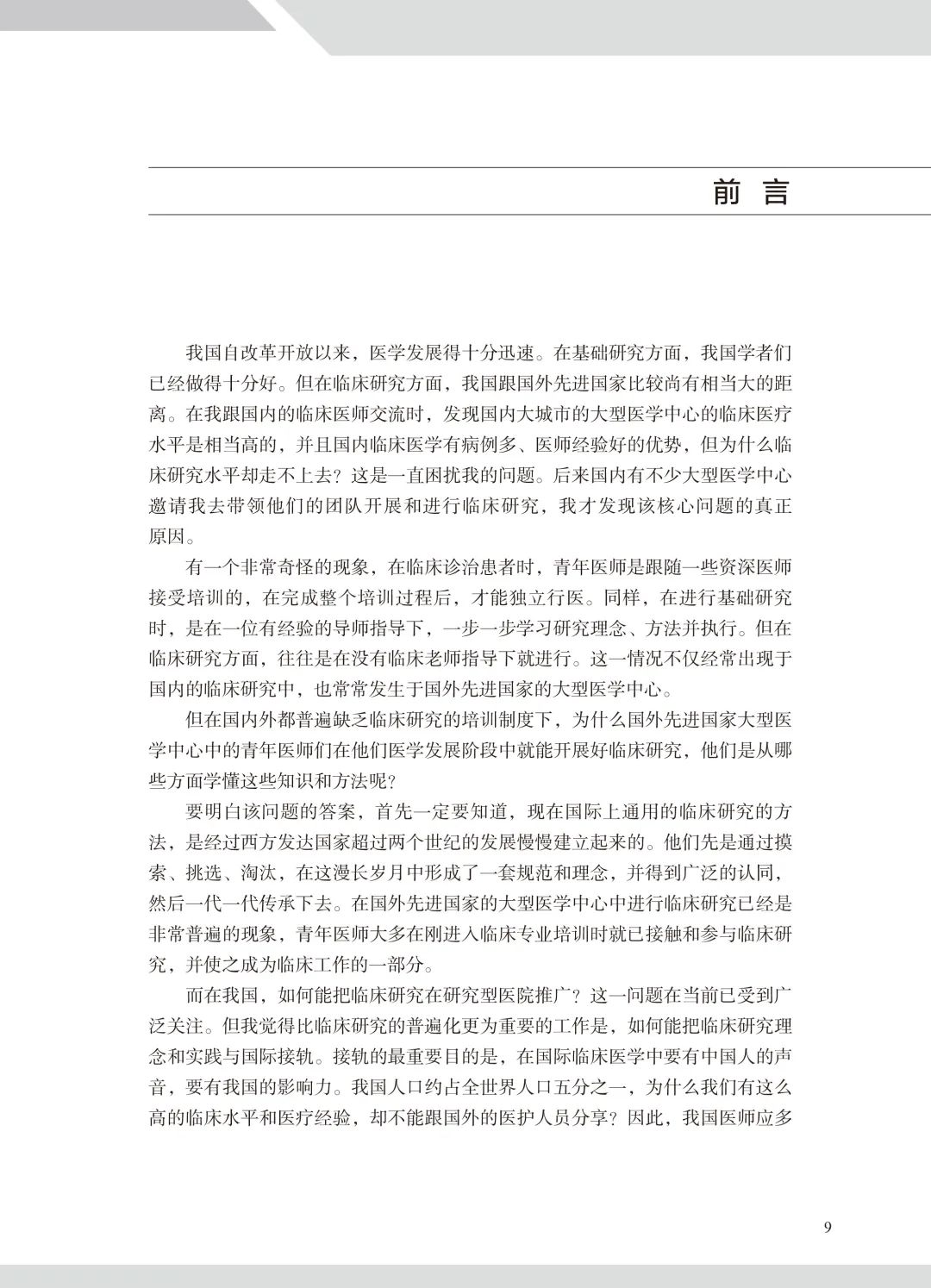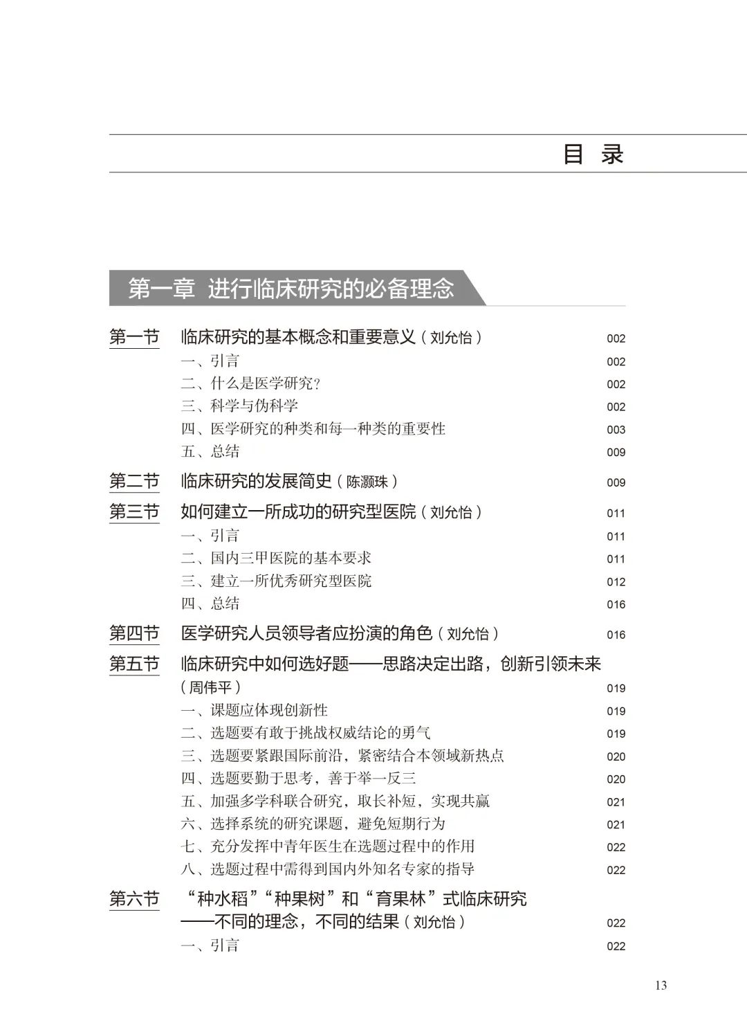 临床研究是在临床医学领域引入科学研究的概念,以临床医生为主体,以患者群体为对象,按照严格的设计、测量和评价的方法学,从患者个体诊治扩大到相应群体的研究,探讨疾病病因、诊断、治疗、预后的规律。我国基础研究做得较好,而临床医学研究与国际水平有较大差距。我国病例多,临床经验丰富,具有临床医学研究的优势,发展临床医学研究有助于促进我国临床医学的发展,提升国际影响力。刘允怡院士、陈灏珠院士在临床研究方面具有丰富的理论和实践经验,组织内科、外科、统计学等多学科专家编写本书,以期帮助临床医生树立正确的科研理念,普及正确的工作方法。