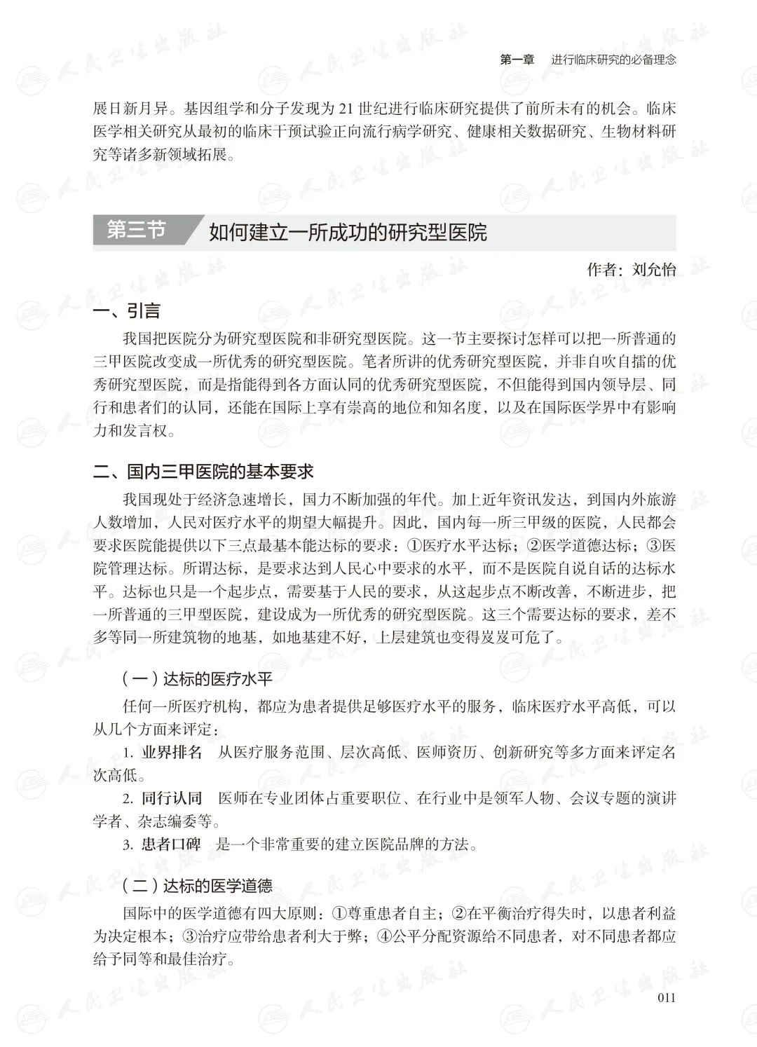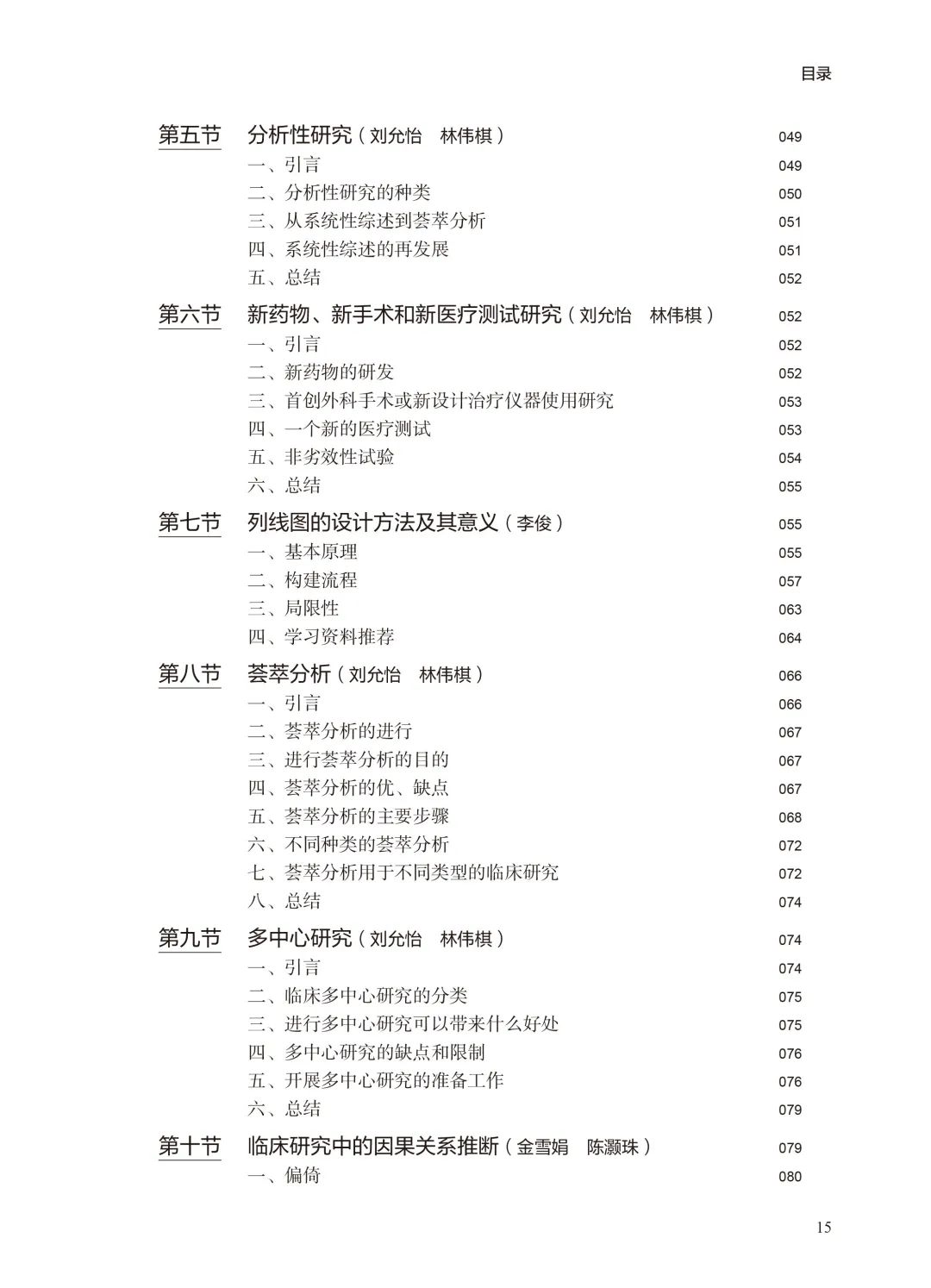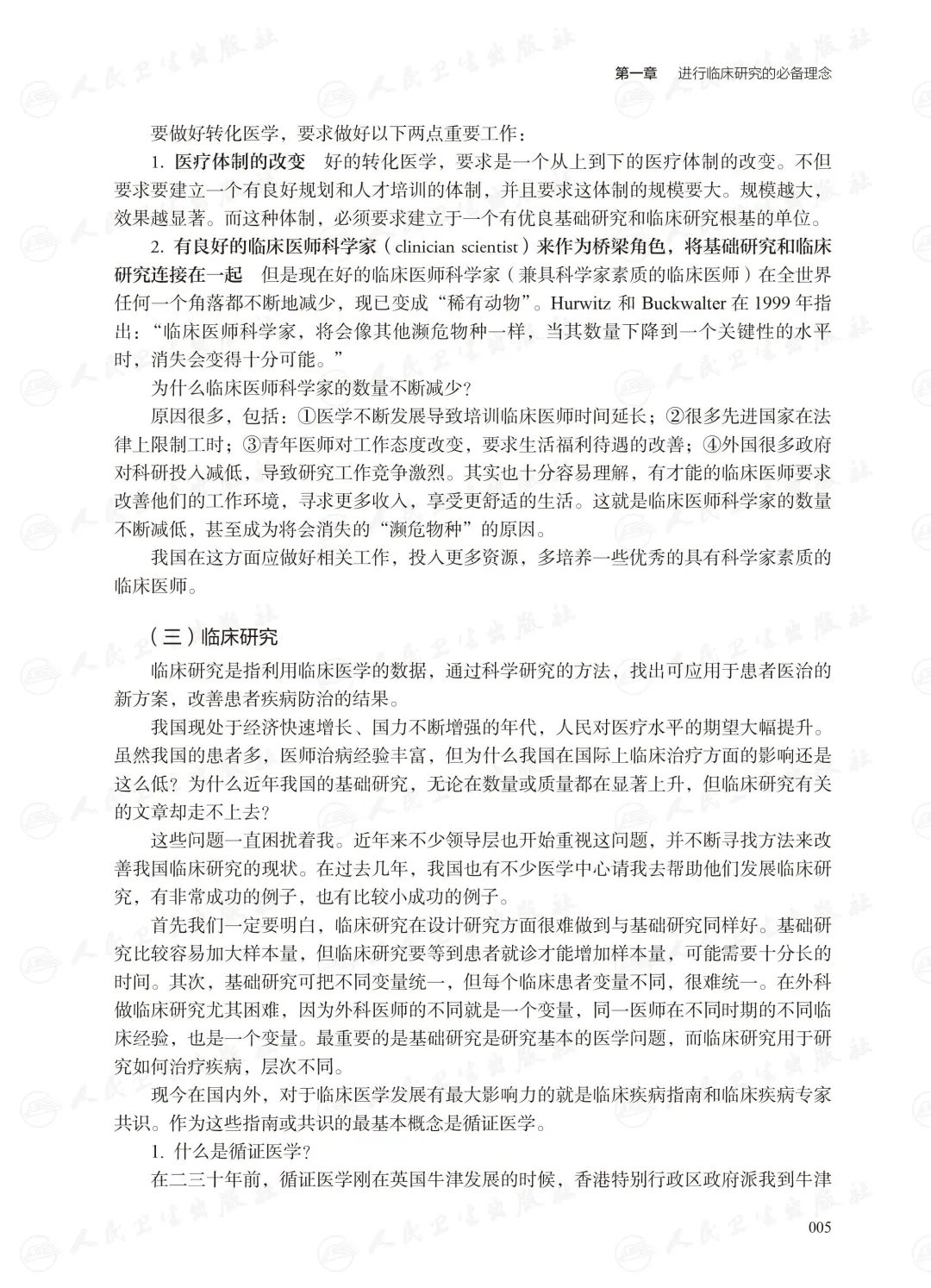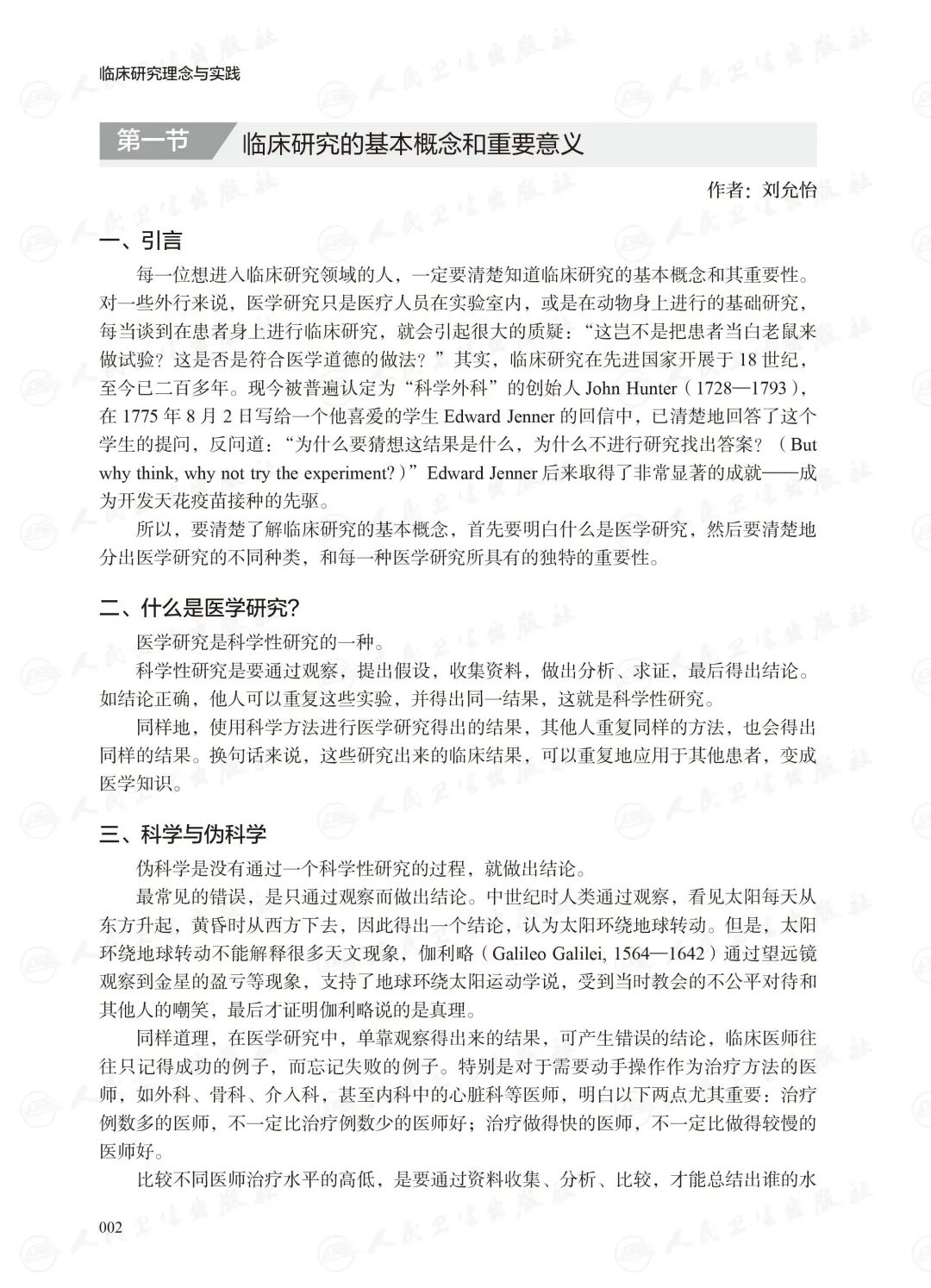 临床研究是在临床医学领域引入科学研究的概念,以临床医生为主体,以患者群体为对象,按照严格的设计、测量和评价的方法学,从患者个体诊治扩大到相应群体的研究,探讨疾病病因、诊断、治疗、预后的规律。我国基础研究做得较好,而临床医学研究与国际水平有较大差距。我国病例多,临床经验丰富,具有临床医学研究的优势,发展临床医学研究有助于促进我国临床医学的发展,提升国际影响力。刘允怡院士、陈灏珠院士在临床研究方面具有丰富的理论和实践经验,组织内科、外科、统计学等多学科专家编写本书,以期帮助临床医生树立正确的科研理念,普及正确的工作方法。