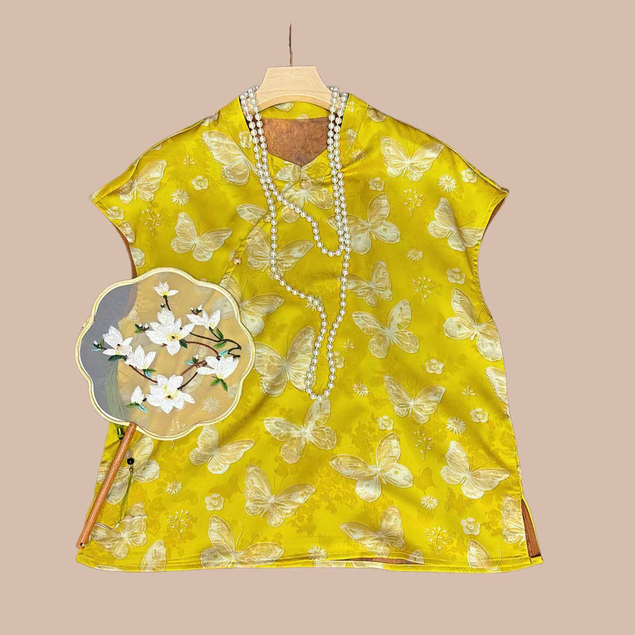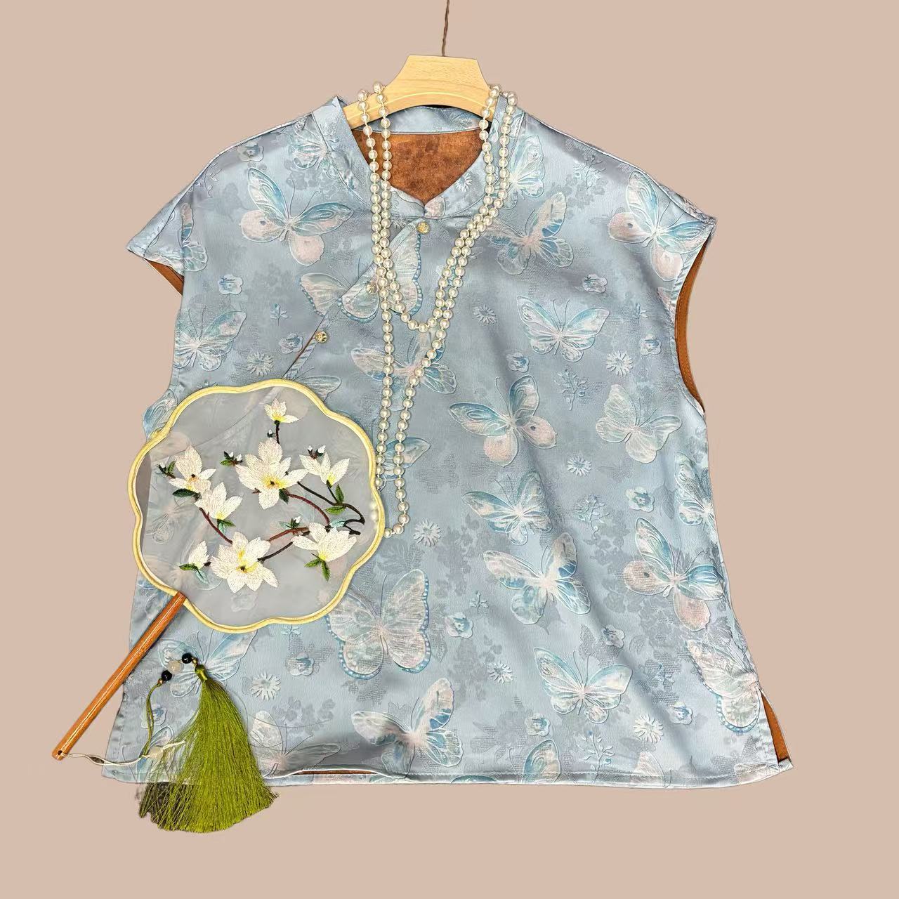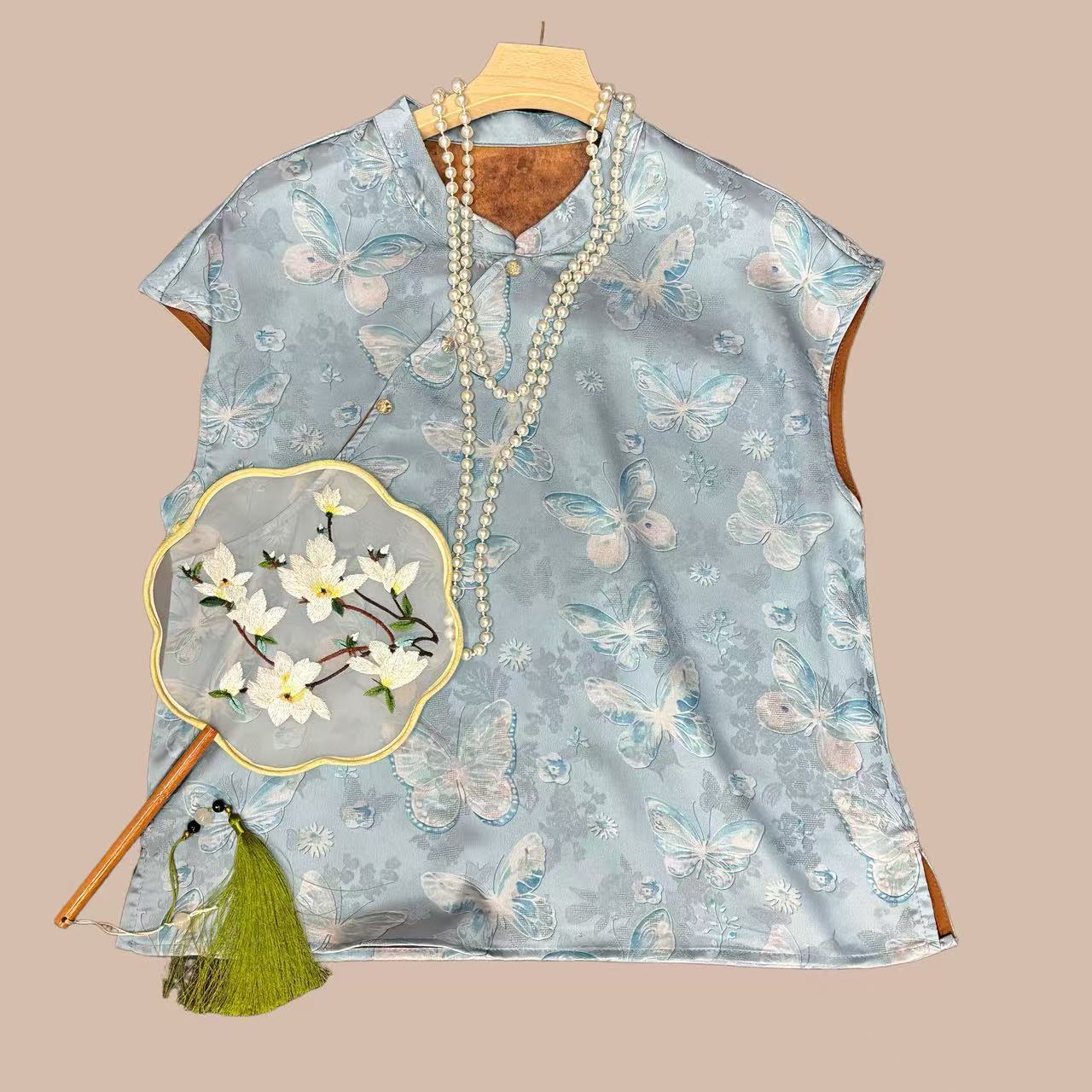 丁摩 新中式国风立领百搭蝴蝶提花人丝仿香云纱衬衫上衣女宽松5ZF-011