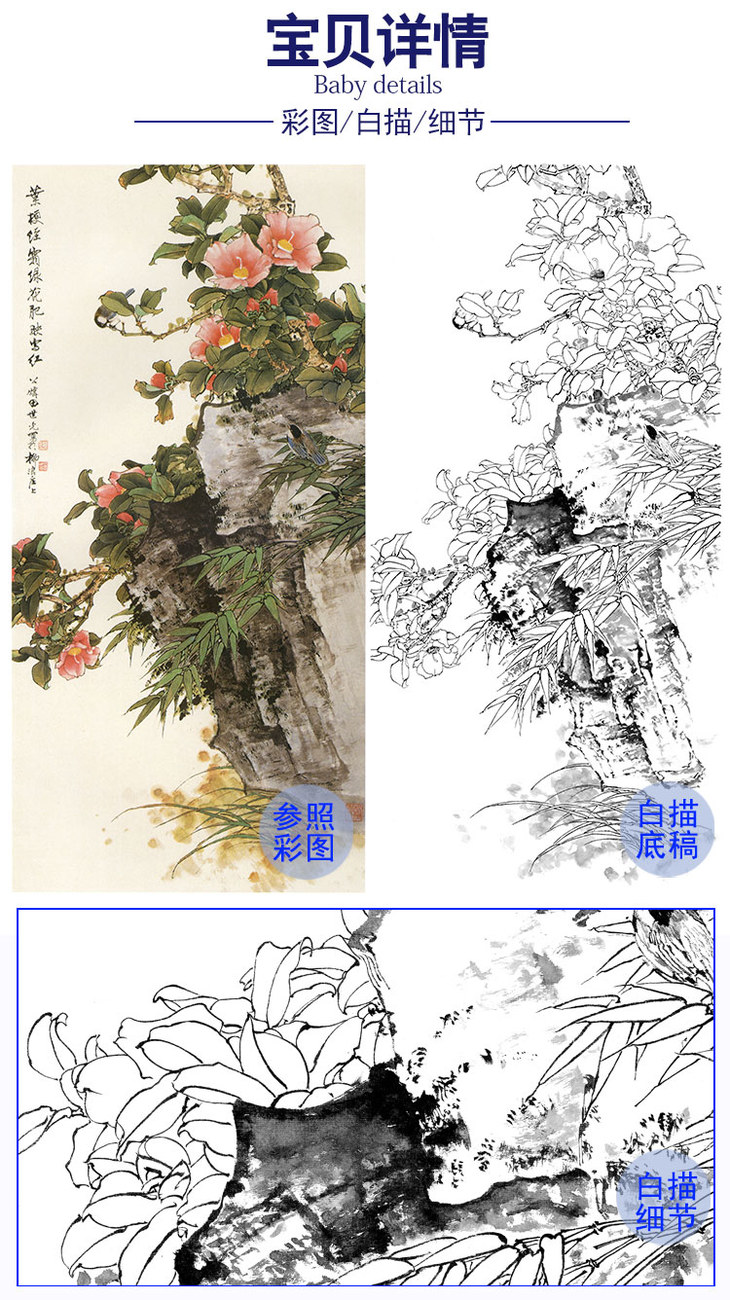 田世光工笔竖幅花鸟白描底稿-茶花-SG65