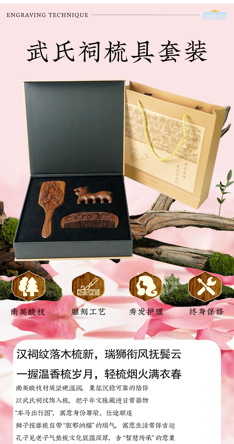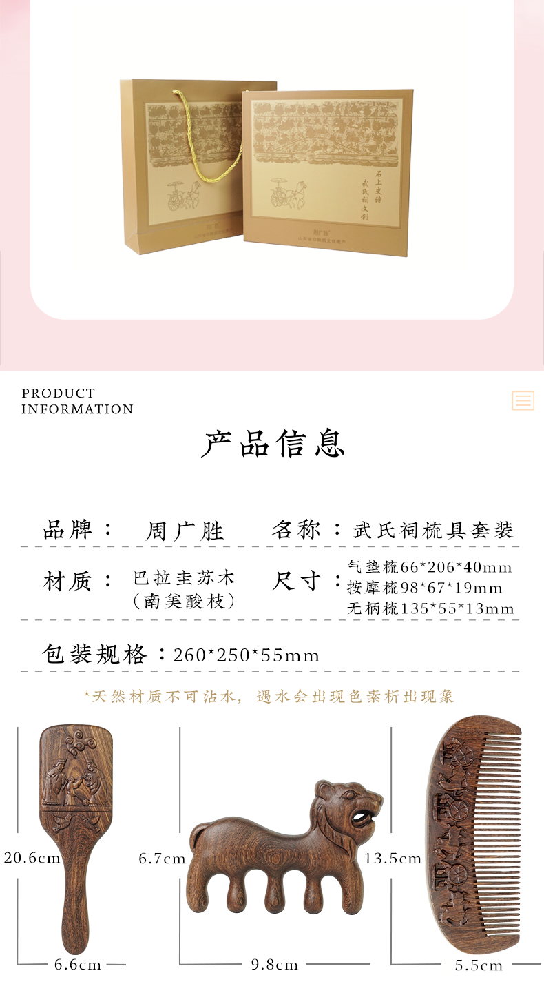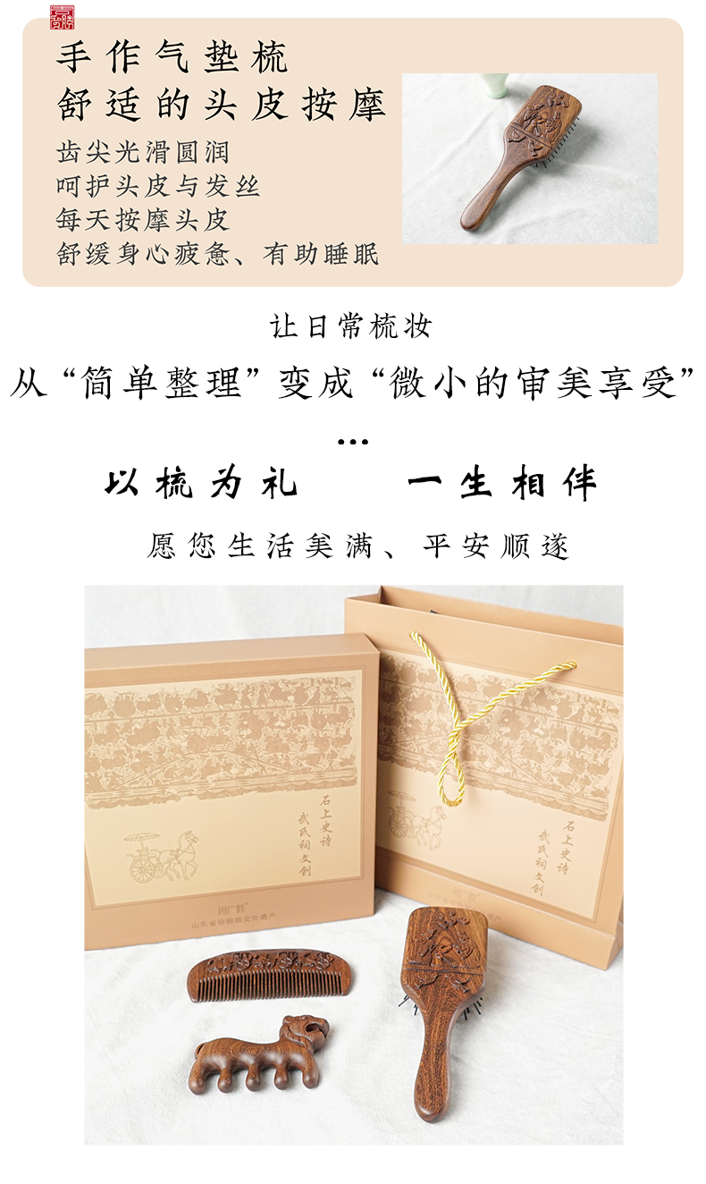 周广胜精选武氏祠文创按摩梳套装家用头部经络梳实木气垫梳送朋友