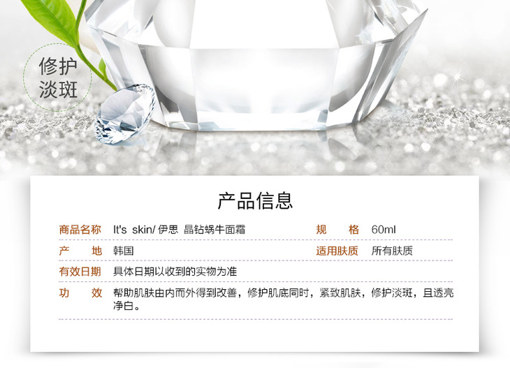 伊思晶钻蜗牛面霜60ml伊思晶鑽金蝸牛霜 💝想要白滑美肌,但臉上又有紅血絲、又有痘印未好怎麼辦 😥 選一瓶全效修復面霜就可以啦 ❤ It’s Skin伊思晶鑽美肌蝸牛活膚面霜之所以能成為第一蝸牛霜品牌,創下全球每6秒售出一瓶的佳績 👍 就是因為此品能兼具美白、淡斑、去疤痕、痘印、收毛孔之功效✨,亦能夠使受損的細胞即時修復並促成再生,讓皮膚變得更加滋潤亮白有光澤 👸