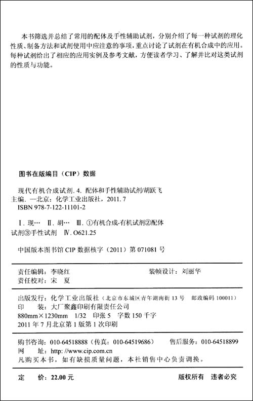 《现代有机合成试剂(4):配体和手性辅助试剂》由化学工业出版社出版。