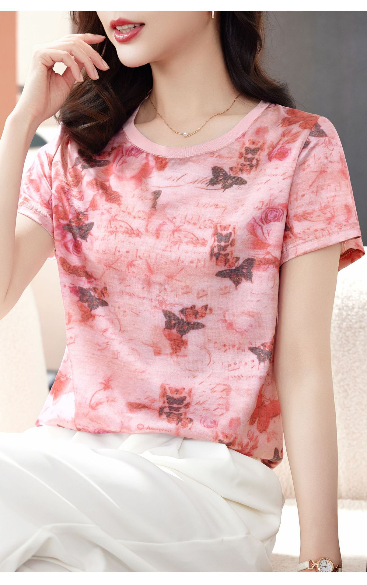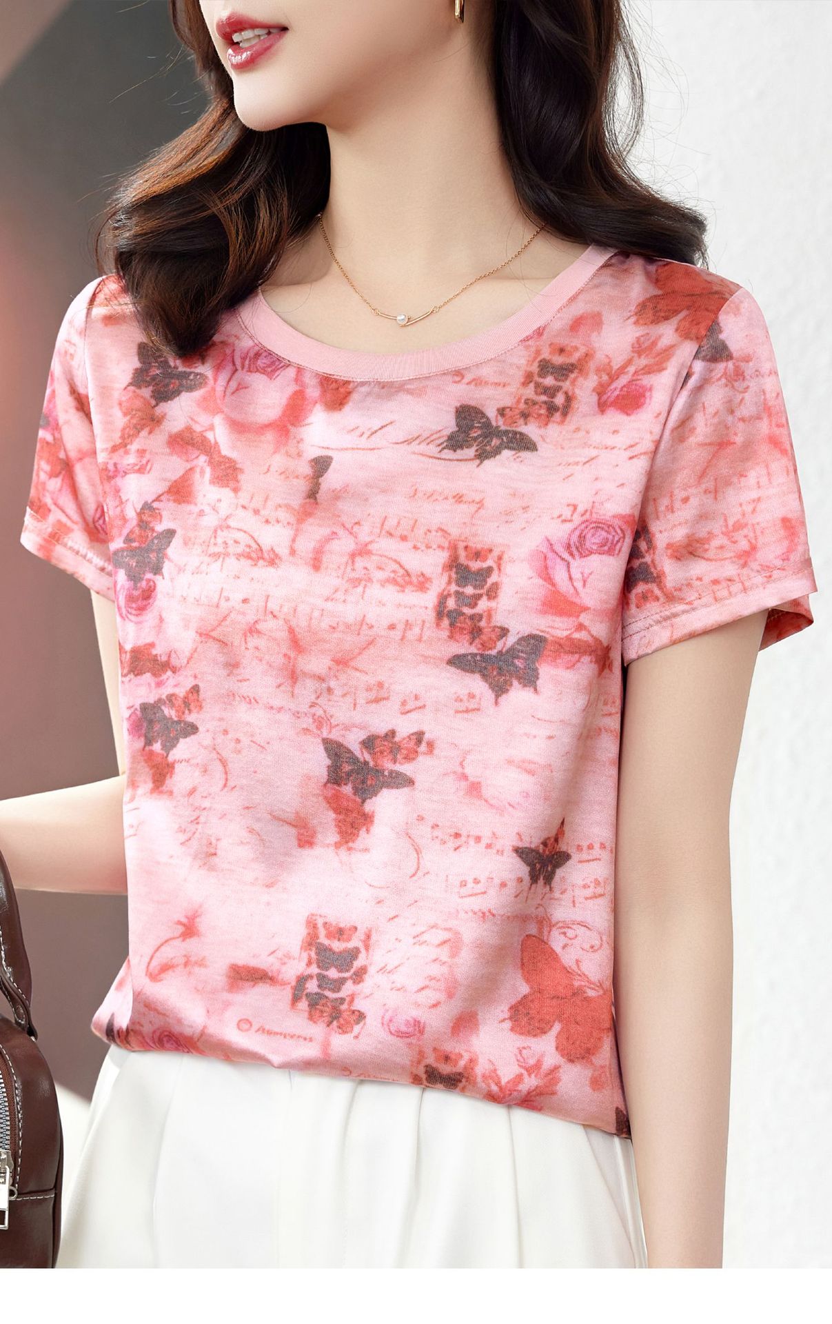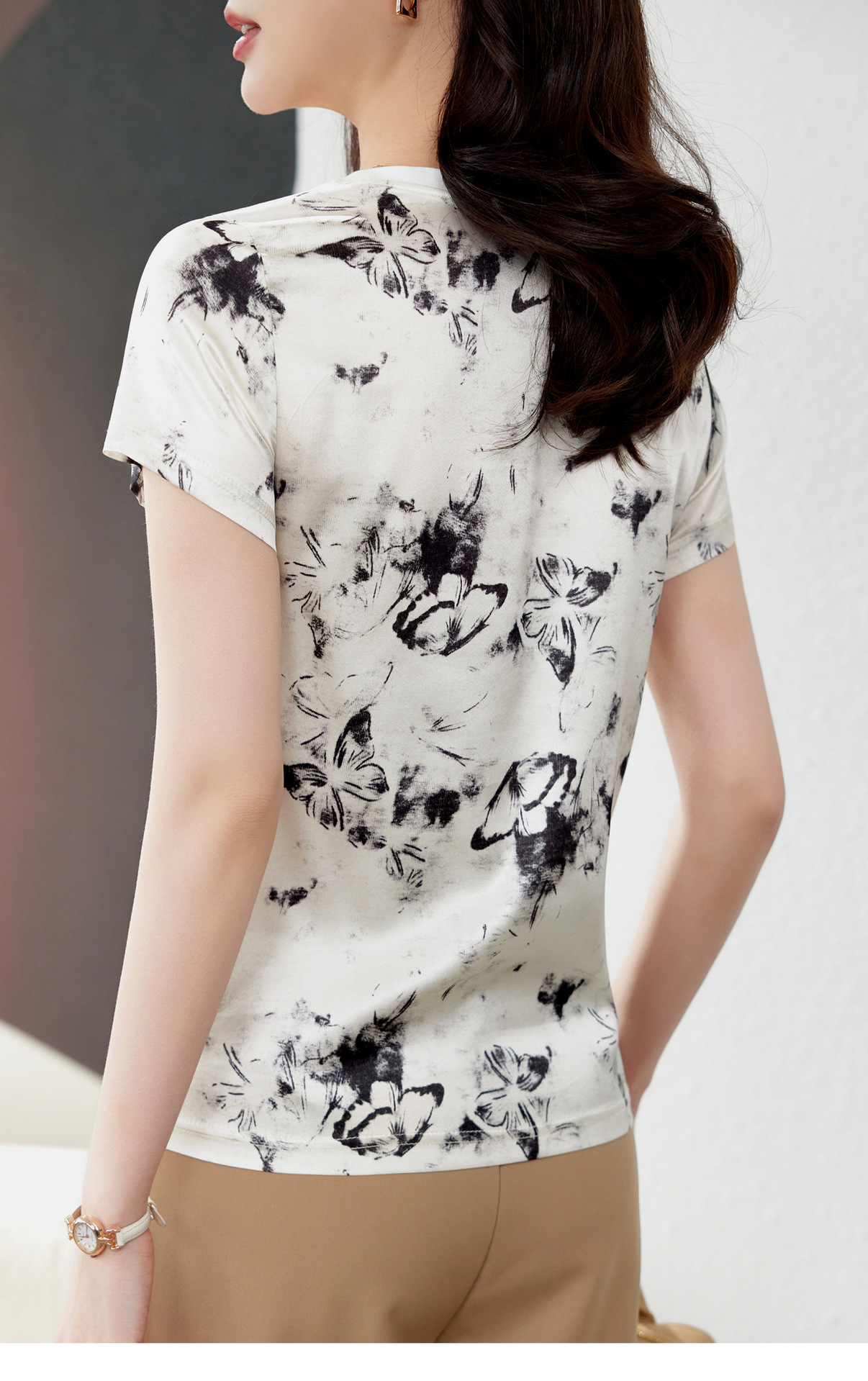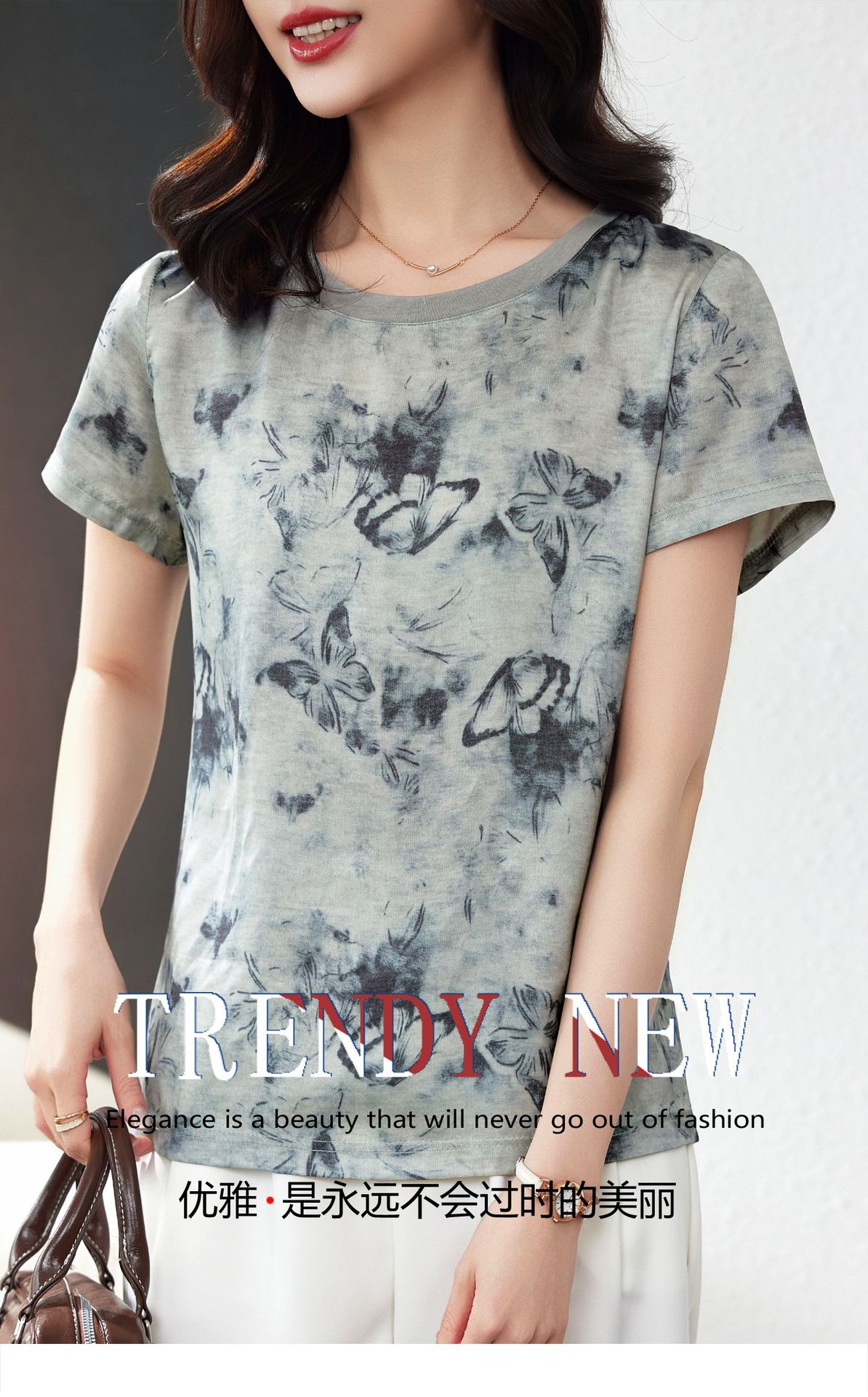 丁摩 真丝圆领印花桑蚕丝T恤上衣 商品图1