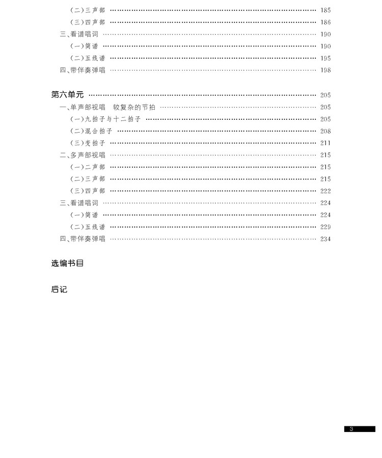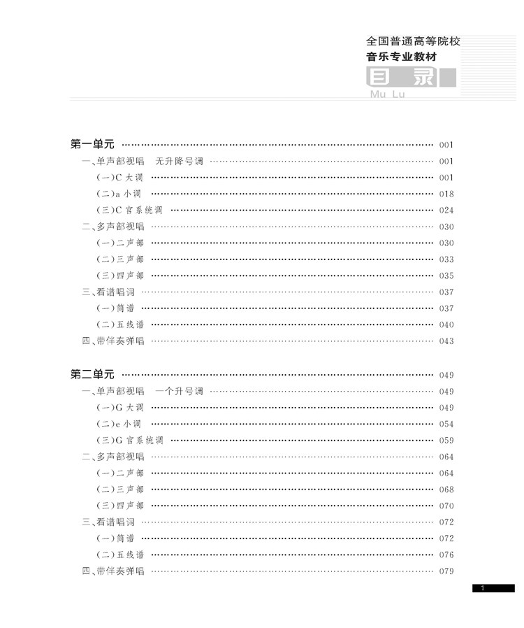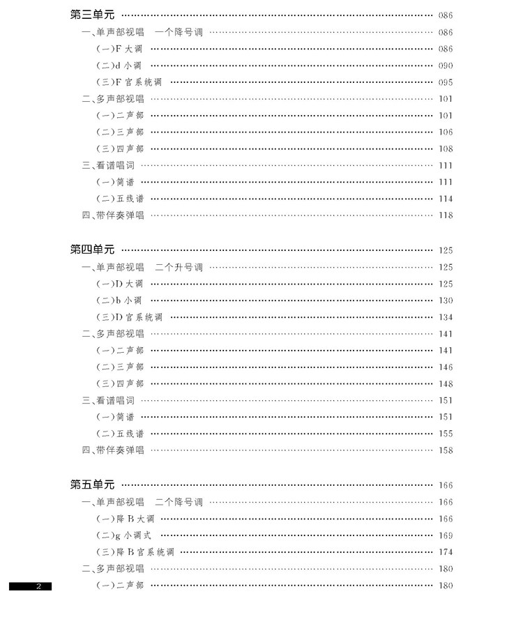 该书上册共六个单元,从C大调到二个升降号到较复杂的节拍等,在每一单元都编排了四个方面的内容,以多种形式系统、全面地训练学生的视唱能力。每个单元包括1.单声部视唱、2.多声部视唱、3.看谱唱词、4.带伴奏弹唱,内容全面,由浅入深,更利于学生理解学习。特别是看谱唱词和带伴奏弹唱两部分,对培养学生视唱能力和即兴视唱音准有很大帮助。