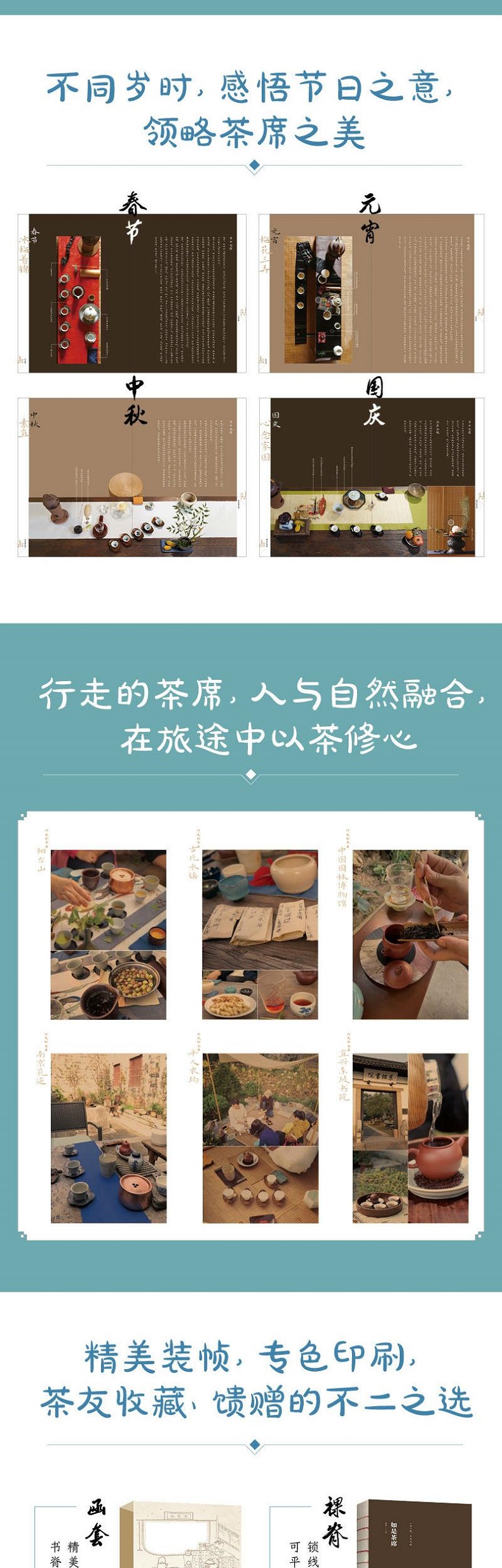 以岁时生活图解茶席的布局。作者在茶席的基础布局和变化中,引入一年四季不同节日的茶席,并配以多张茶席展示,在对节日之意、茶席主题、主器物和主泡茶的认识中,让读者感悟到时空运行与内心的交织,呈现在当下的生活茶席之中。