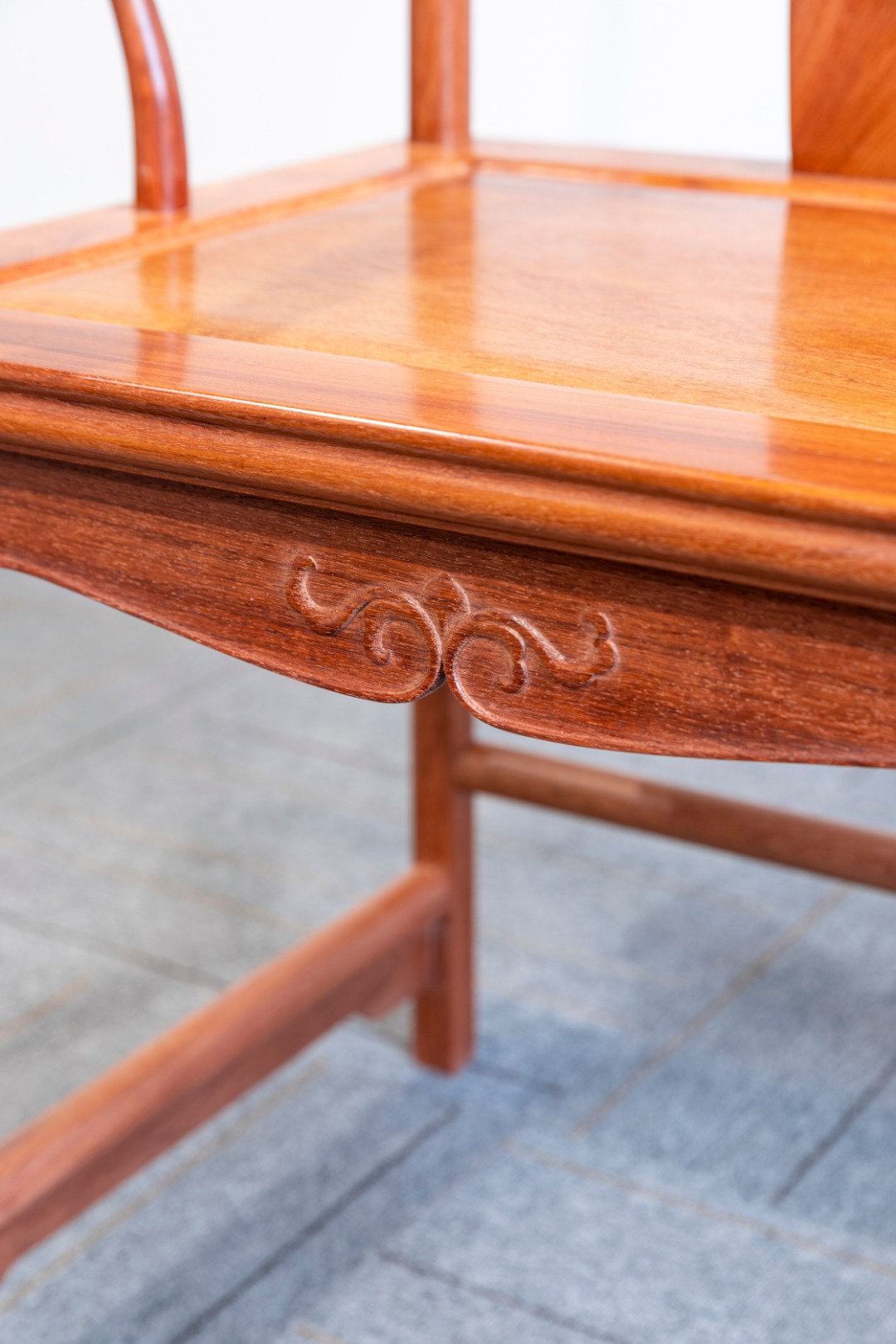 搭脑中部削出斜坡成枕,搭脑两端与扶手尽头都削平,与圆头处理一样,是四出头官帽椅的基本造法,三弯靠背极高,浮雕朵云双螭纹,后腿在椅盘面以上,随靠背弯转,椅盘下用壶门式卷口牙子,用料窄且线条柔和,与整体相谐,券口正中有尖,造卷草纹,除踏枨外,两侧枨下并未加牙板较为独特,整体长短相形,上下弯直相倾,可谓音声相和、前后相随。