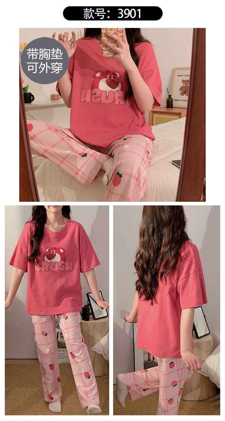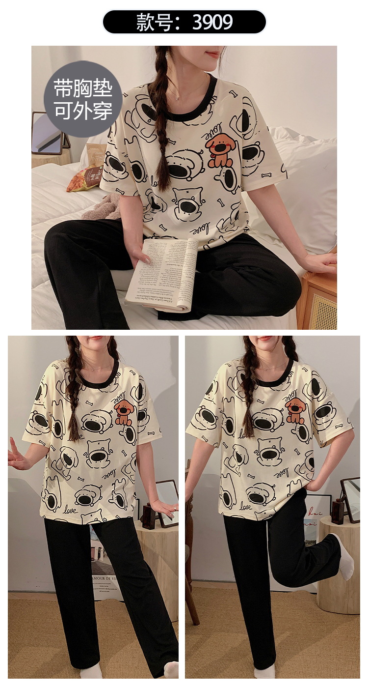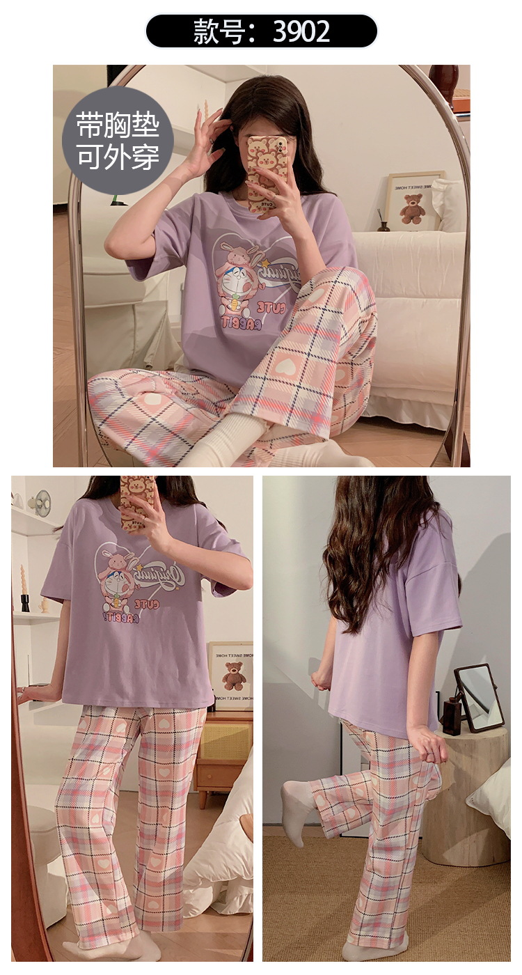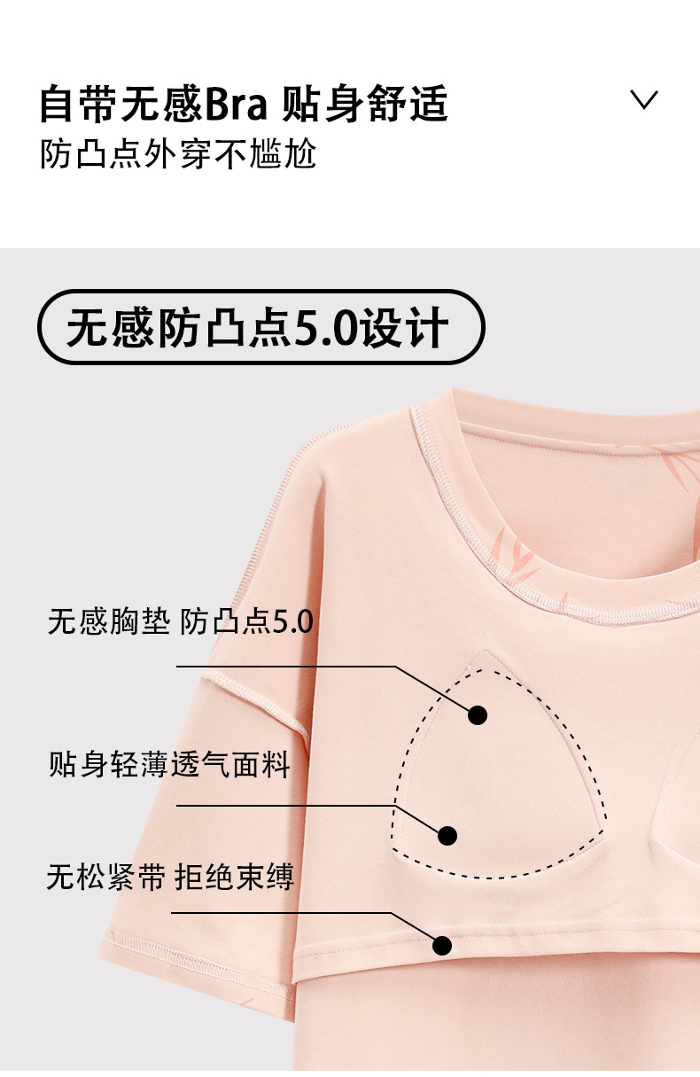 【自带无感Bra 贴身舒适 防凸点外穿不尴尬】2024夏季新款带胸垫睡衣 女棉质短袖长裤 可外穿薄款 女士家居服-QQ