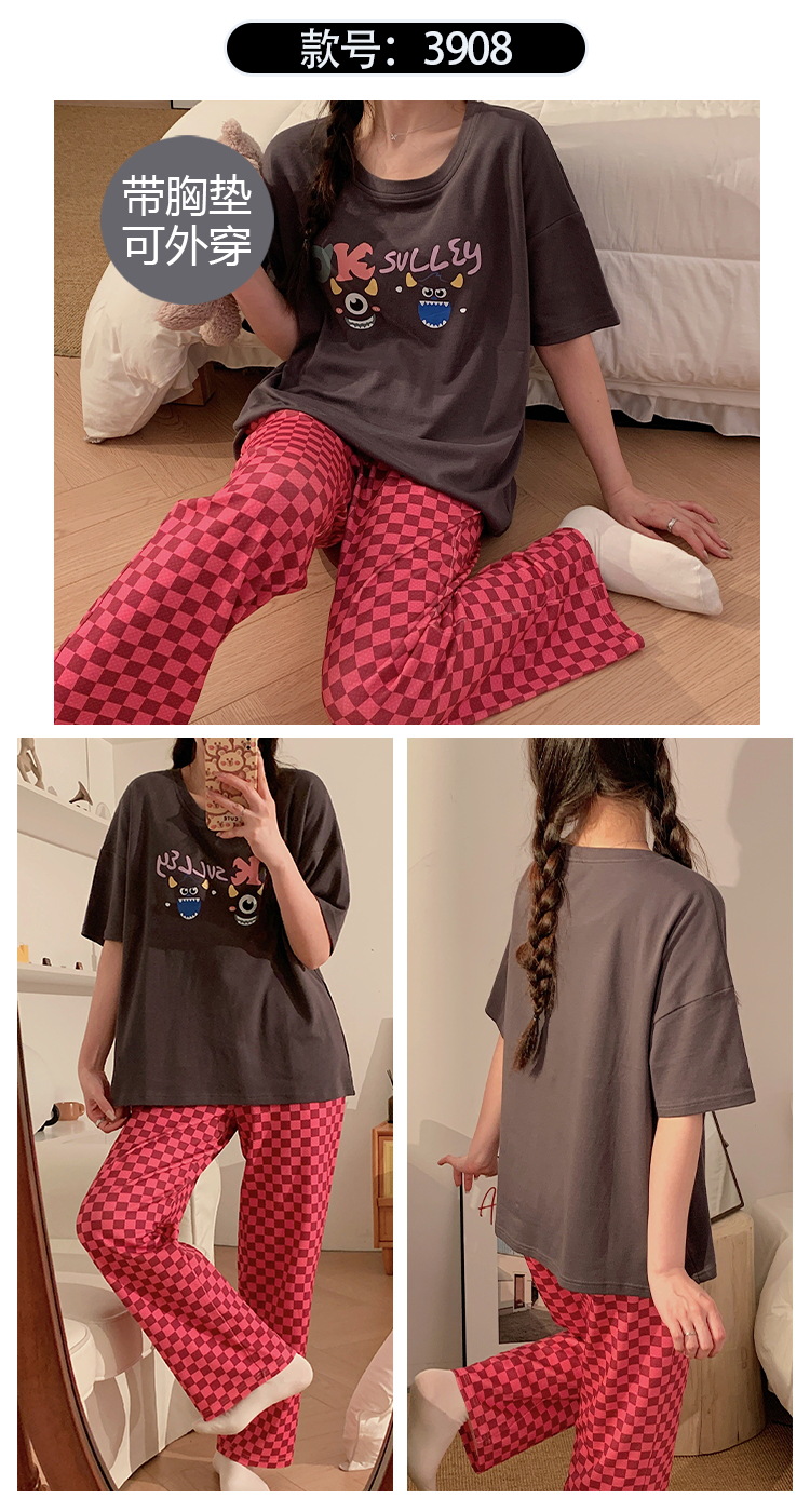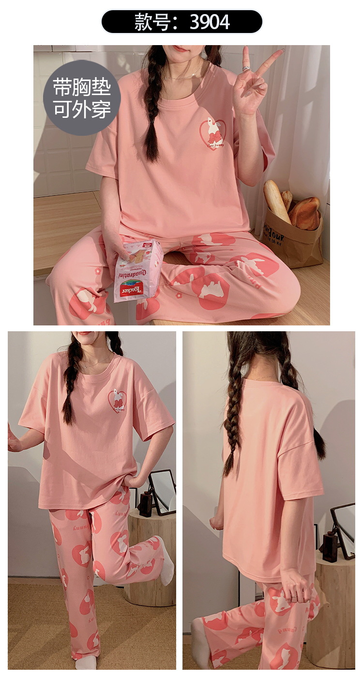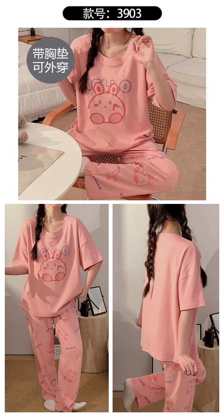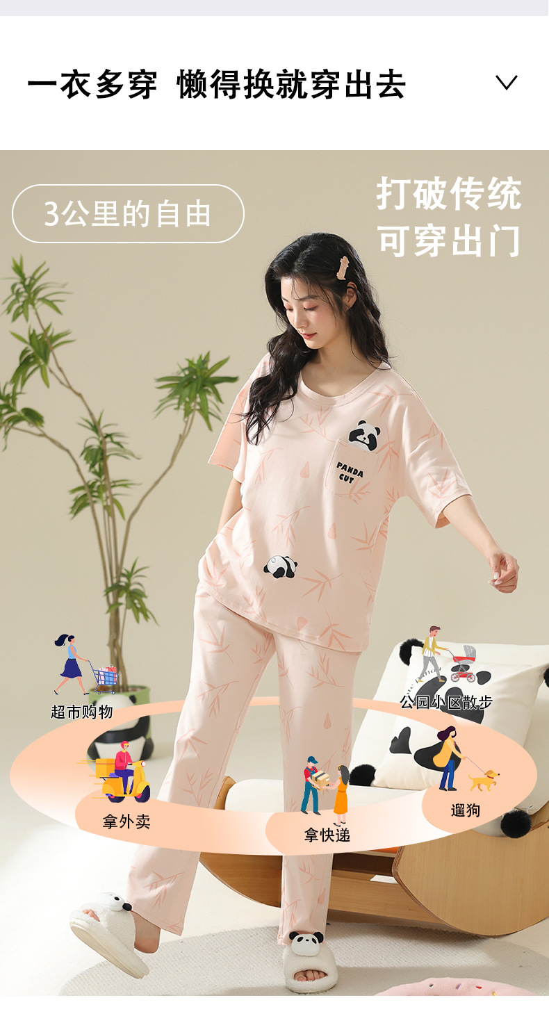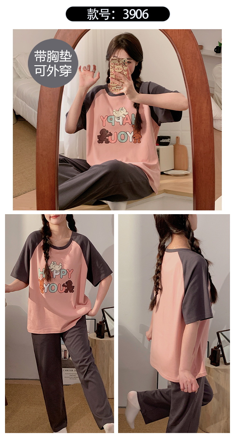 【自带无感Bra 贴身舒适 防凸点外穿不尴尬】2024夏季新款带胸垫睡衣 女棉质短袖长裤 可外穿薄款 女士家居服-QQ