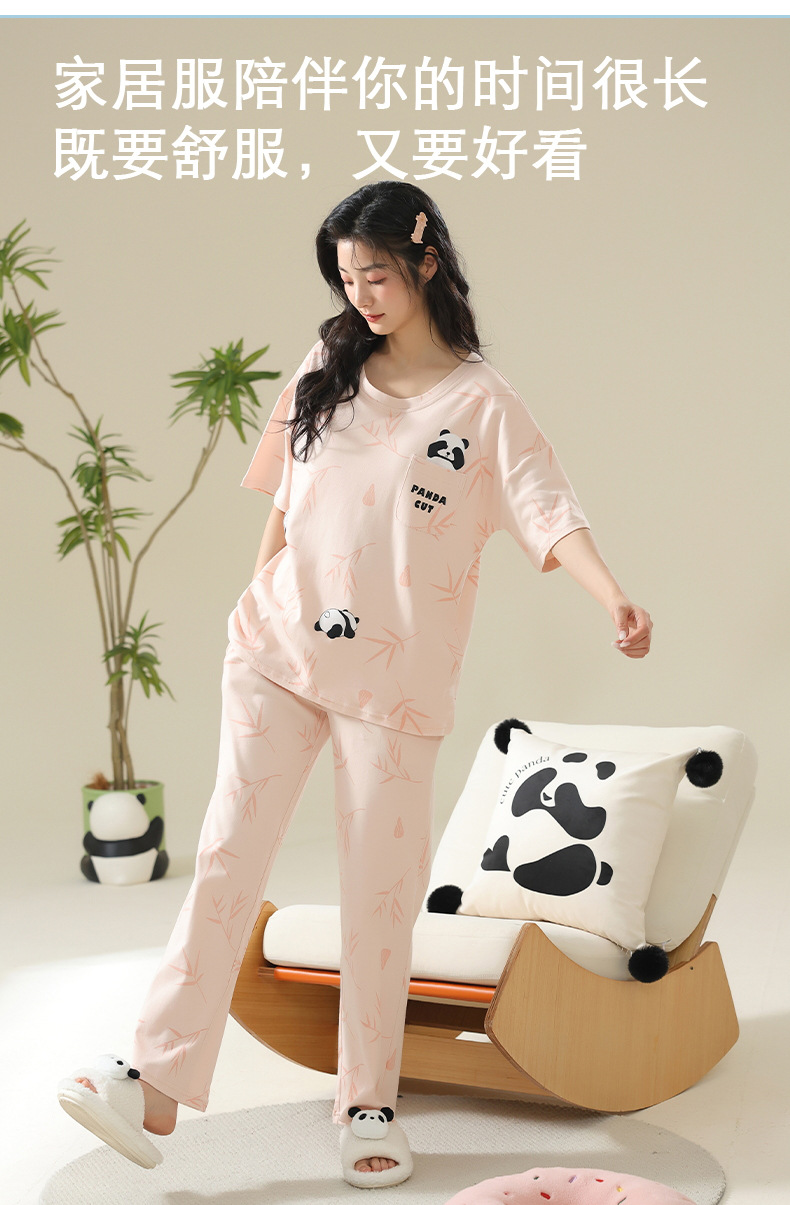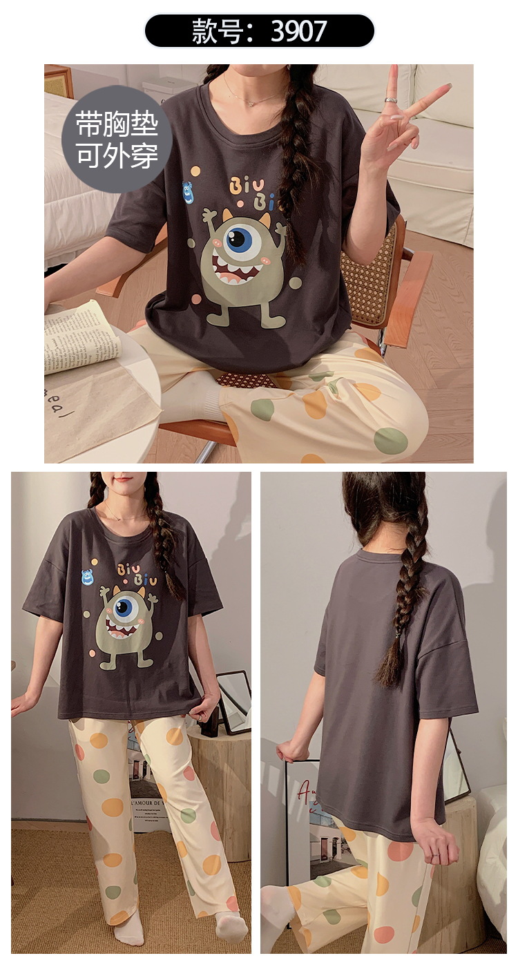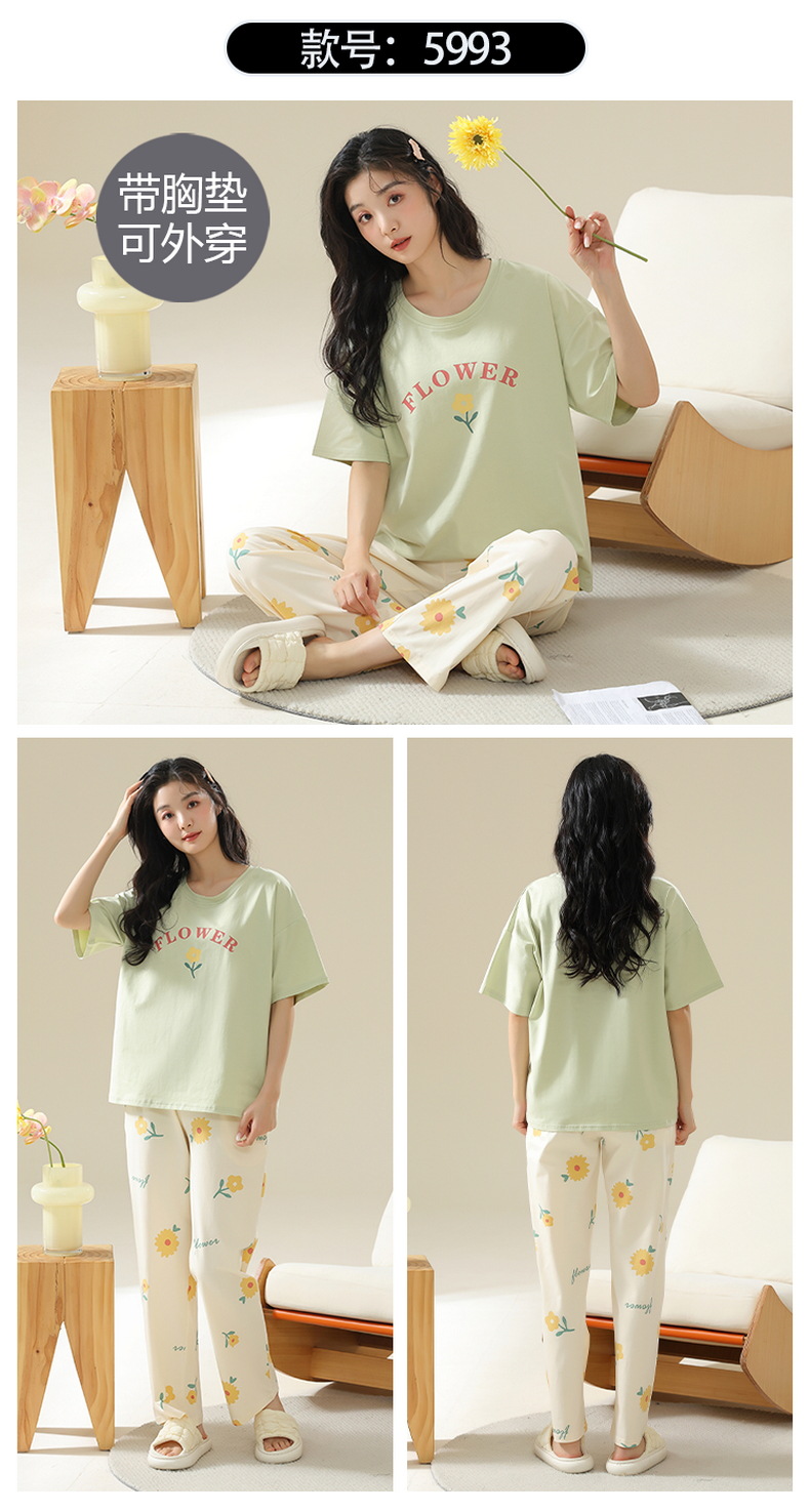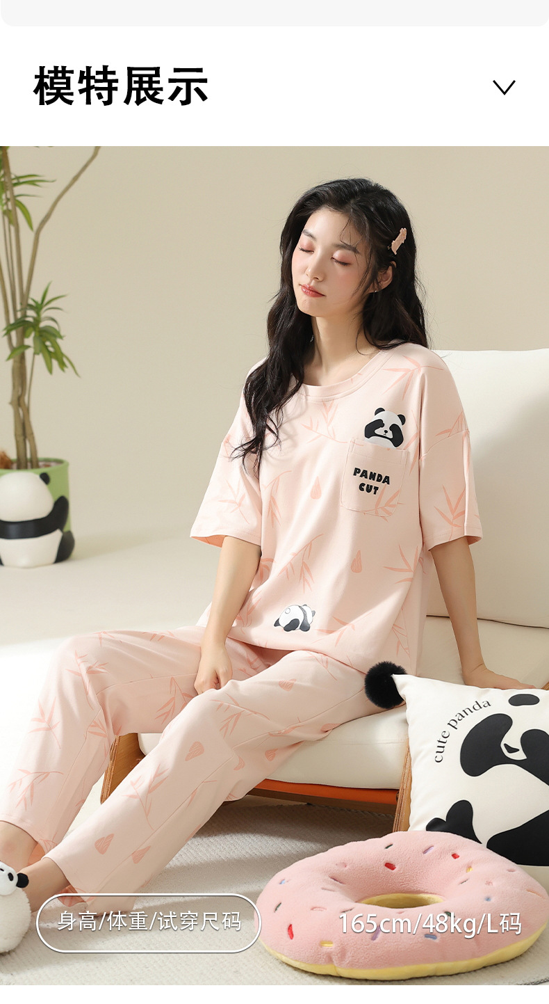 【自带无感Bra 贴身舒适 防凸点外穿不尴尬】2024夏季新款带胸垫睡衣 女棉质短袖长裤 可外穿薄款 女士家居服-QQ
