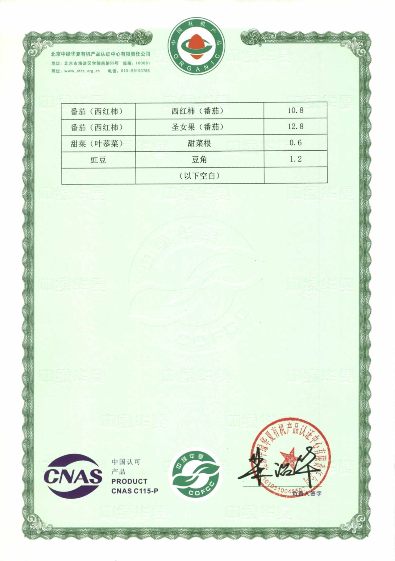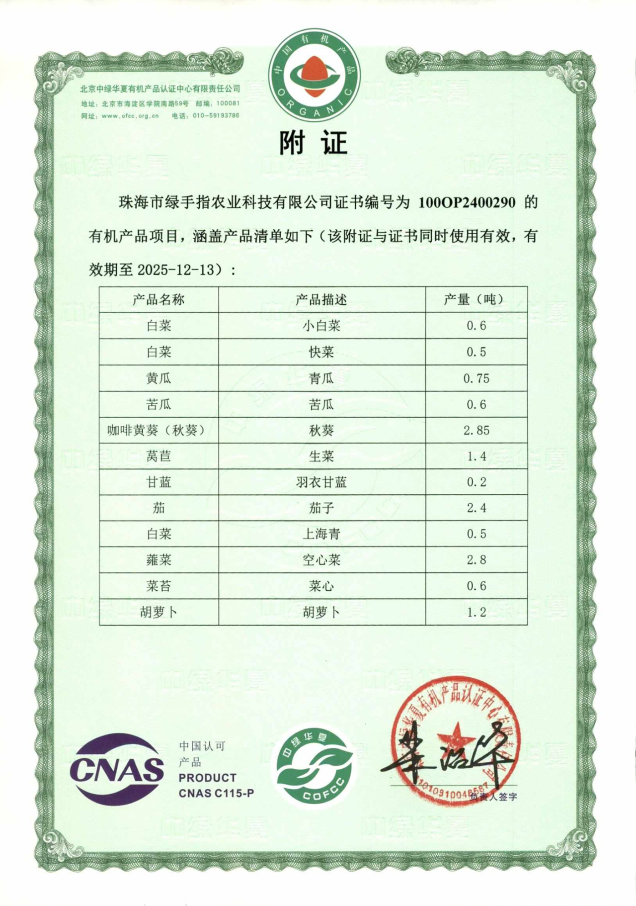 珠海基地的有机认证证书