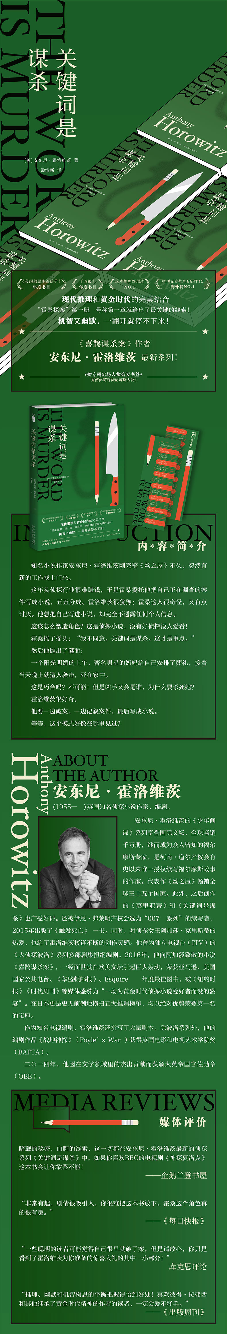 一九七七年,霍洛维茨毕业于约克大学英国文学与艺术史专业。之后他果然朝着作家之路迈进:先以《少年间谍》系列享誉国际文坛,全球畅销千万册,继而成为众人皆知的福尔摩斯专家,是柯南˙道尔产权会有史以来唯一授权续写福尔摩斯故事的作家。代表作《丝之屋》畅销全球三十五个国家。此外,之后创作的《莫里亚蒂》和《关键词是谋杀》也广受好评。还被伊恩˙弗莱明产权会选为"007 系列"的续写者,二○一五年出版了《触发死亡》 一书。同时,对侦探女王阿加莎˙克里斯蒂的热爱,也给了霍洛维茨接连不断的创作灵感。他曾为独立电视台(ITV)的《大侦探波洛》系列多部剧集担纲编剧。二○一六年,他向阿加莎致敬的小说《喜鹊谋杀案》,一经面世就在欧美文坛引起巨大轰动,荣获亚马逊、美国国家公共电台、《华盛顿邮报》、Esquire 年度最佳图书,被《纽约时报》《时代周刊》等媒体盛赞为"一场为黄金时代侦探小说爱好者而设的盛宴"。在日本更是shi无前例地横扫五大推理榜单,均以绝对优势荣登第一名的宝座。