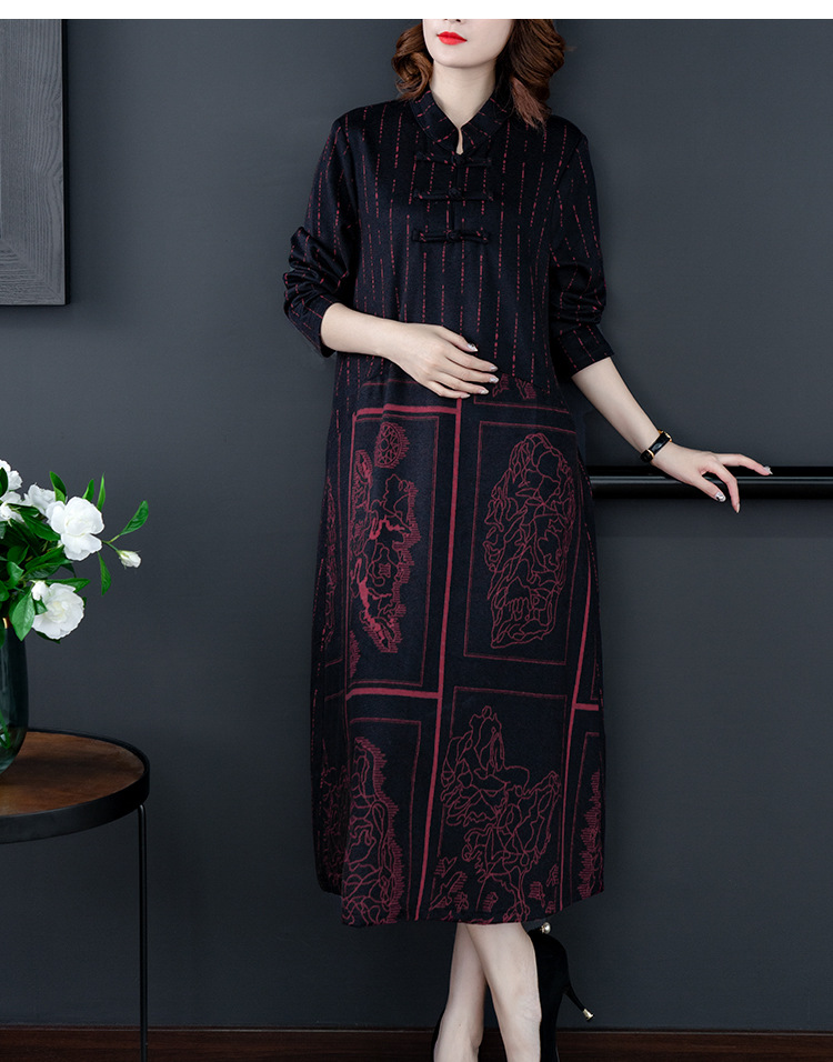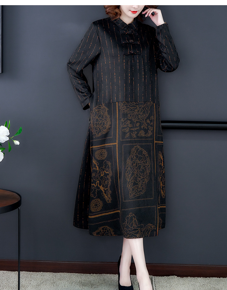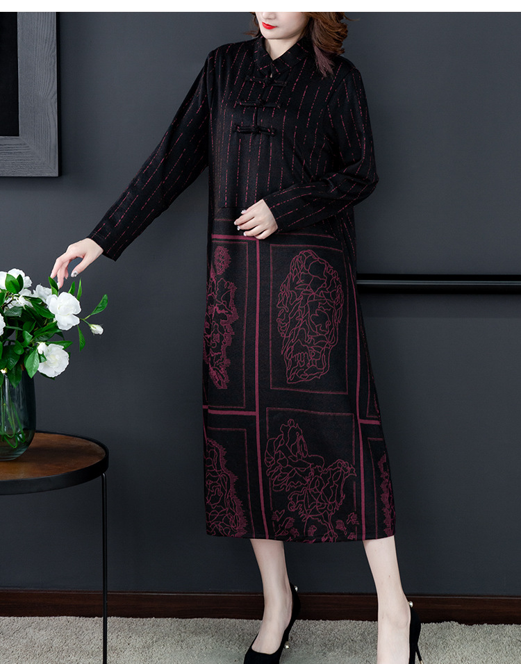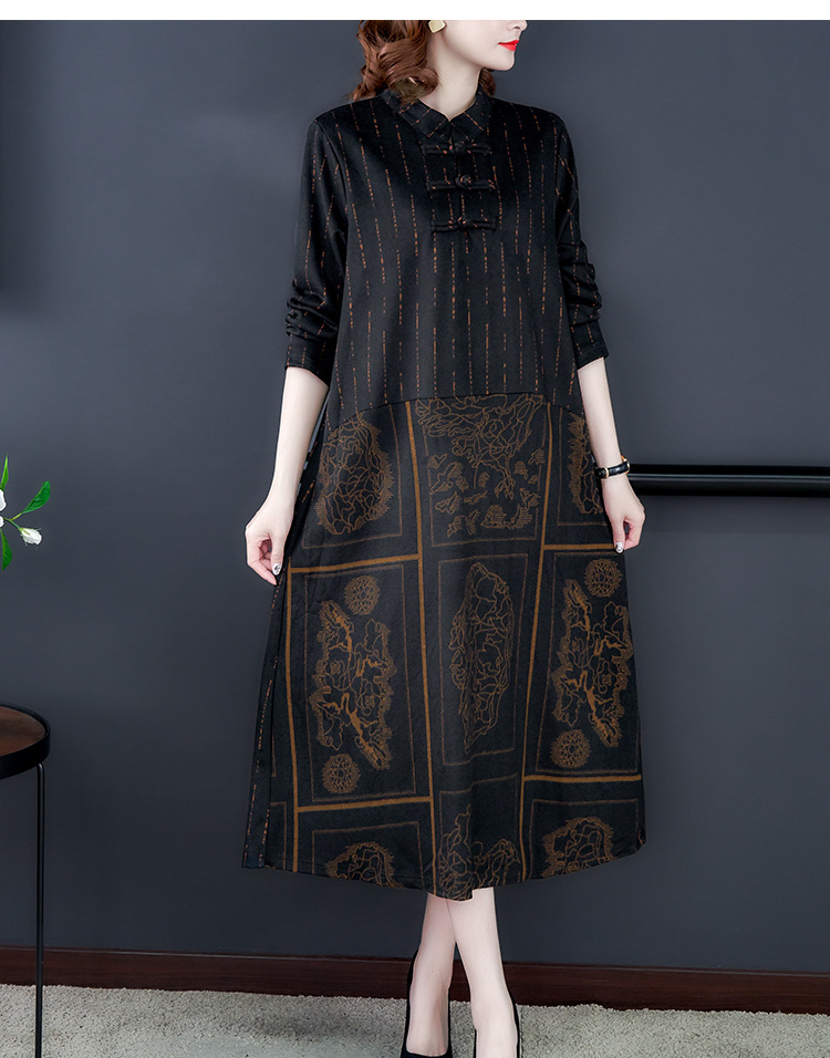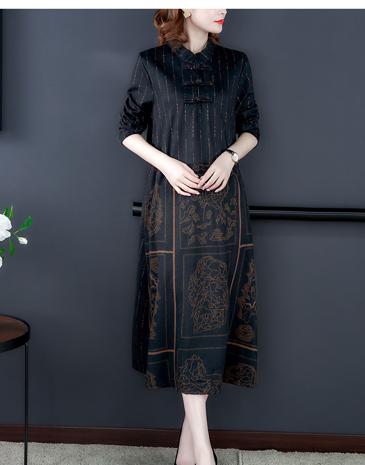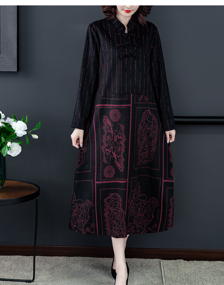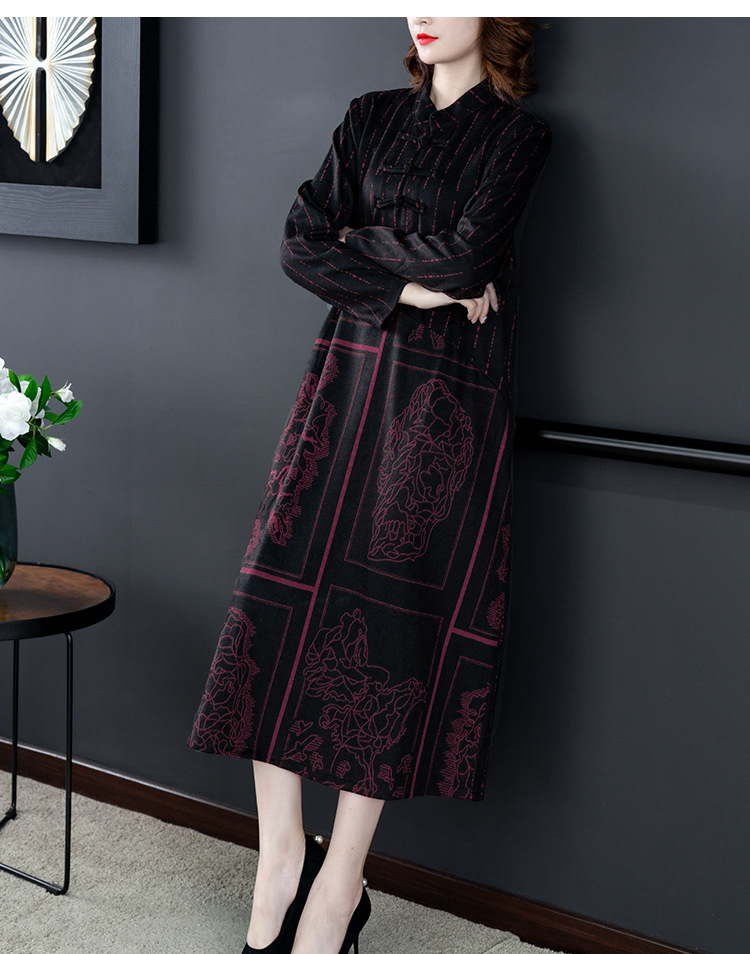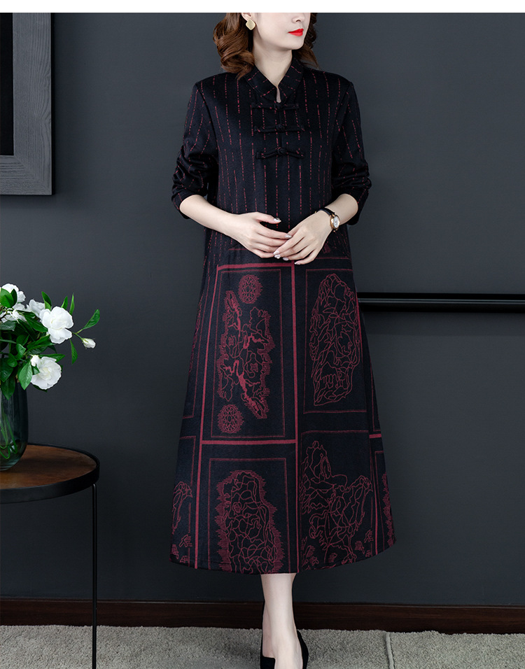 AHM-aswy1959秋冬新款宽松大码复古盘扣羊绒印花连衣裙民族风长裙