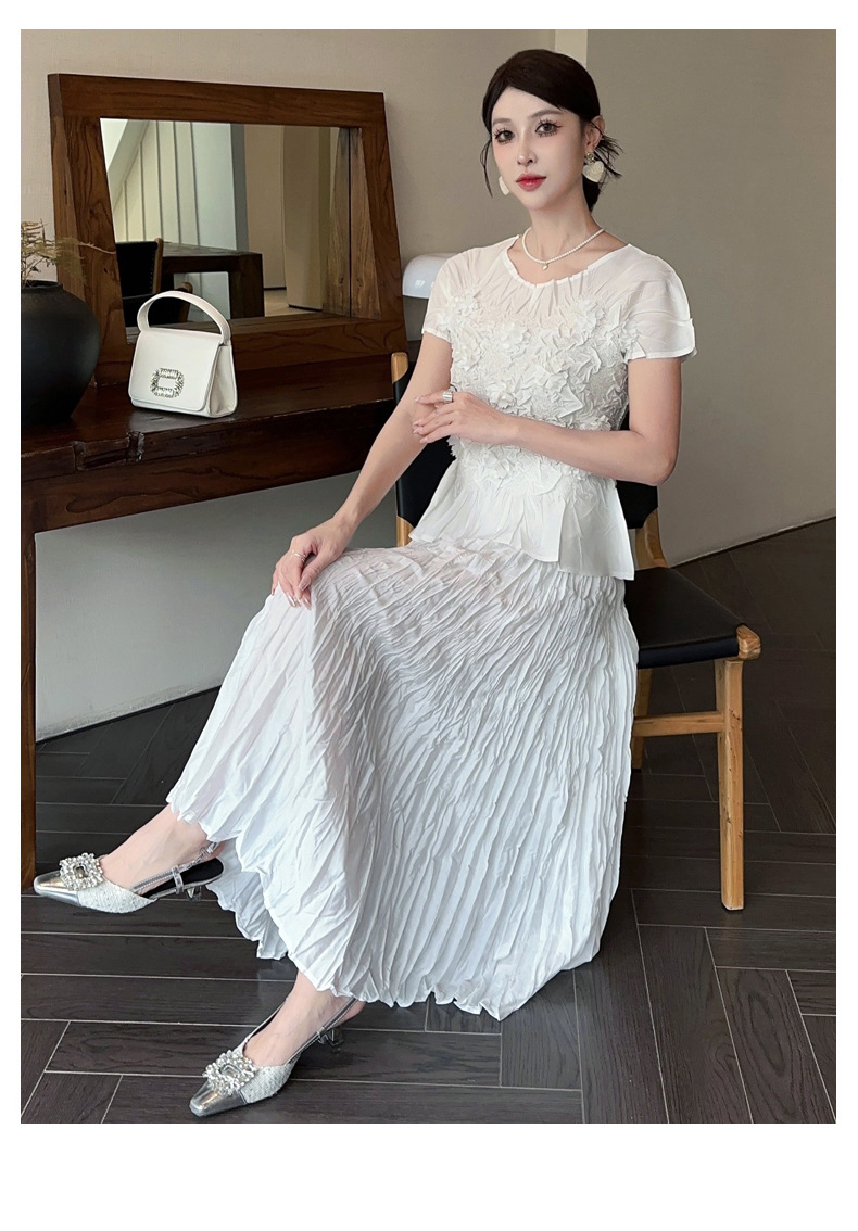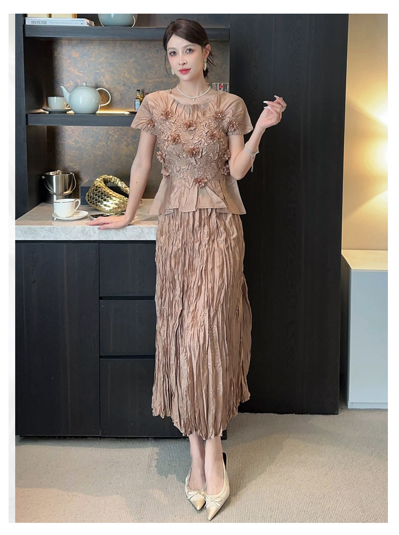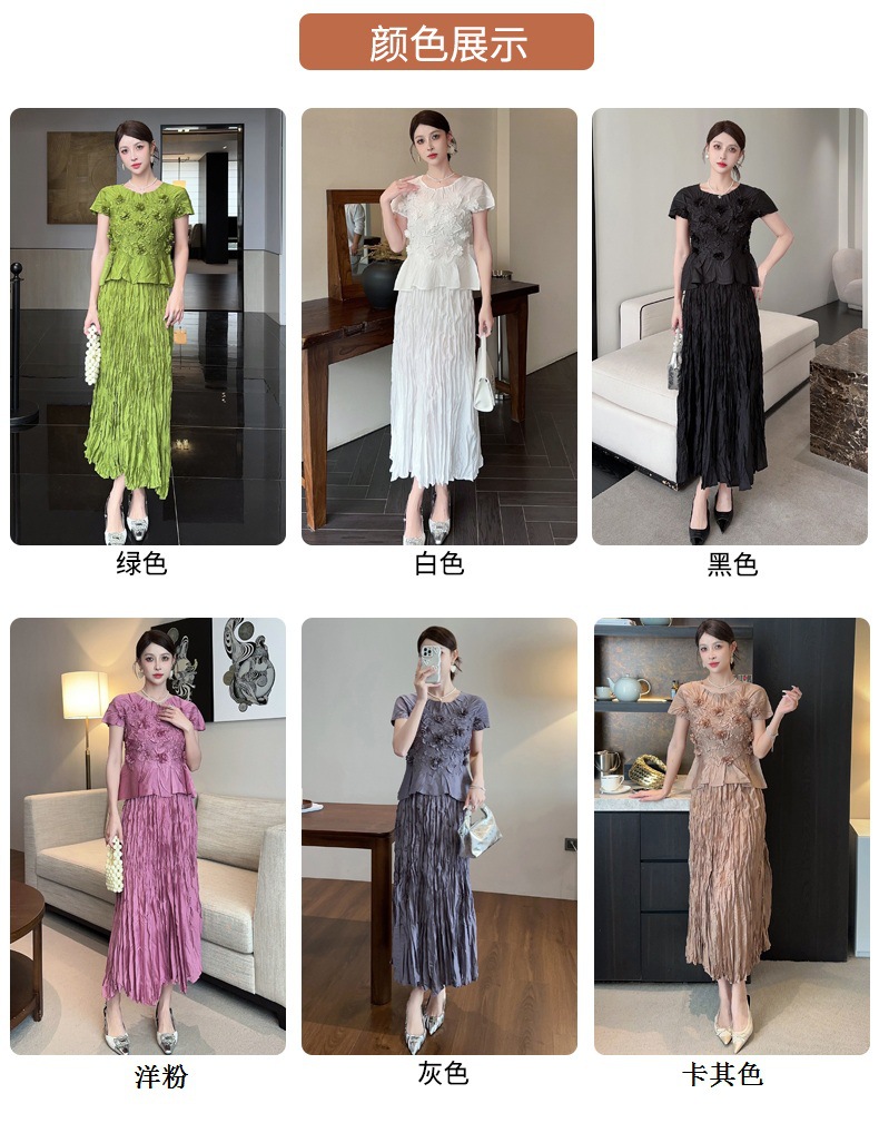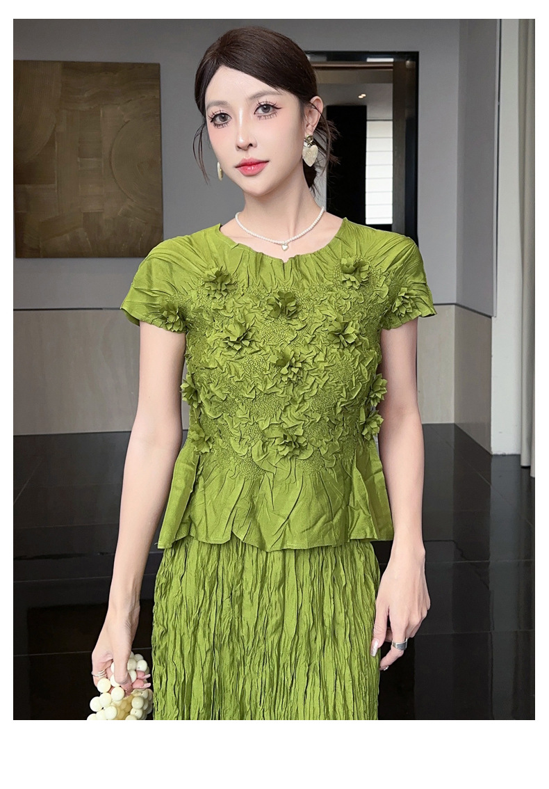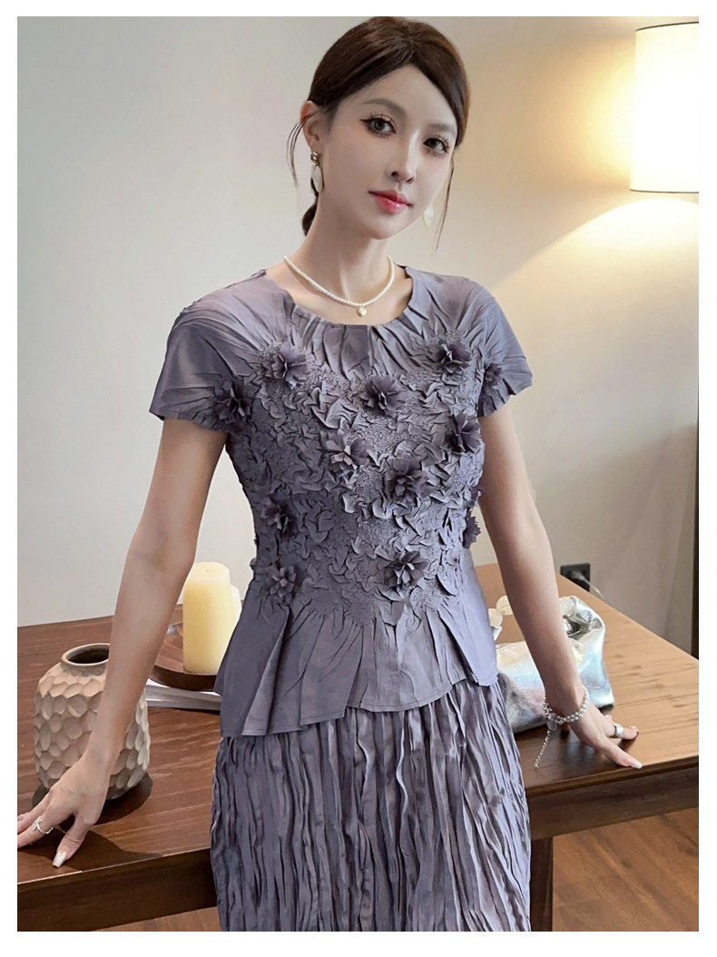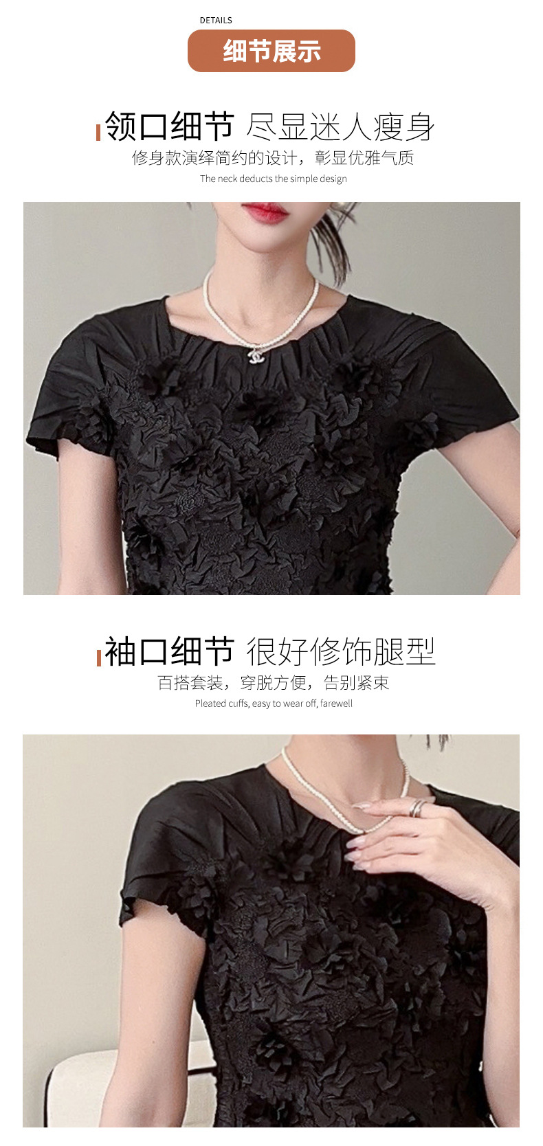 雀说小众设计感褶皱套装女手工褶绣花短袖上衣弹力T恤时尚百搭两件套AL2054