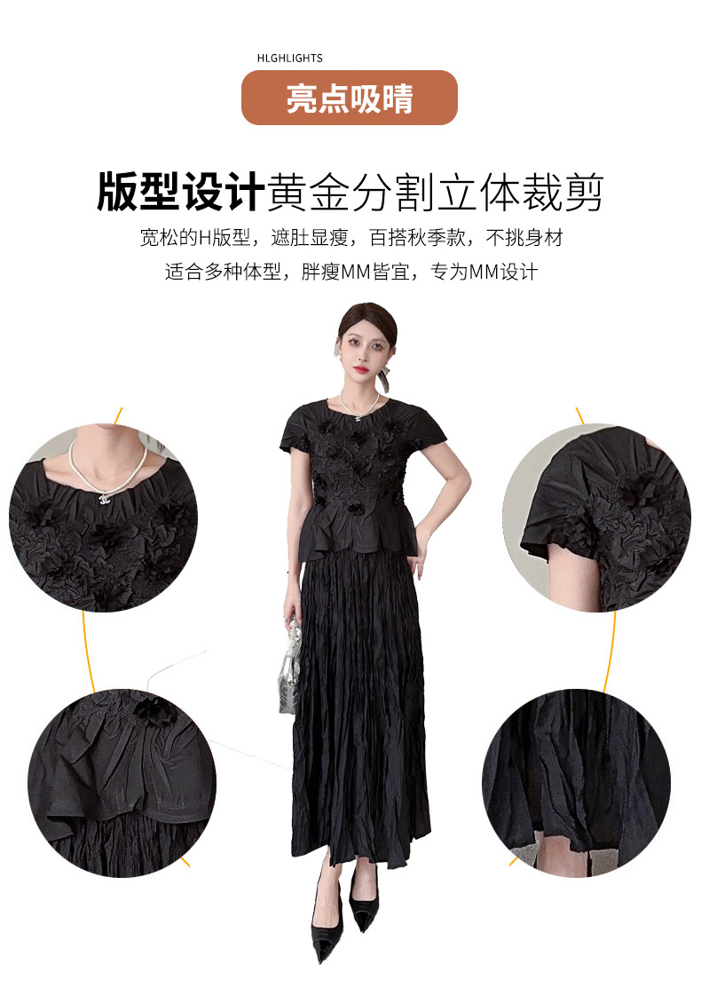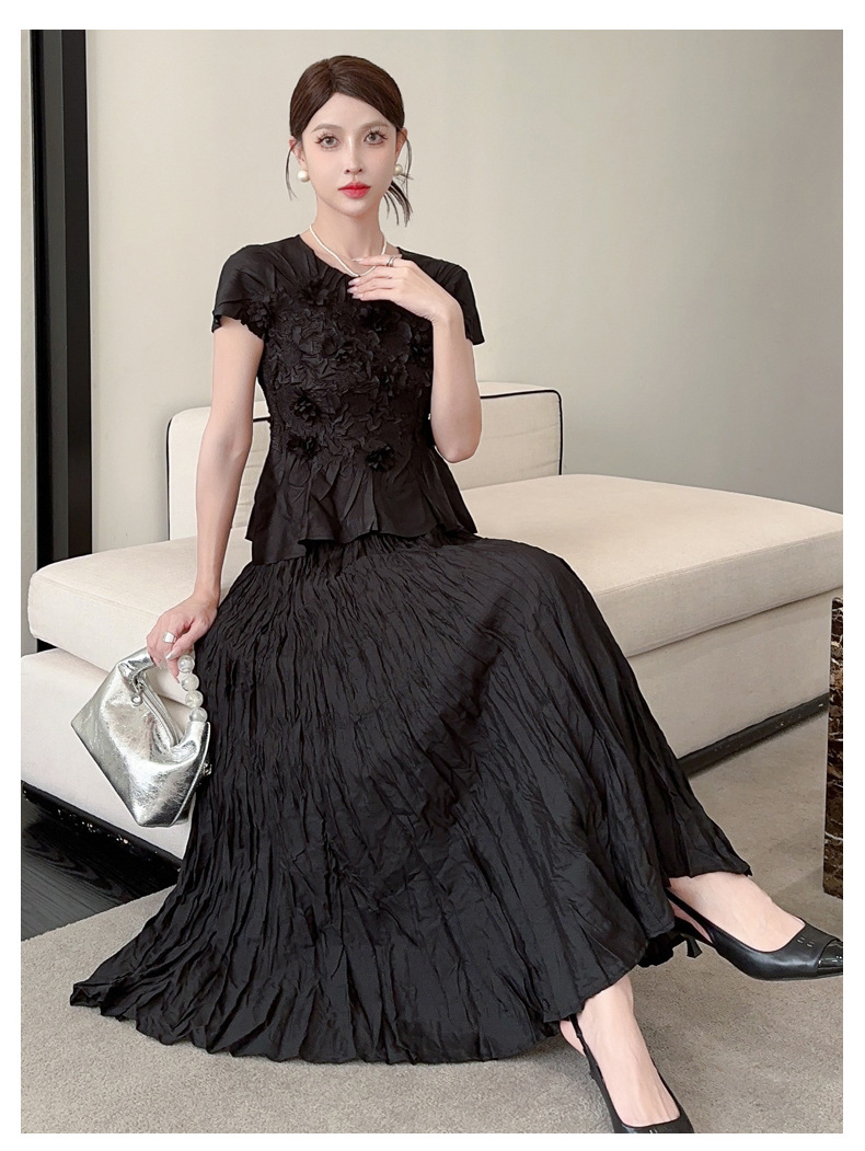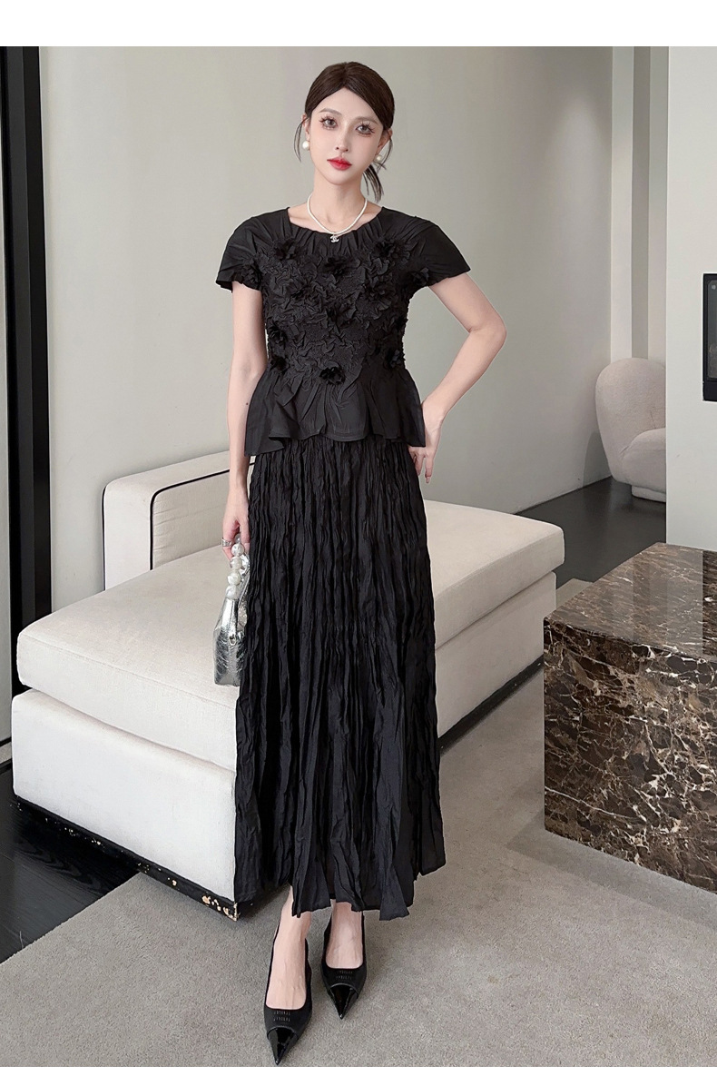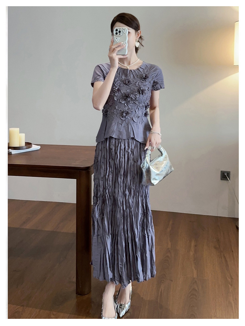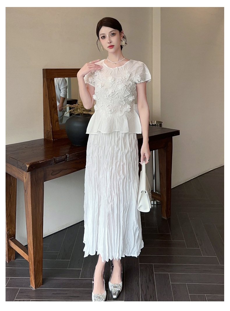 雀说小众设计感褶皱套装女手工褶绣花短袖上衣弹力T恤时尚百搭两件套AL2054